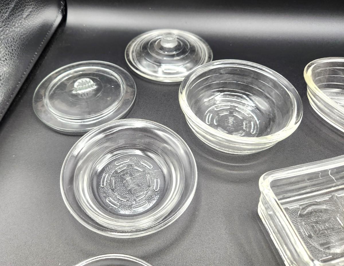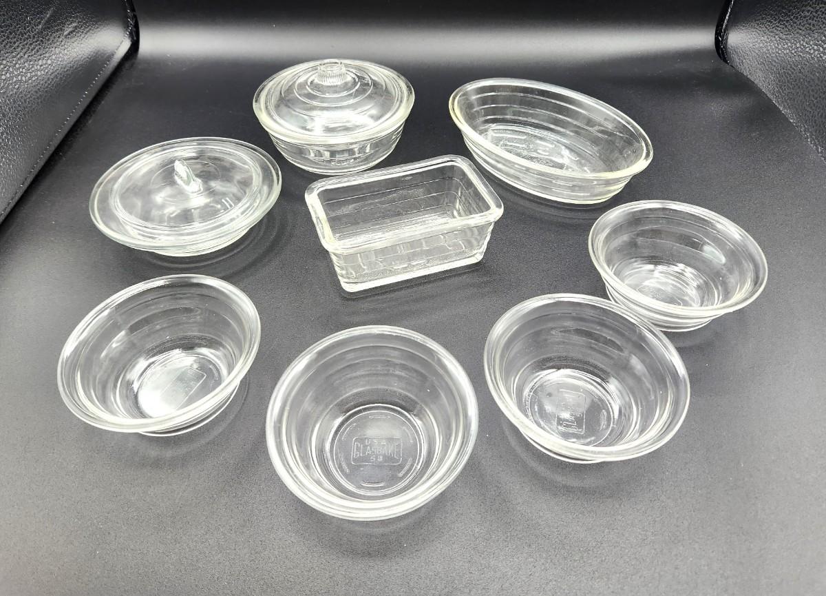 Scarce - 8 pieces, all in good condition - Glassbake, 1930's-40's - all from the Betty Jane LIttle Princess Baking set - back in the days when all little girls longed to be Suzy Homemaker. For scale, the Loaf Pan is 4.5" long and 1.5" tall, and the larger covered dish is 5" across and 2" tall.