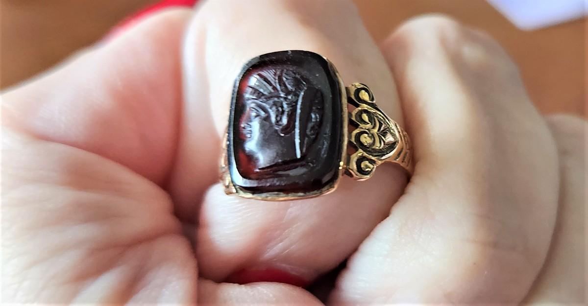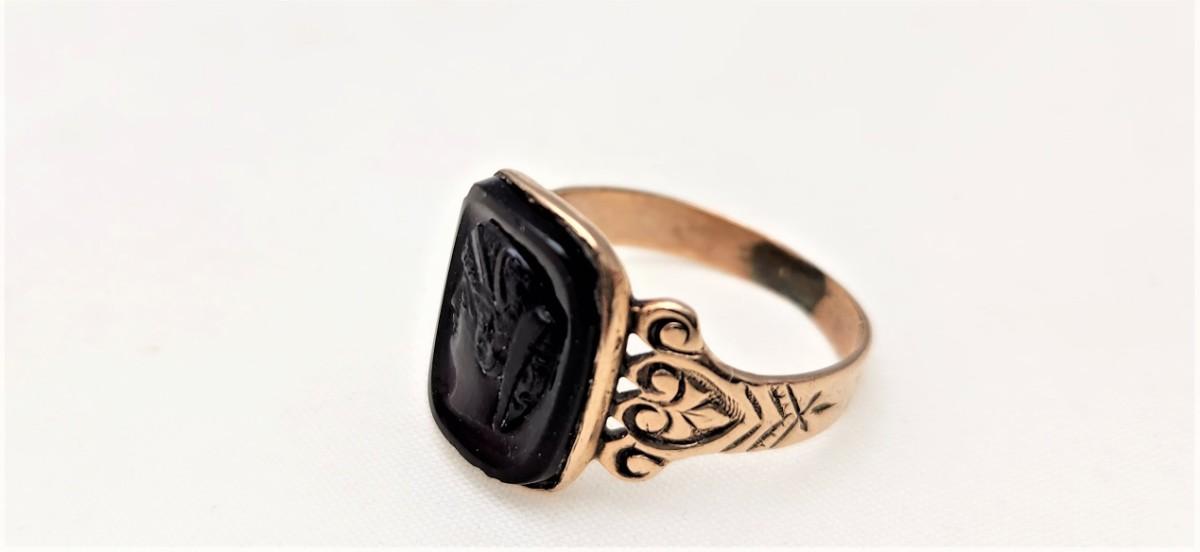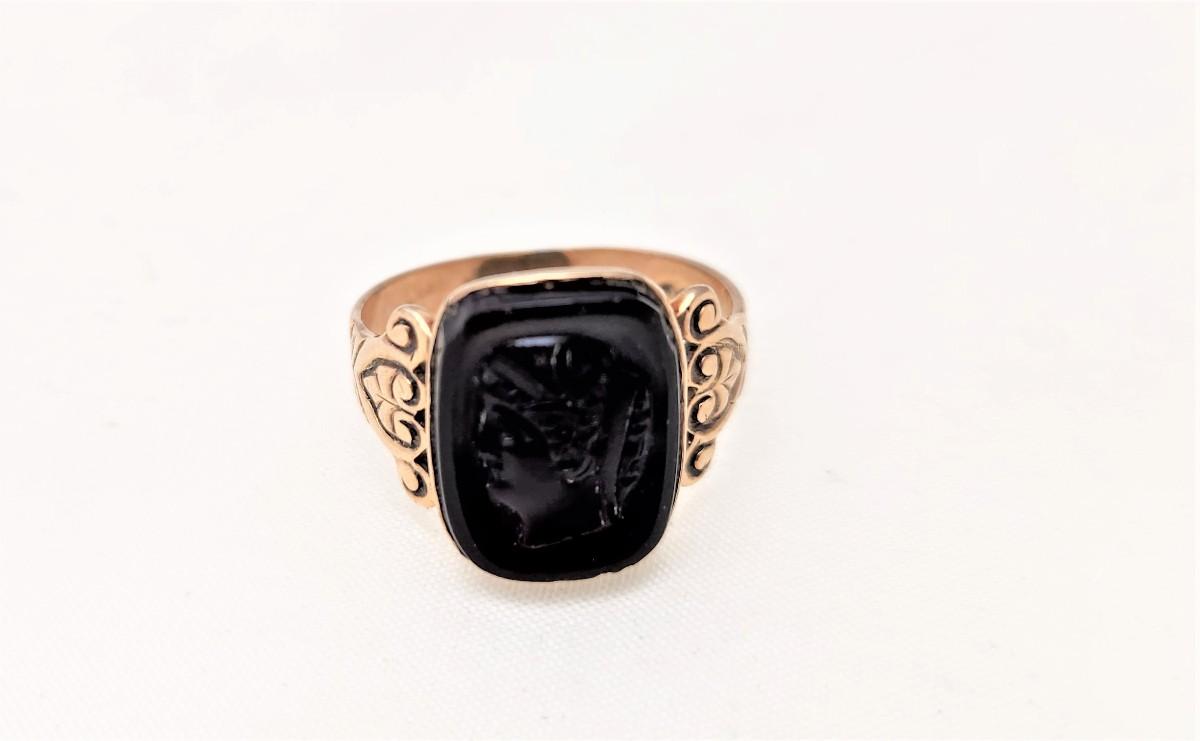 Natural stone - likely onyx - 9 ct gold ring, ca. 1890. Size 7. This ring has 75.00 of scrap gold in it. All jewelry is being sold AS jewelry and not for scrap price. We have buyers who will pay the opening bid on each jewelry item, so note - opening bids will not be reduced on these items.