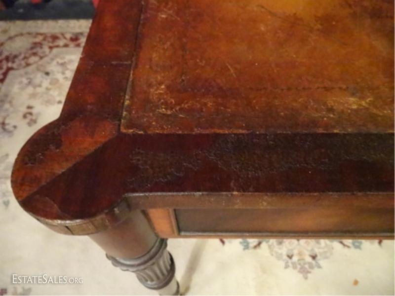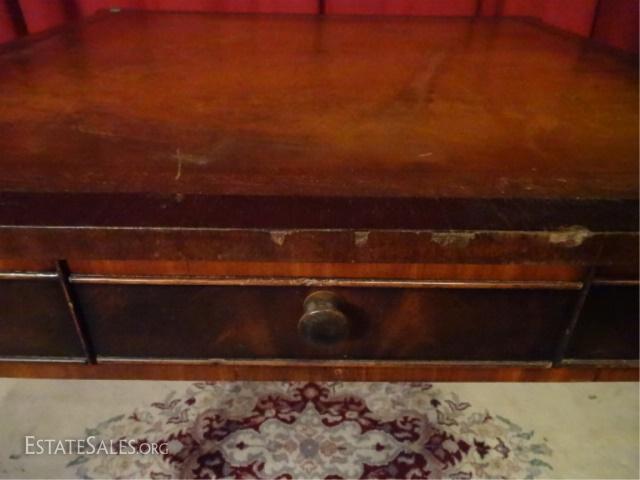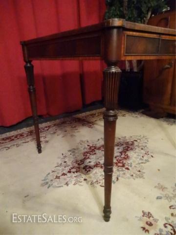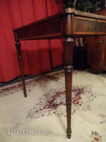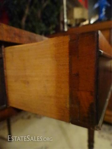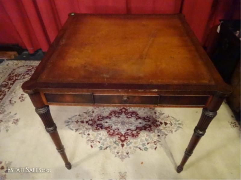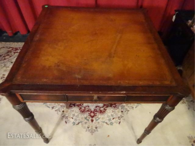 LOT 111: ANTIQUE LOUIS XVI STYLE GAME TABLE, LATE 19TH C. OR EARLY 20TH C., EMBOSSED LEATHER TOP, 2 DRAWERS WITH DOVETAIL JOINTS, VERY GOOD VINTAGE CONDITION COMMENSURATE WITH AGE AND USE, 31"W X 31"D X 30"H SKU128.12