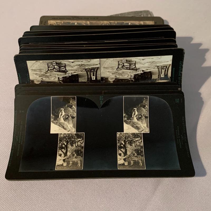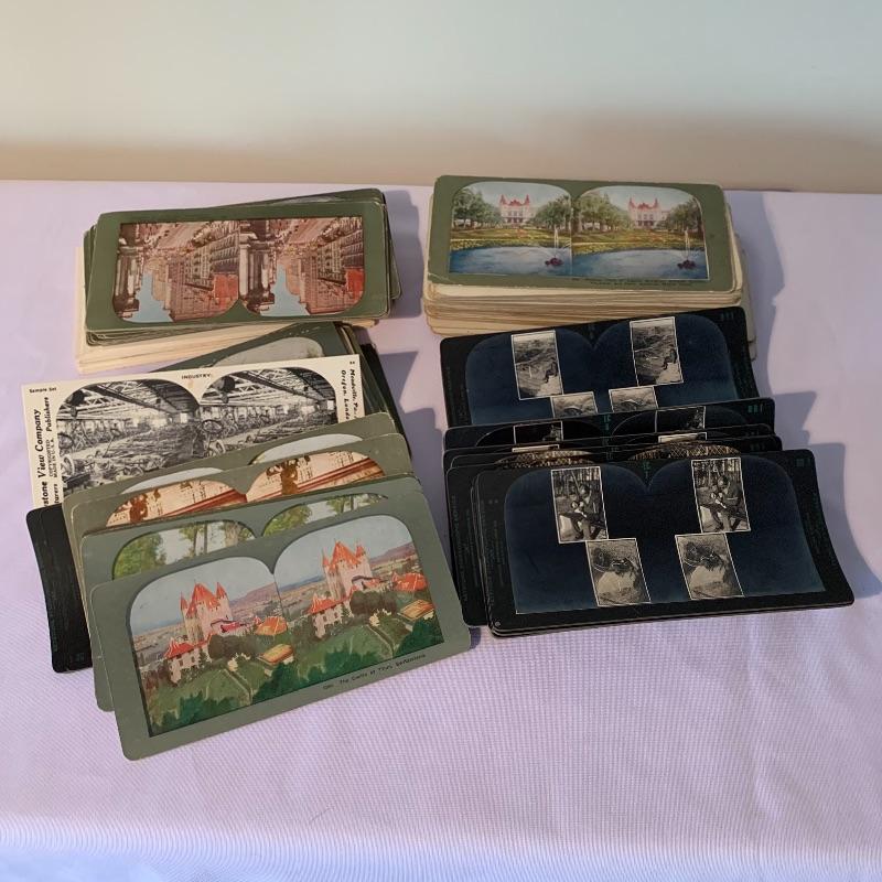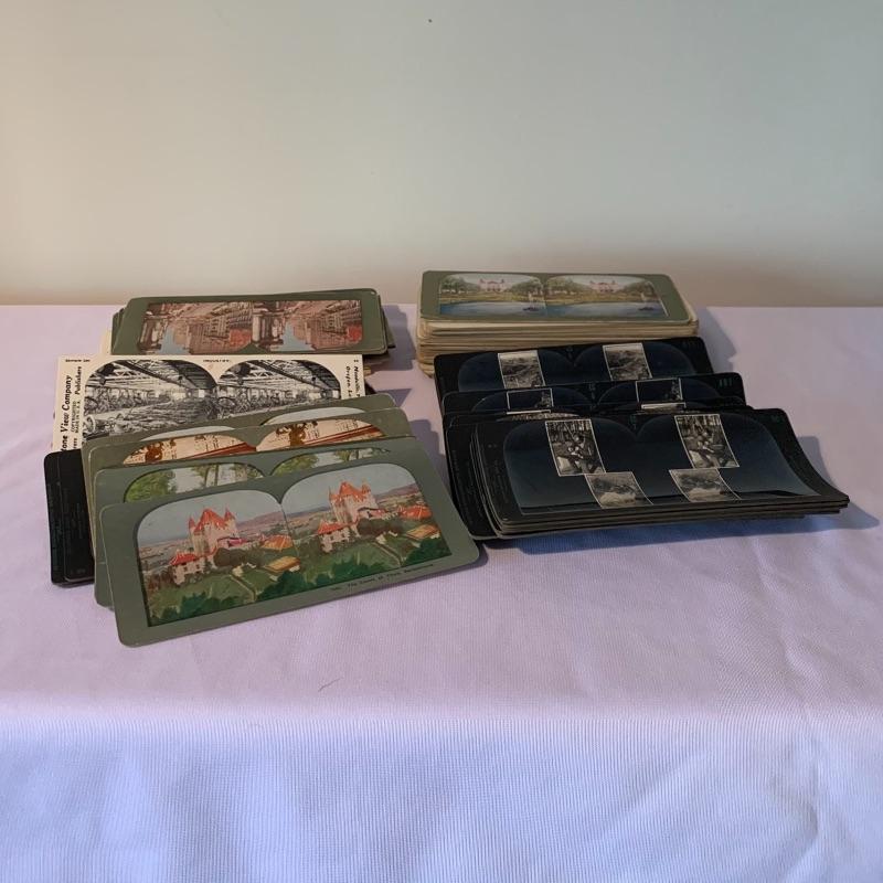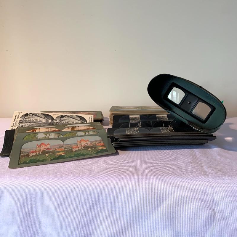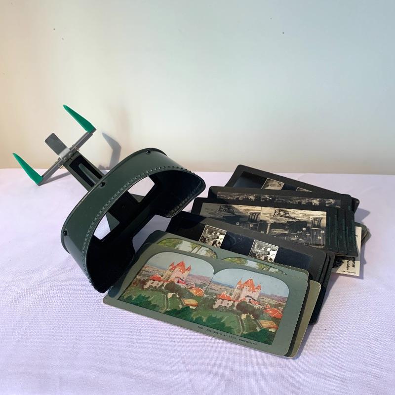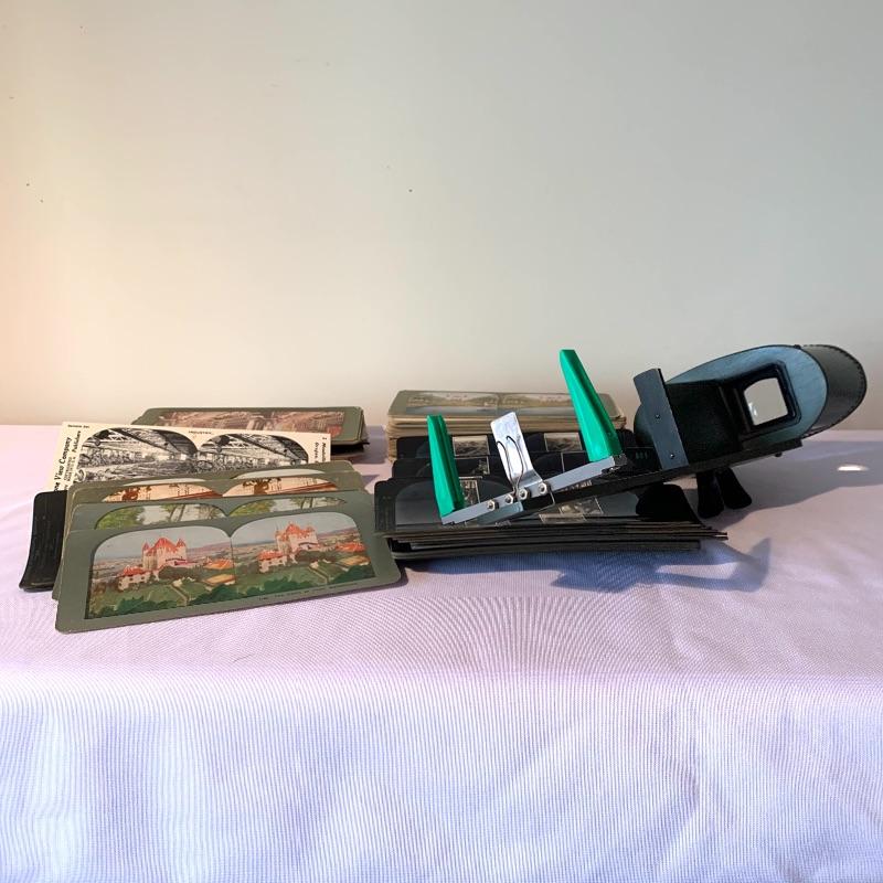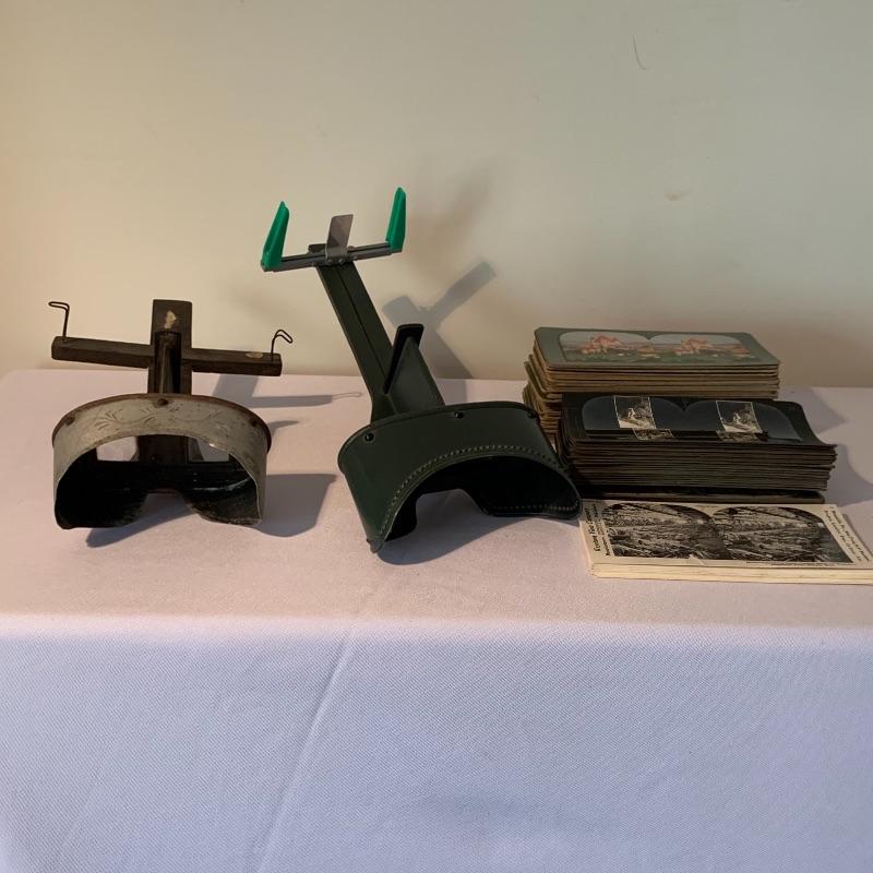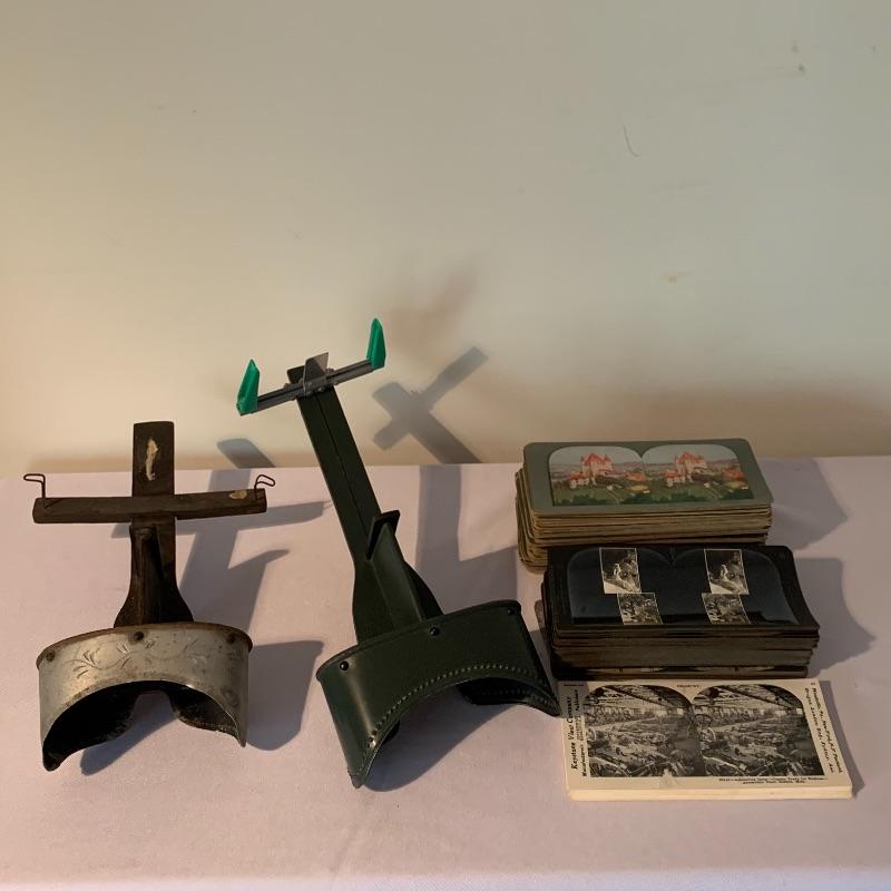 Take a fun trip to the past with these two antique stereoscope stereo viewers. Lot comes with many black & white as well as color stereographs. Stereoscopes are both made with a wooden base. One has a green plastic eye piece and the other has a metal eye piece. Stereographs feature images from WWI, the Old West, all around the USA, Canada, and many beautiful scenes around the world! Some stereographs are printed with the name Keystone View Company Studios & Factory and say that they are made in the USA. Shipping available.