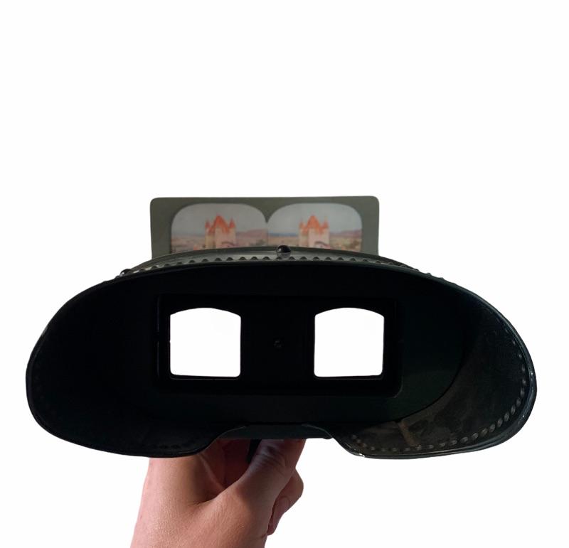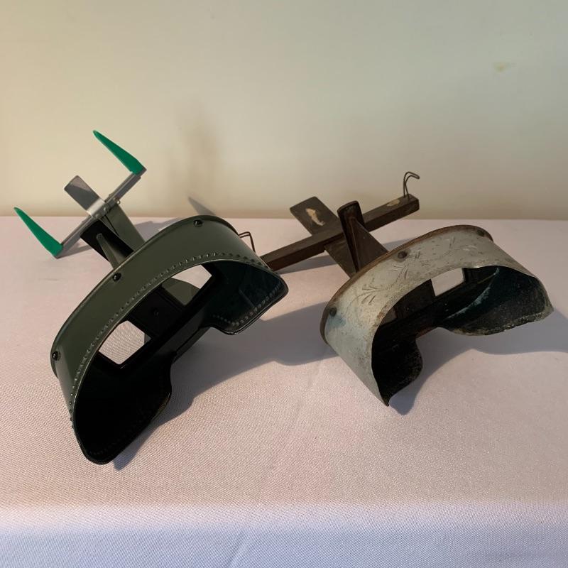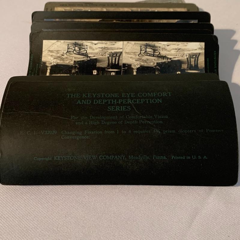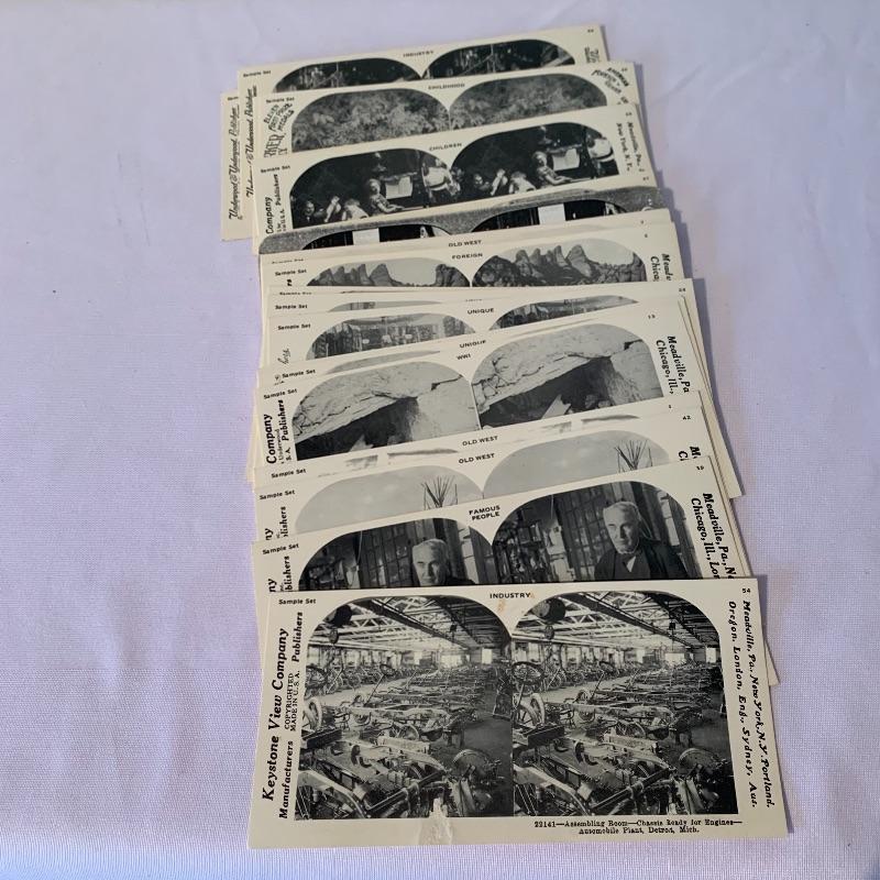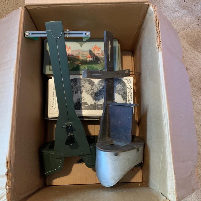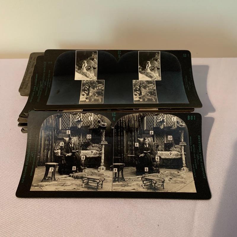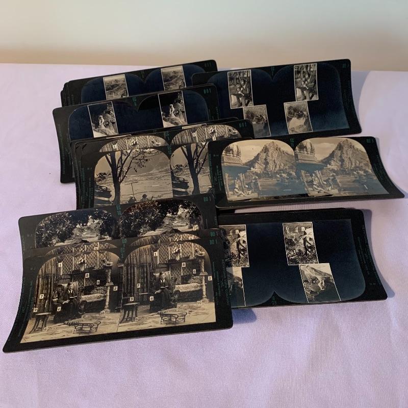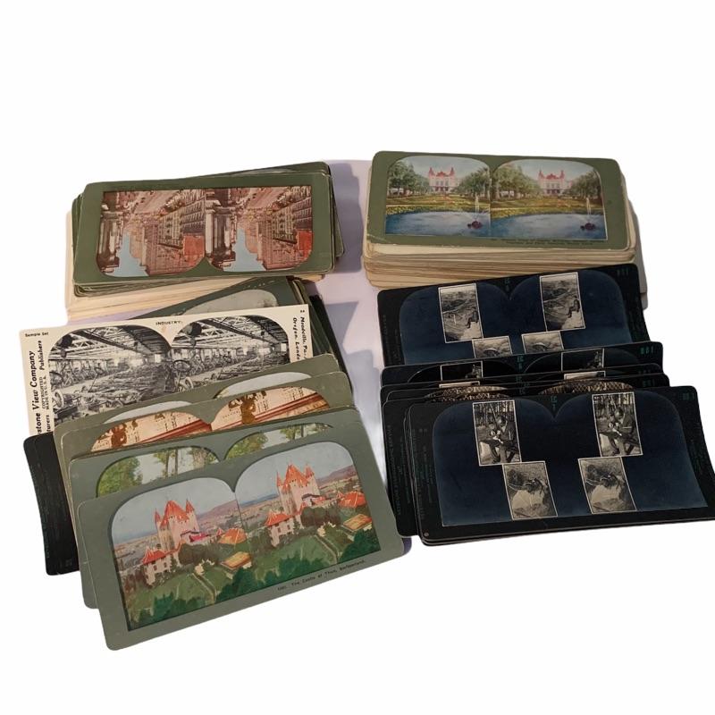 Take a fun trip to the past with these two antique stereoscope stereo viewers. Lot comes with many black & white as well as color stereographs. Stereoscopes are both made with a wooden base. One has a green plastic eye piece and the other has a metal eye piece. Stereographs feature images from WWI, the Old West, all around the USA, Canada, and many beautiful scenes around the world! Some stereographs are printed with the name Keystone View Company Studios & Factory and say that they are made in the USA. Shipping available.