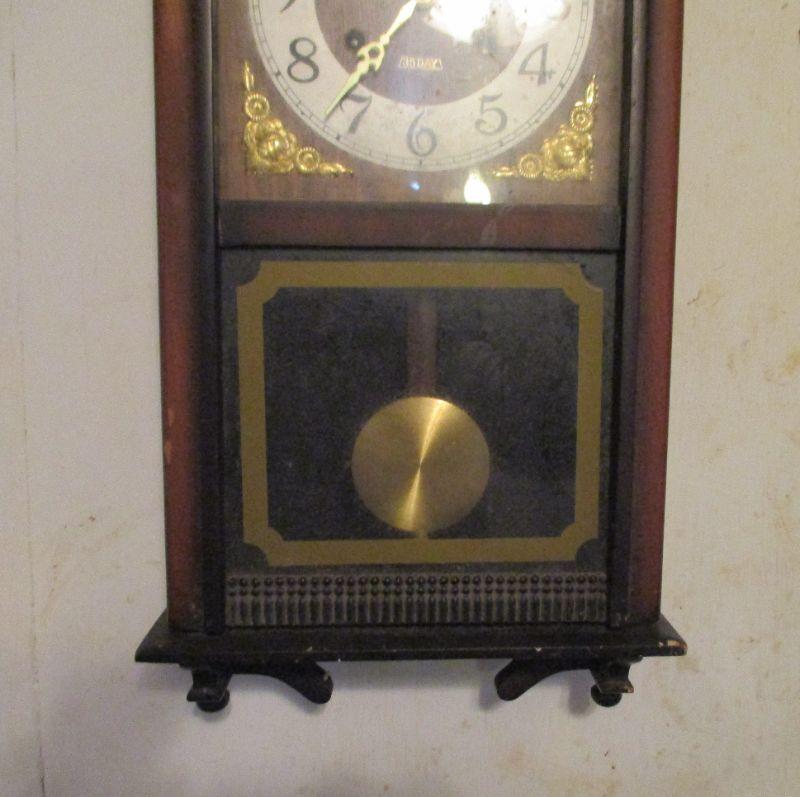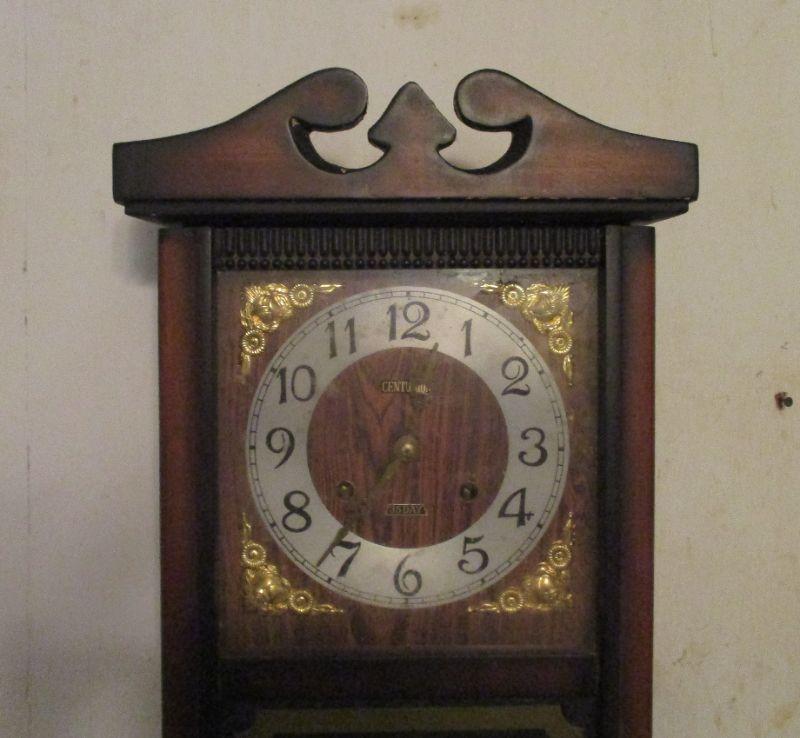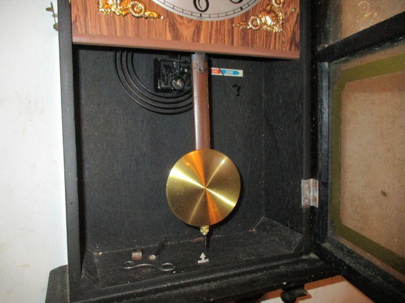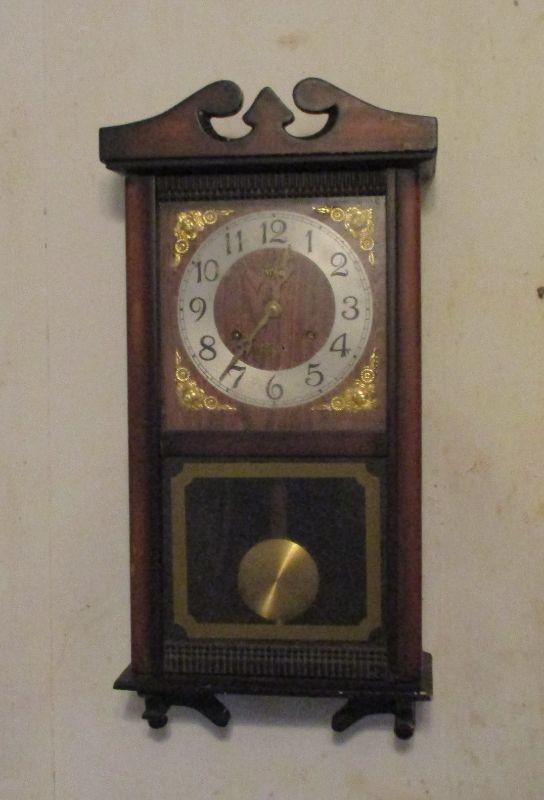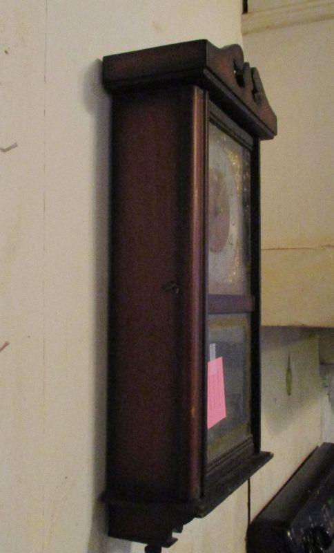 This is a nice wood case pendulum wall clock that seems to have all of it's pieces (including the key) and tries to work. I say try because it runs for a couple of minutes and then stops. I think that it just needs a quick trip to the clock doctor to get the balances and winding mechanisms cleaned. It is 24.5" x 11.5".