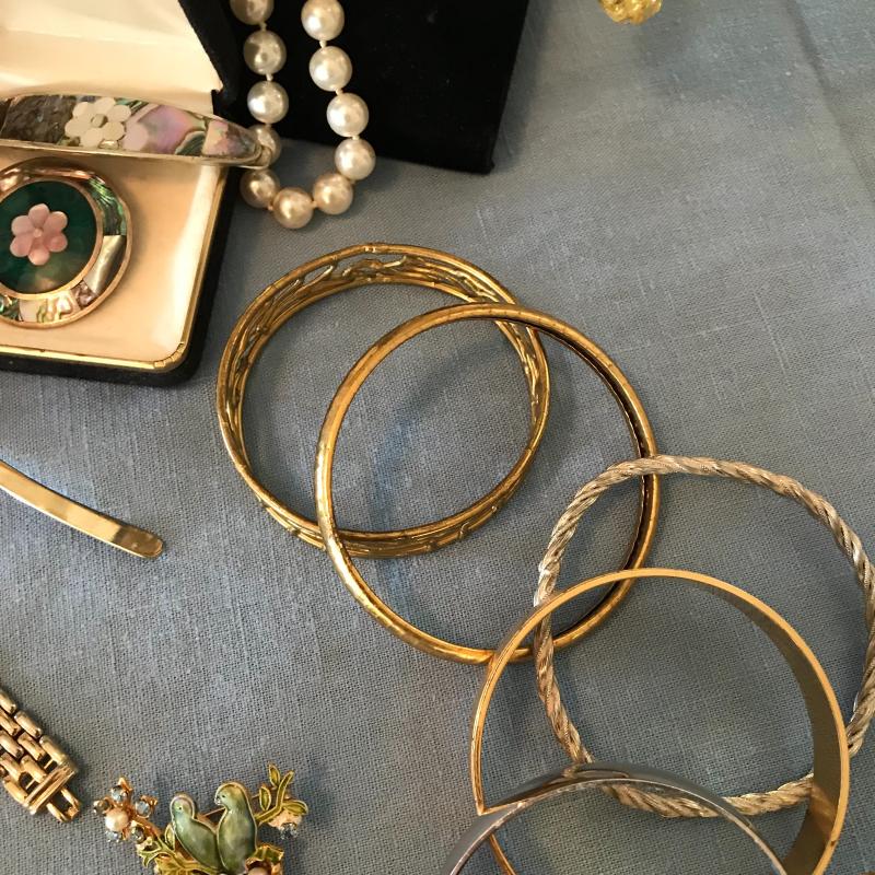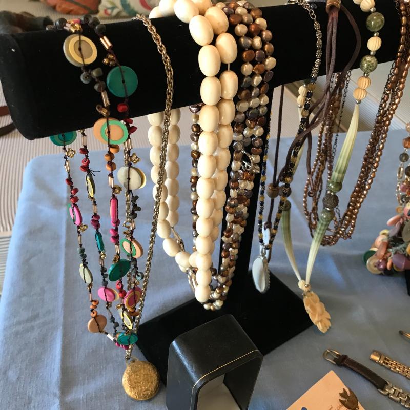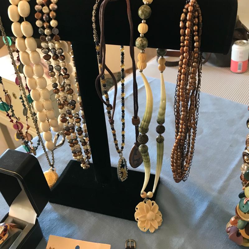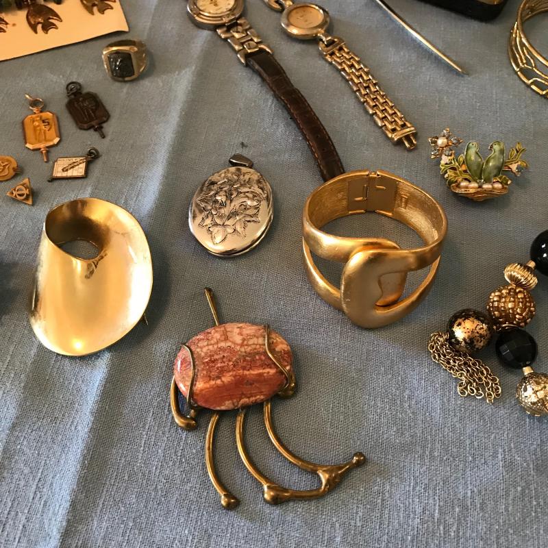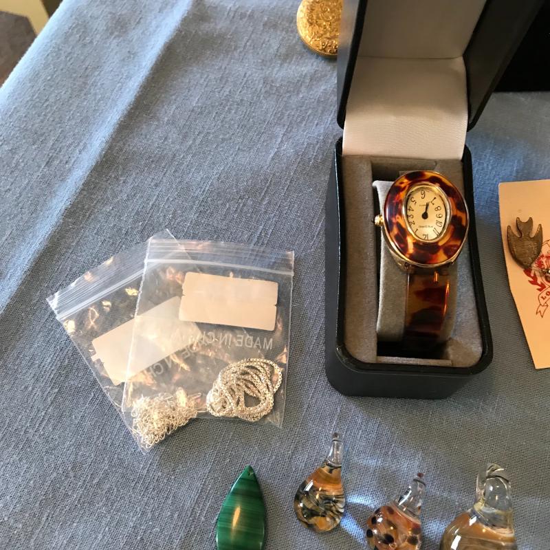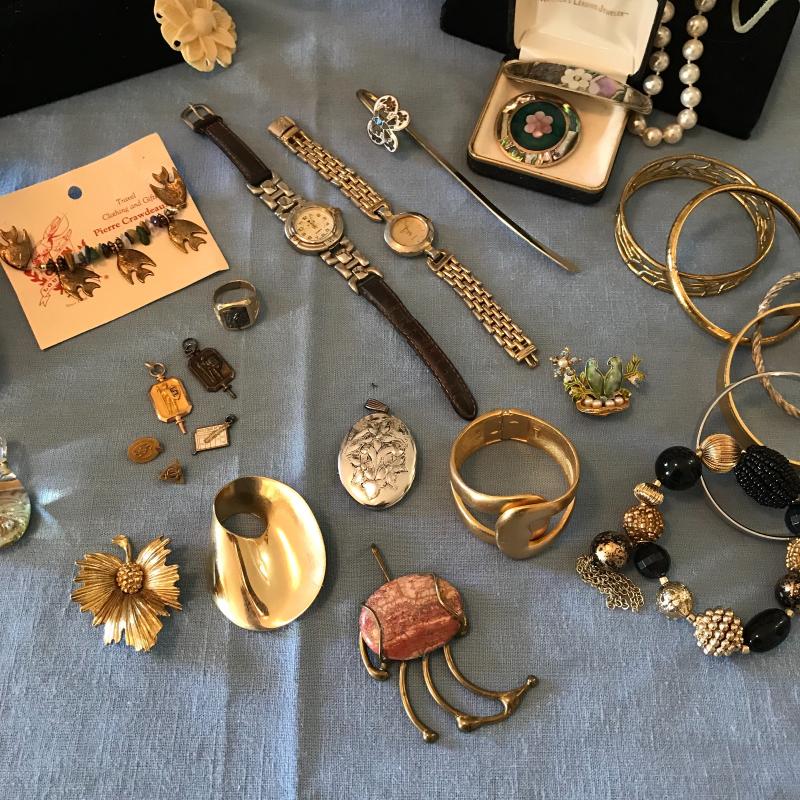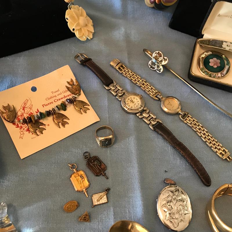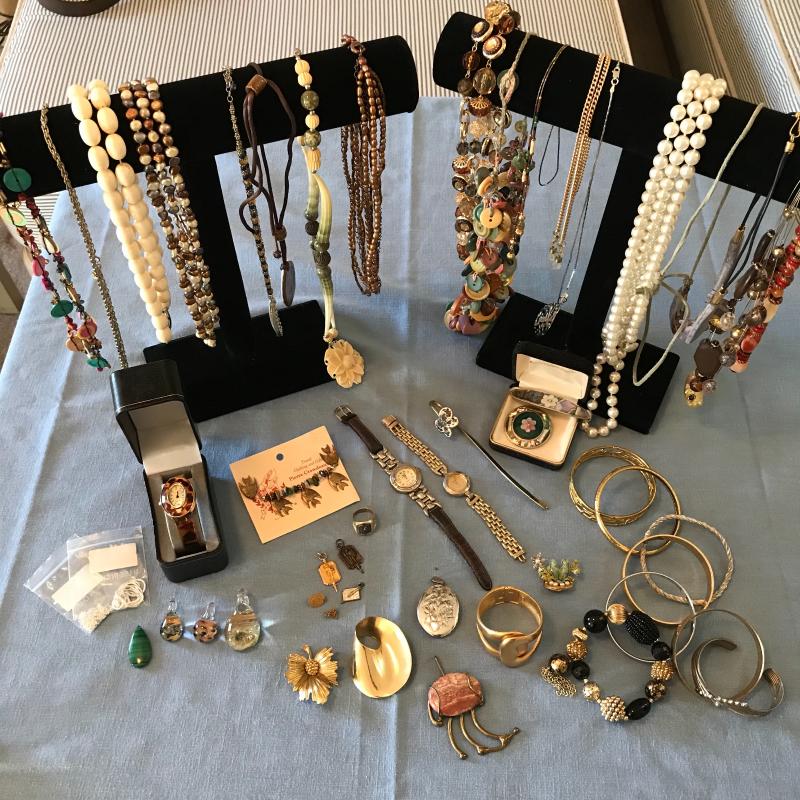 This large lot of costume jewelry includes a vintage “Lassie” ring, necklaces, bracelets, broaches, watches, pins, a locket, blown glass pendants, and more. See pics for details.