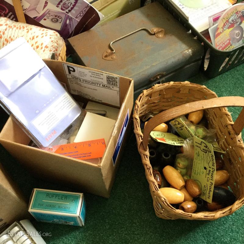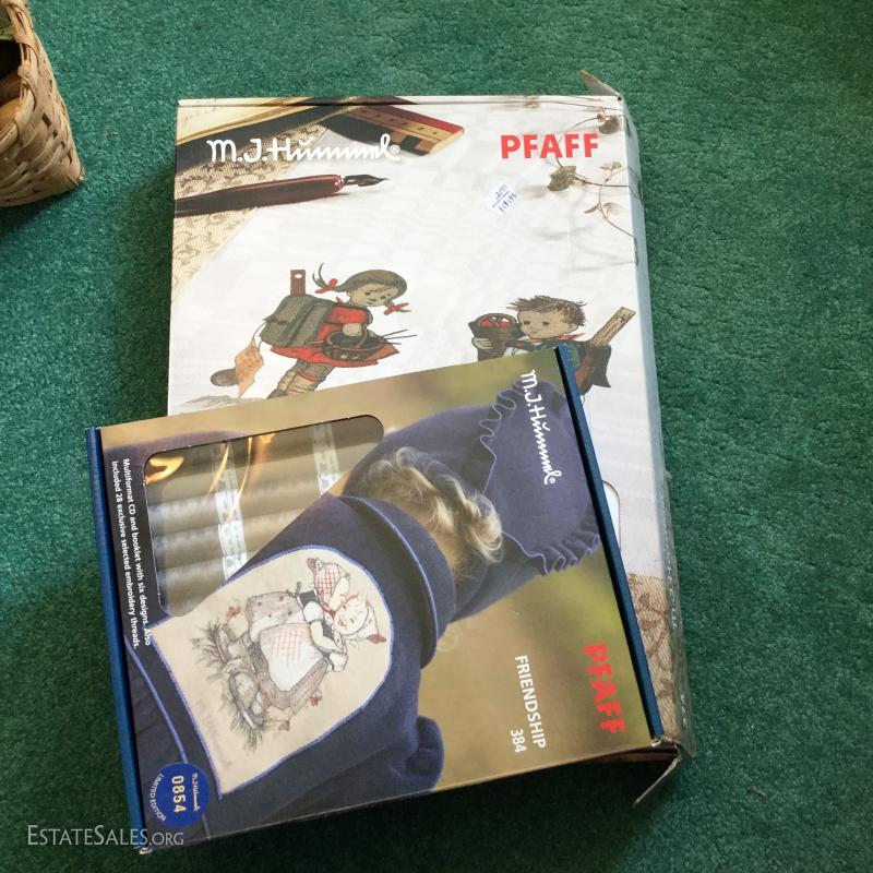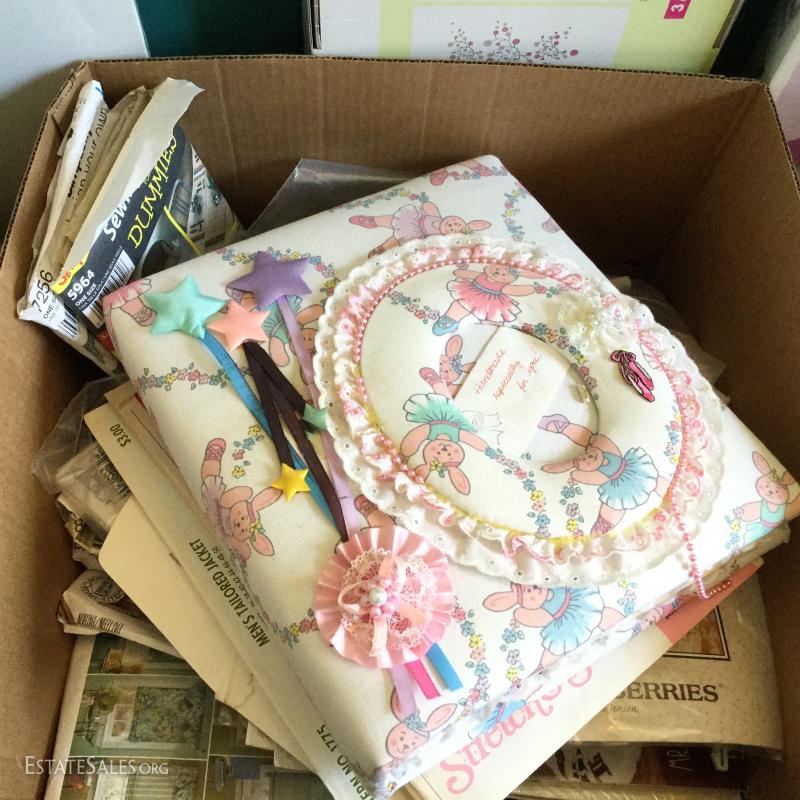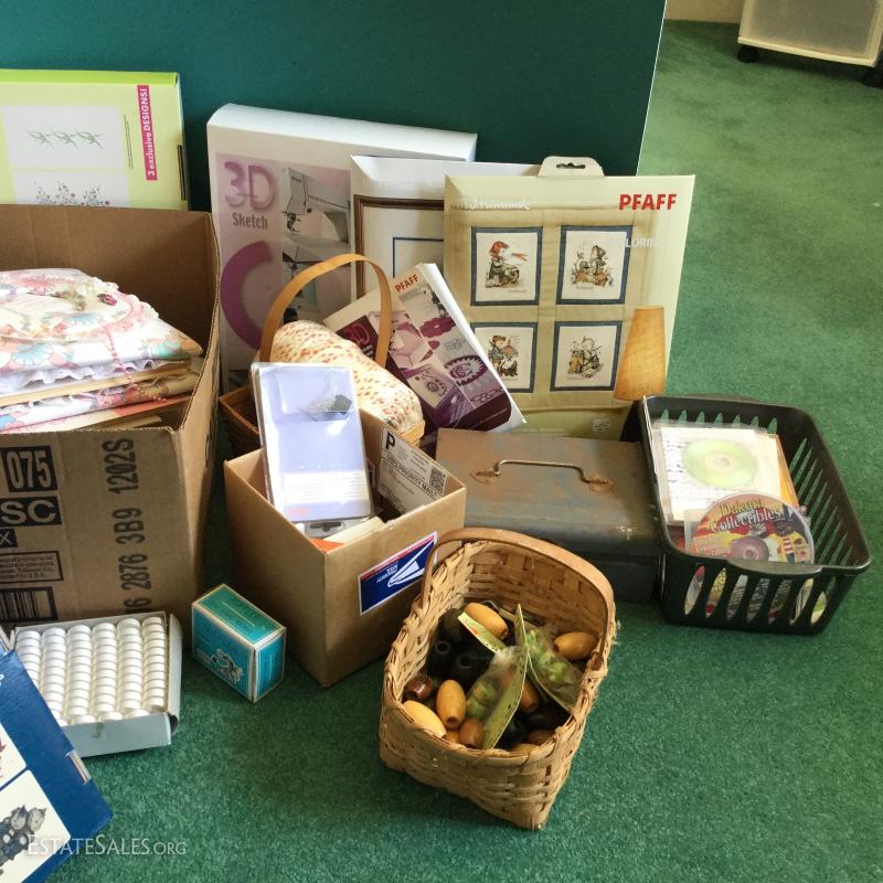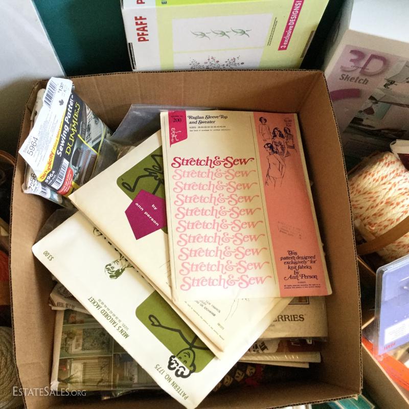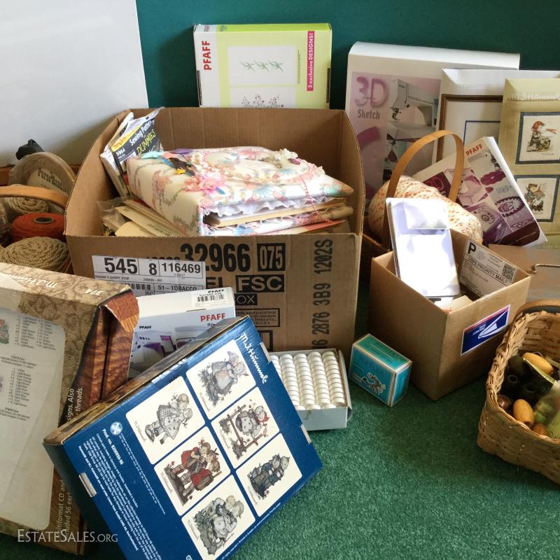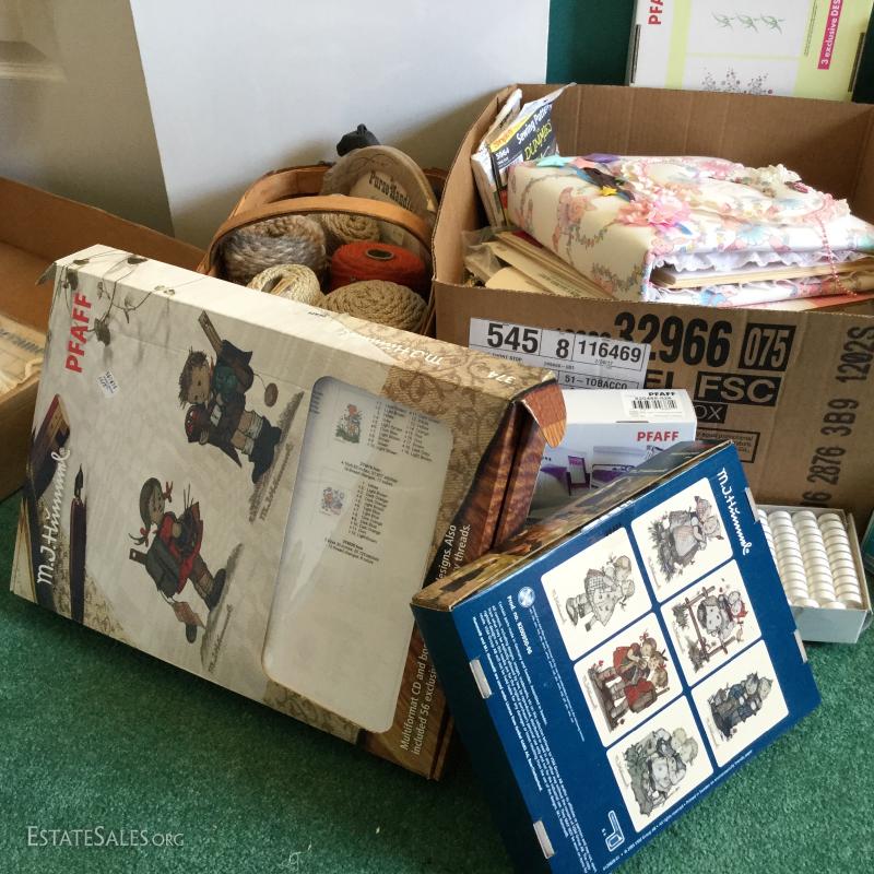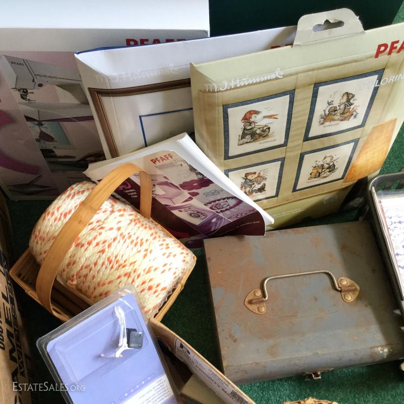 Miscellaneous Lot of crafting and sewing supplies: Fabric photo album, sewing patterns, wood macro may beads, glue gun/sticks, M.J. Hummel PFAFF, Stretch & Sew and much more. Local pick up only Columbus, NC