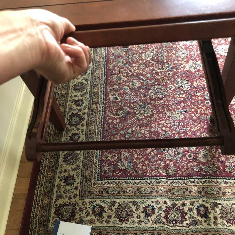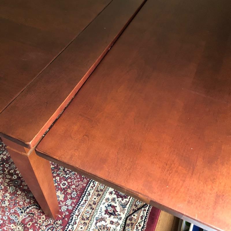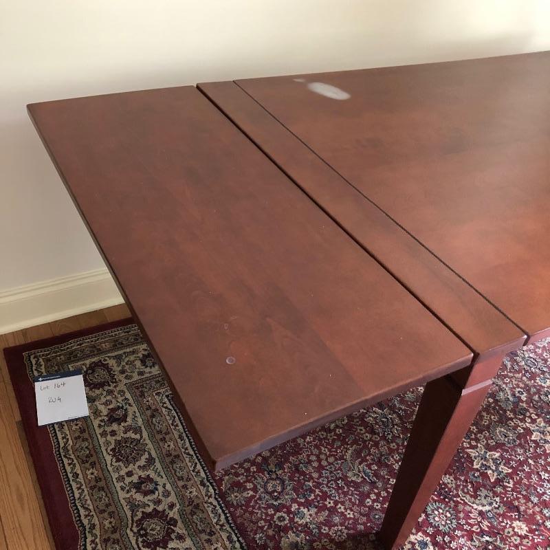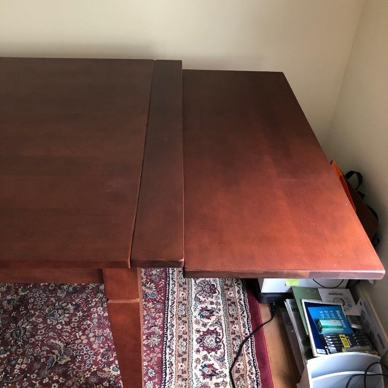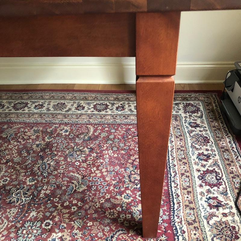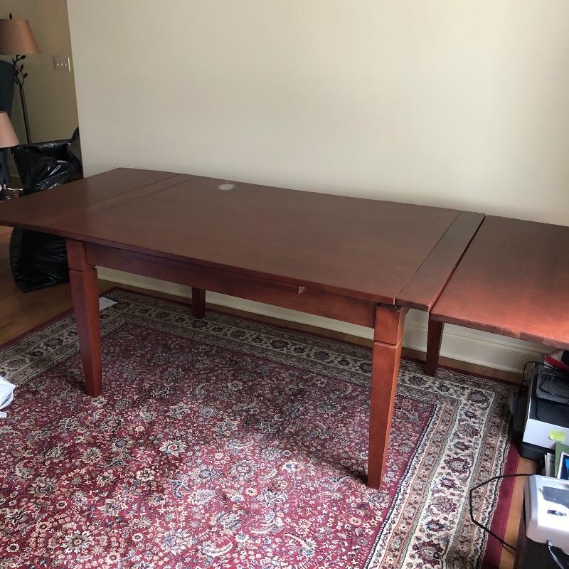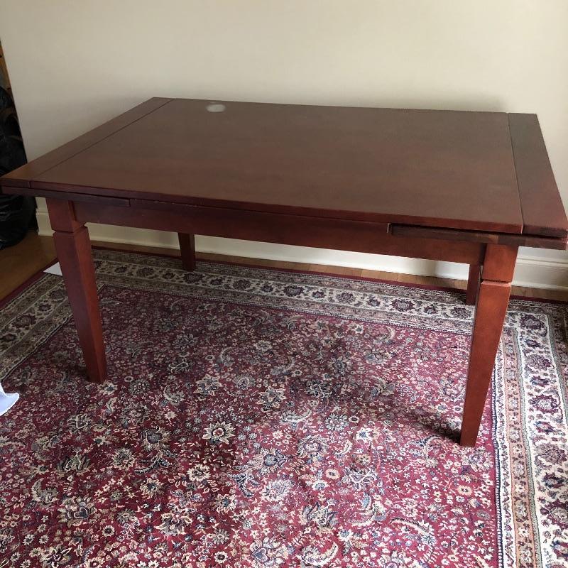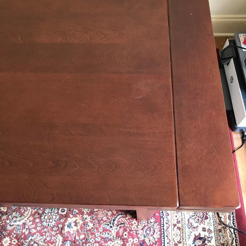 Beautiful red colored dining table measuring 40” x 60” x 30”. It can be extended to be 92” in length when the tucked away leaves are pulled out. Table appears to be pressed wood and it has one leg that is slightly detached and probably repaired at one point. There are some issues with the leaves as they do not sit level when pulled out. White spot on top appears to be permanent. Spot does not appear to be a watermark.