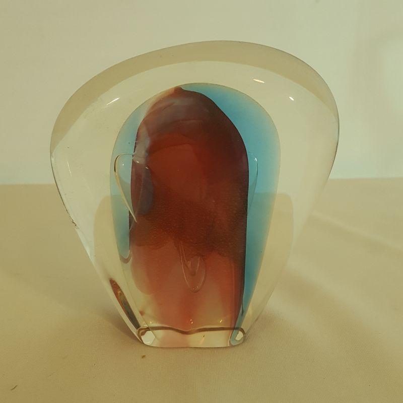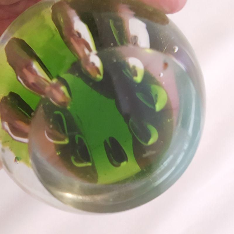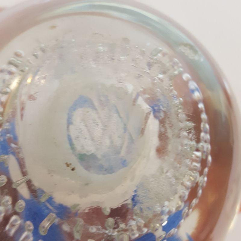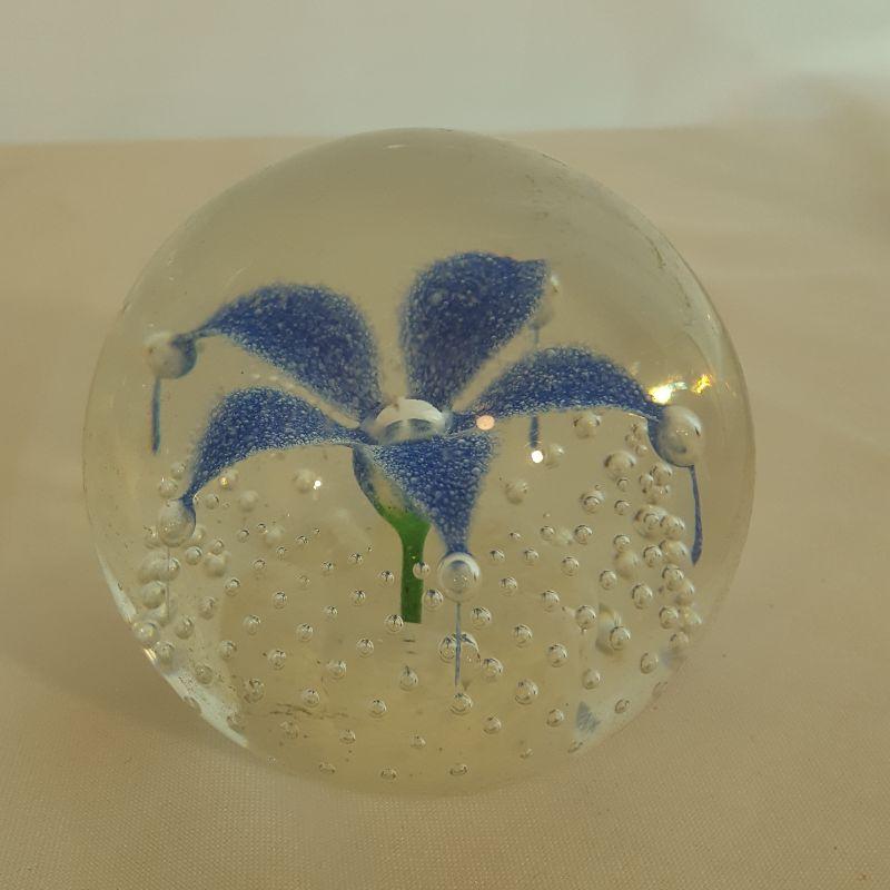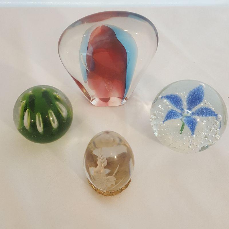 This shiny lot contains 4 glass paper weights. Each unique in it's design. The largest paper weight measures 5x5 in. The blue flower paper weight is the only one with markings on the bottom. It appears to be a V inside a W. See pictures for details. Shipping available.