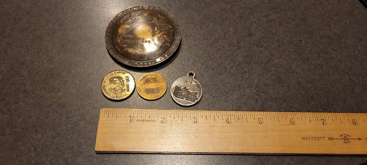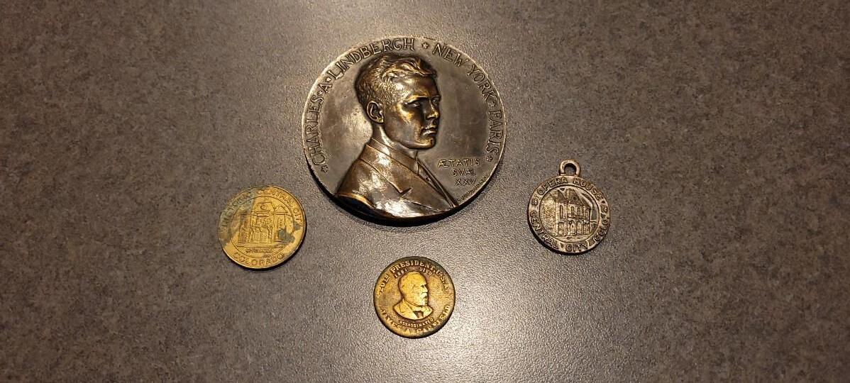 Great variety of relics from a huge Desk coin commemorating the Lindbergh Flight to some Colorado Central City Medallions.