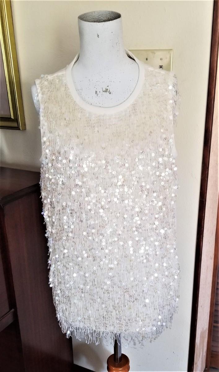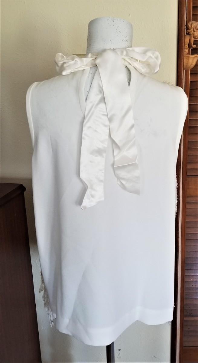 Very cool KATE SPADE heavily sequined Winter White sleeveless top with ribbon tie on reverse. SIZE 6. Would look so great with a pair of black - or forest green - or steel gray - velvet trousers and a good set of heels. You will be all set for the holiday party! Good condition.