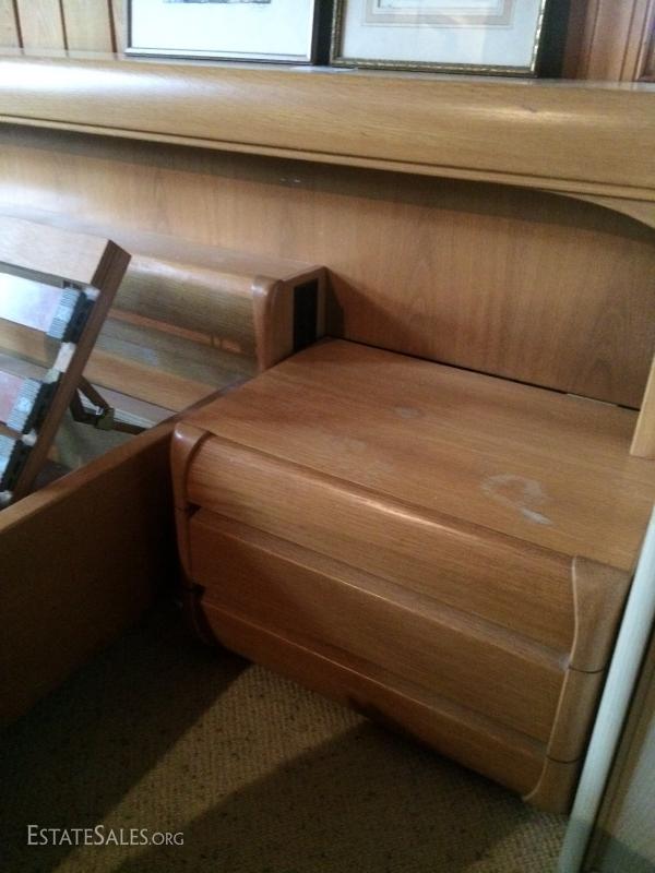 Bed.  Headboard length across is 133". Attached side tables are each 24" wide. Bed Accommodates two twin beds(making a king). Extends 89" long.