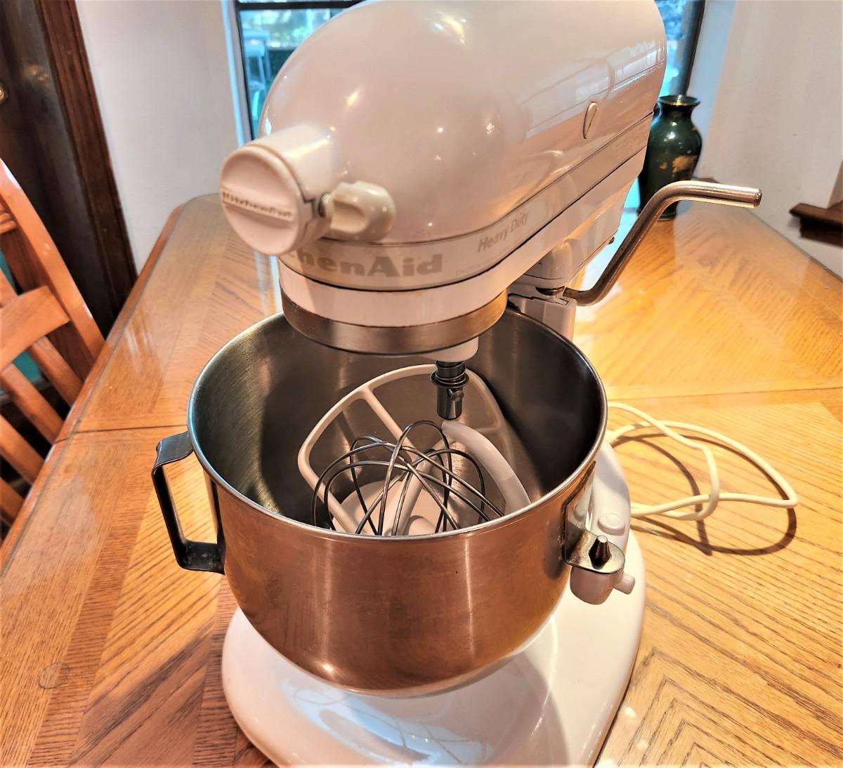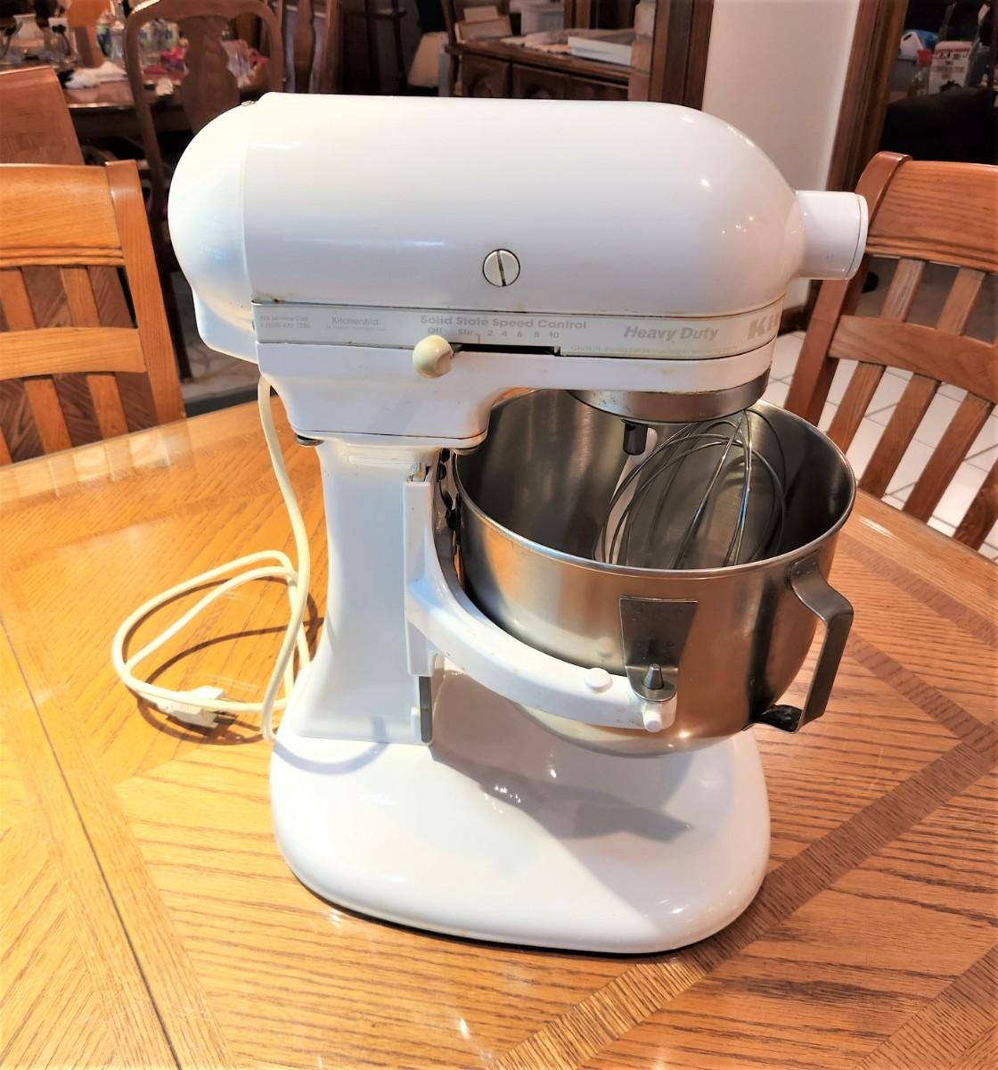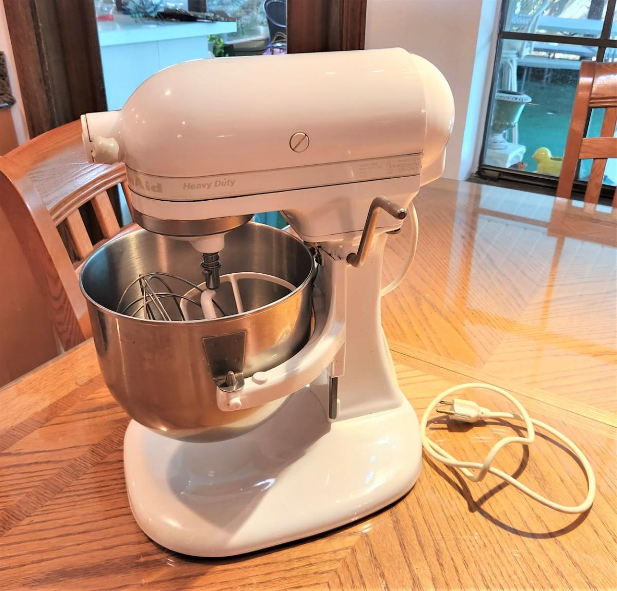 Great KITCHEN-AID heavy duty mixer, Model KSM5P5WW, 3 attachments (mixer, whisker, dough hook). About 16" tall - good working condition.