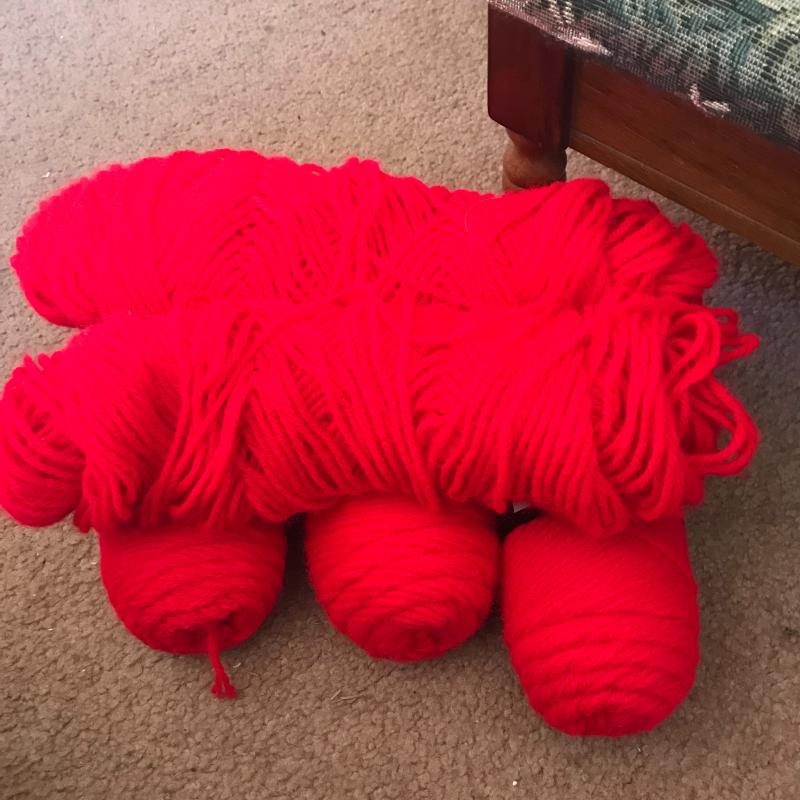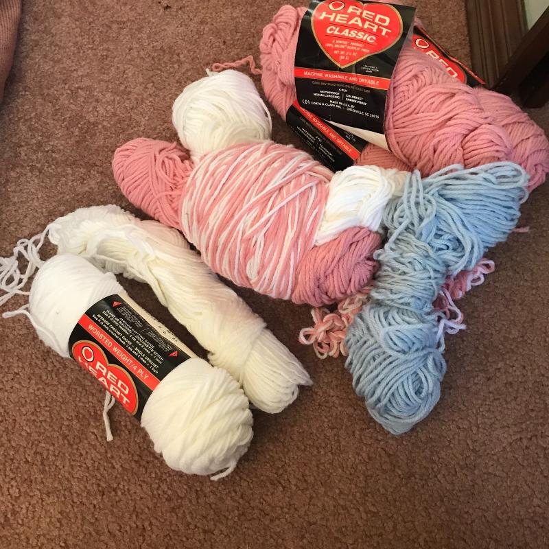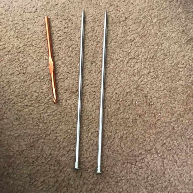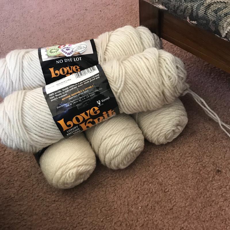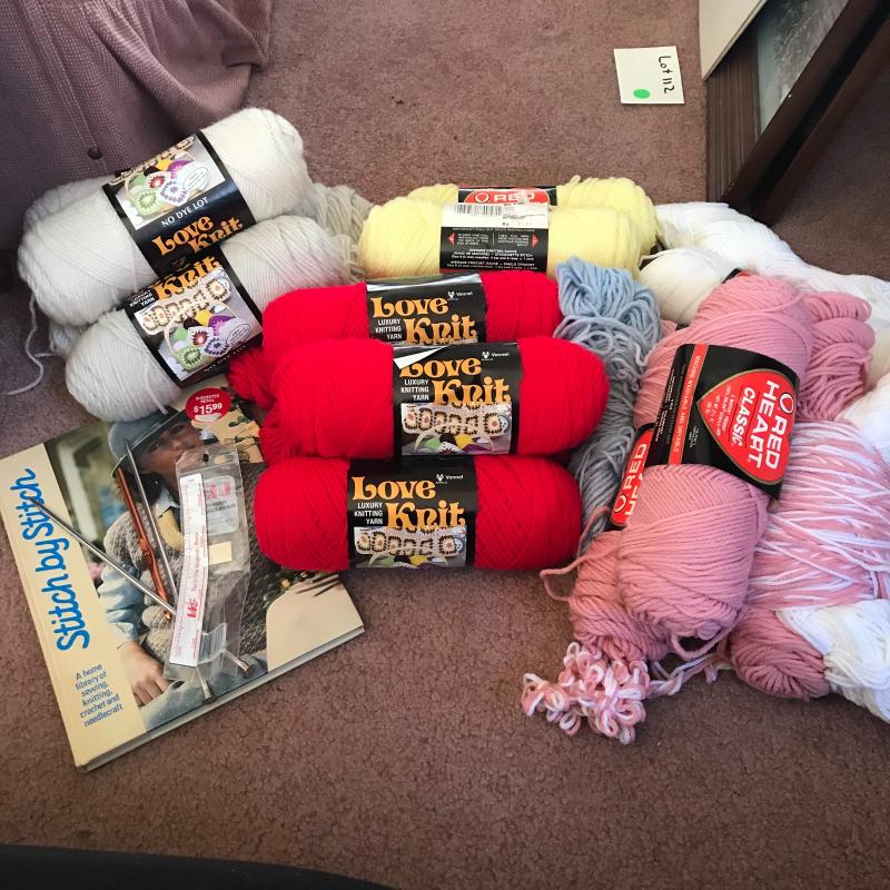 Full bag of knitting yarn with two knitting needles and one crochet needle. Lot is available for local pick up in Asheville, NC only.