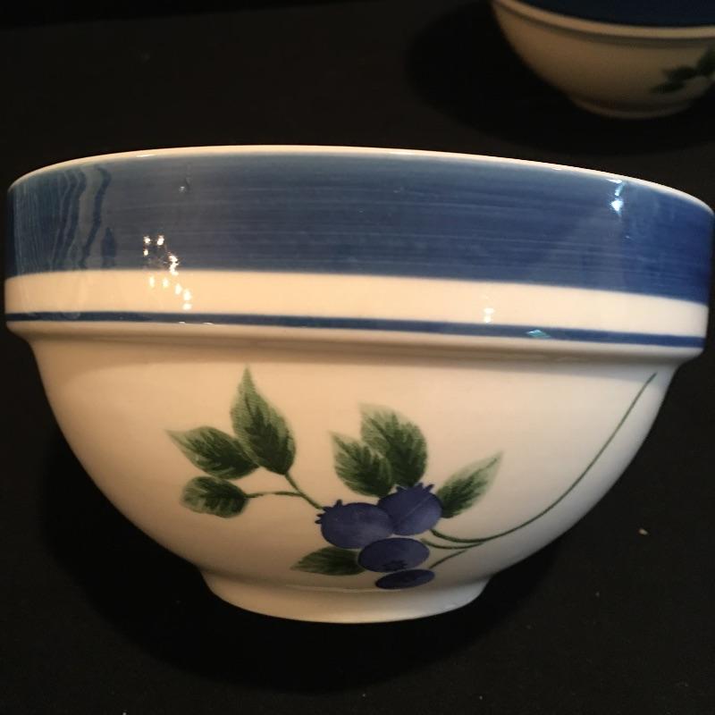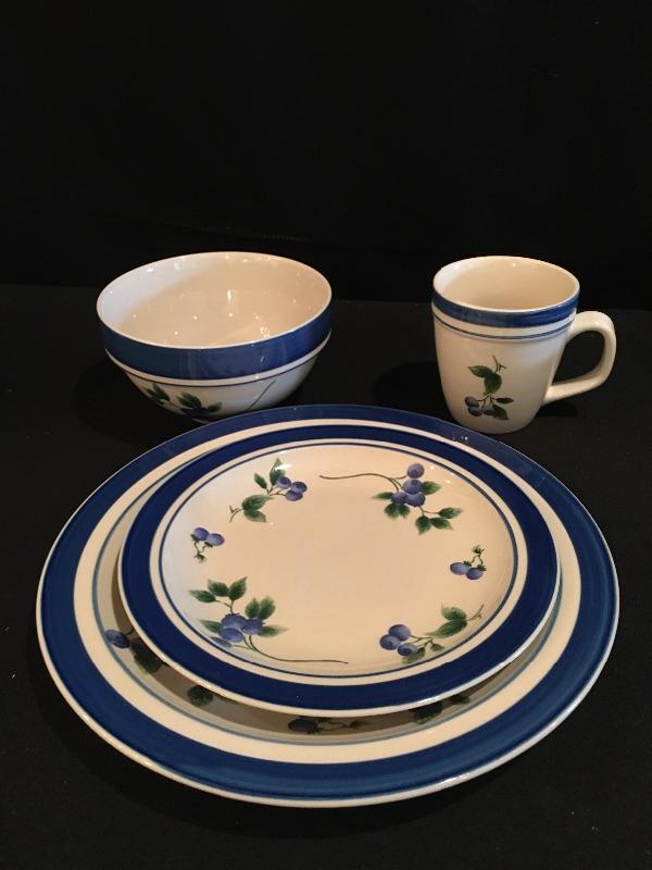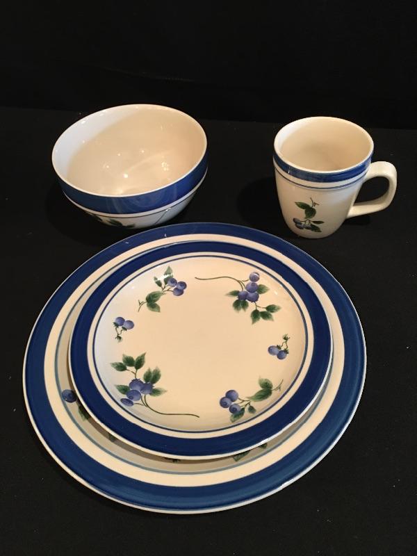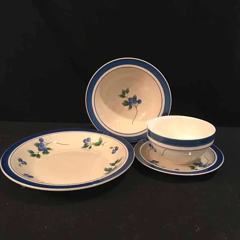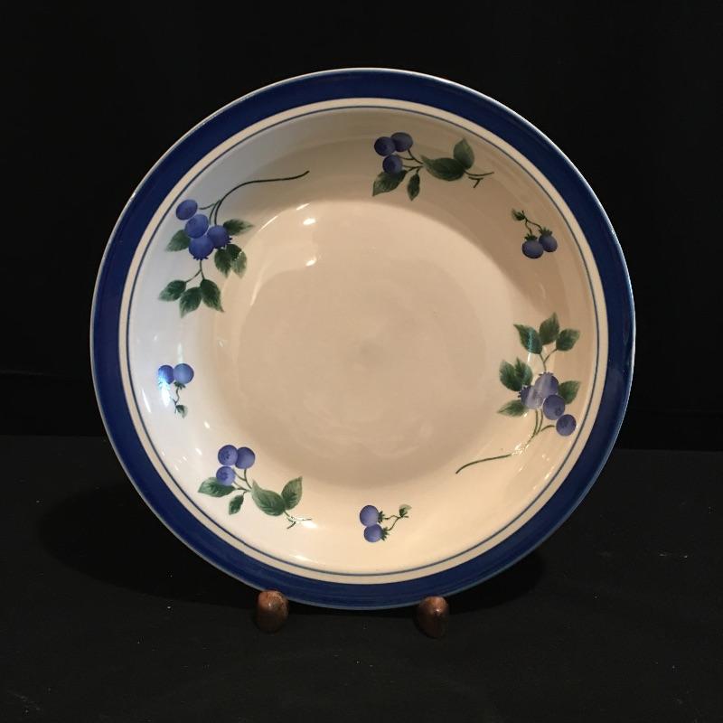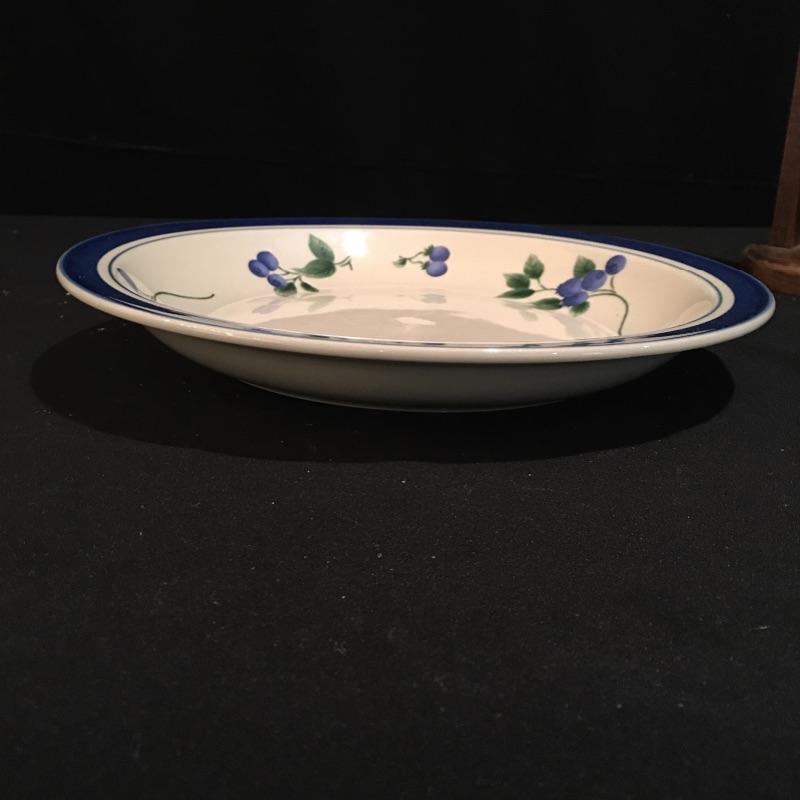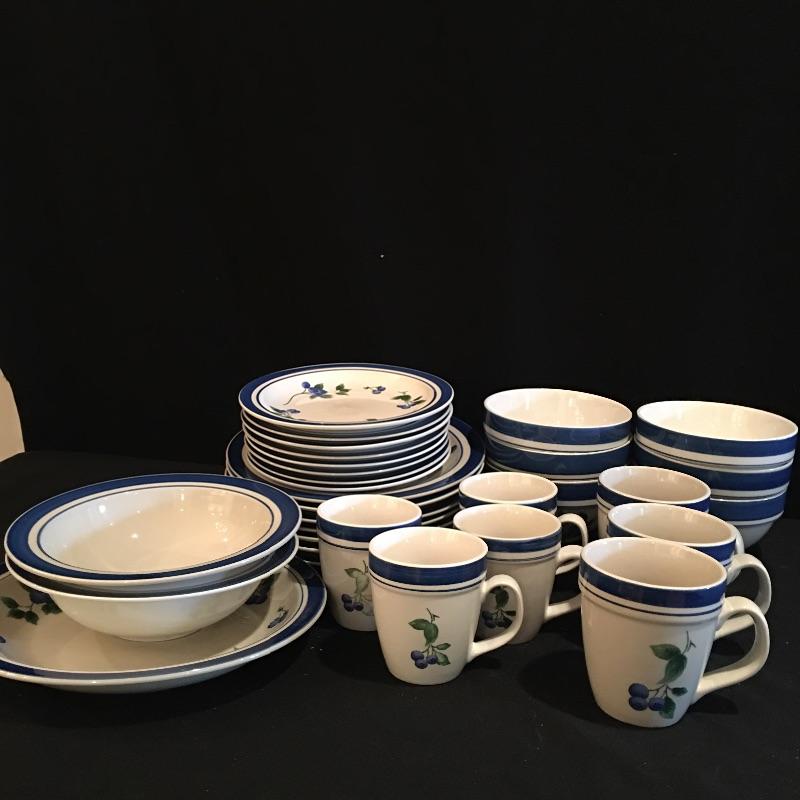 This L.L. Bean dish set in Blueberry pattern will add some country flair to your home. Set includes two serving bowls, serving platter, six bowls, seven dinner plates, eight small plates, four mugs and three large mugs. Serving platter 12”D x 1.75”.