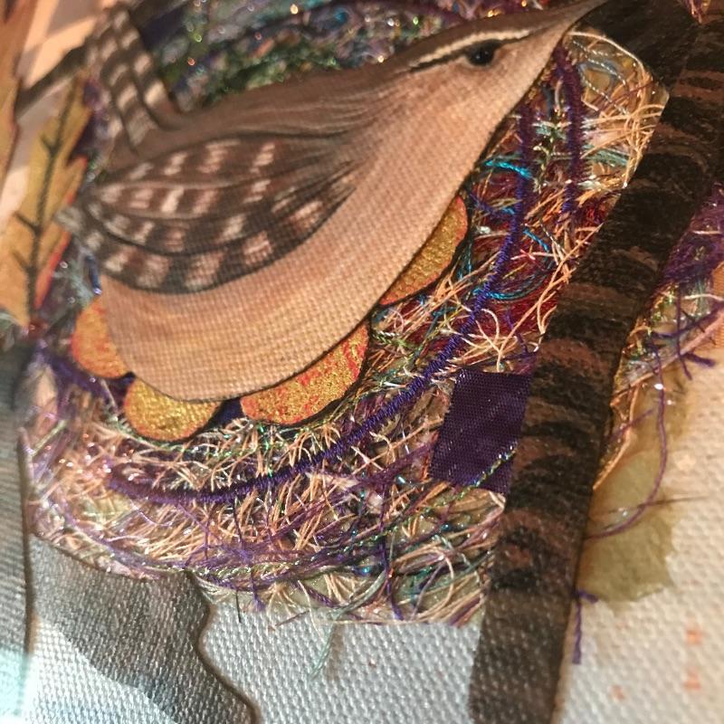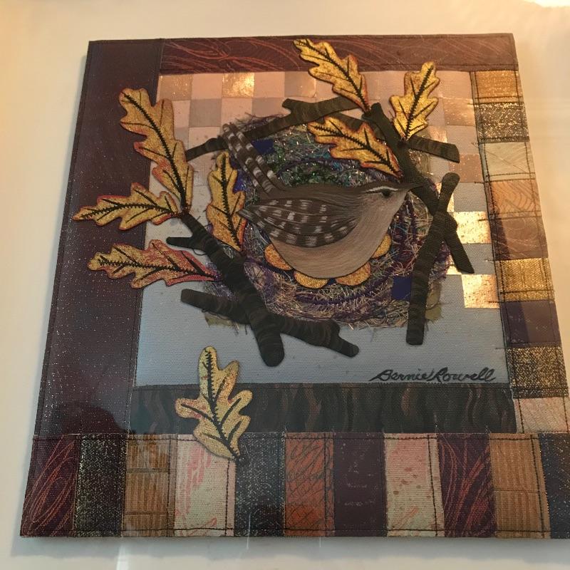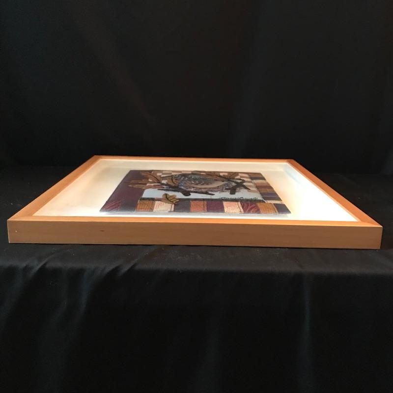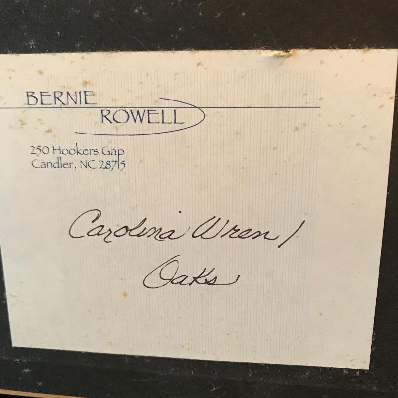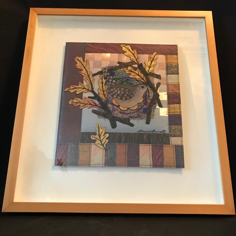 “Carolina Wren/Oaks” a lovely quilted mixed media art signed by Bernice Rowell. Art sits in a light colored wooden shadow box frame with glass front. Frame measures approximately 18.5” x 1.5” x 19.5”. See photos. Shipping available. Please call UPS with dimensions at 828-252-6930 for a shipping quote prior to bidding.