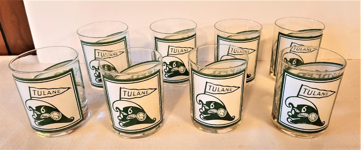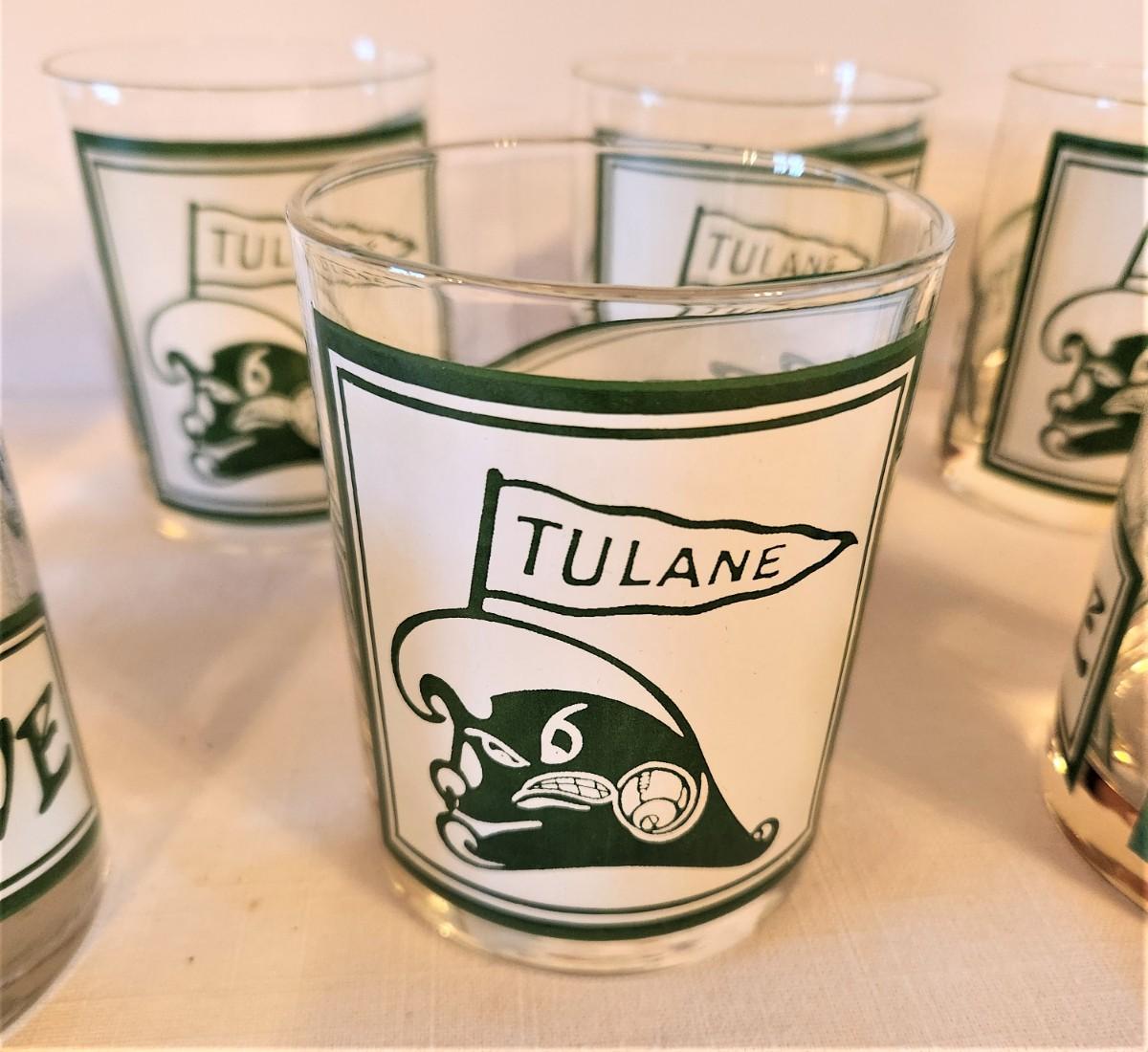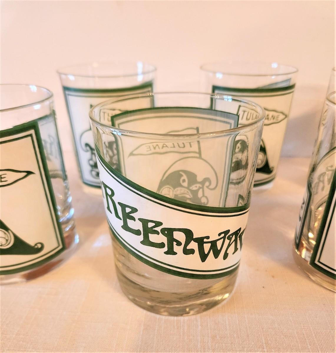 Nice set of 8 vintage TULANE Green Wave Bar glasses. Each stands 4.5" tall - all in good condition.