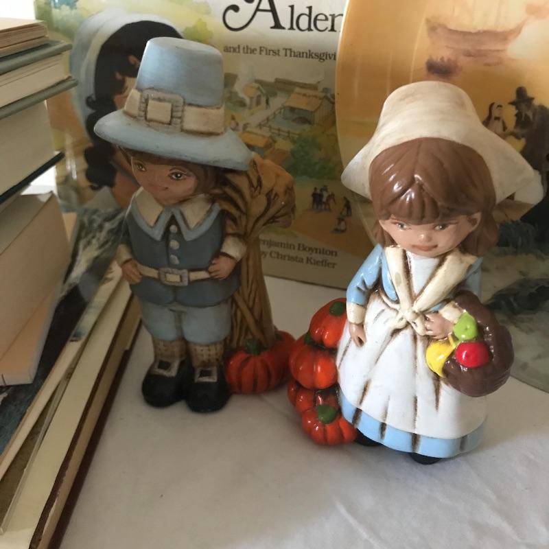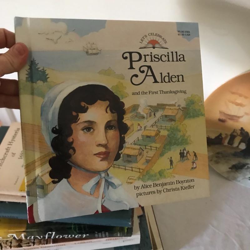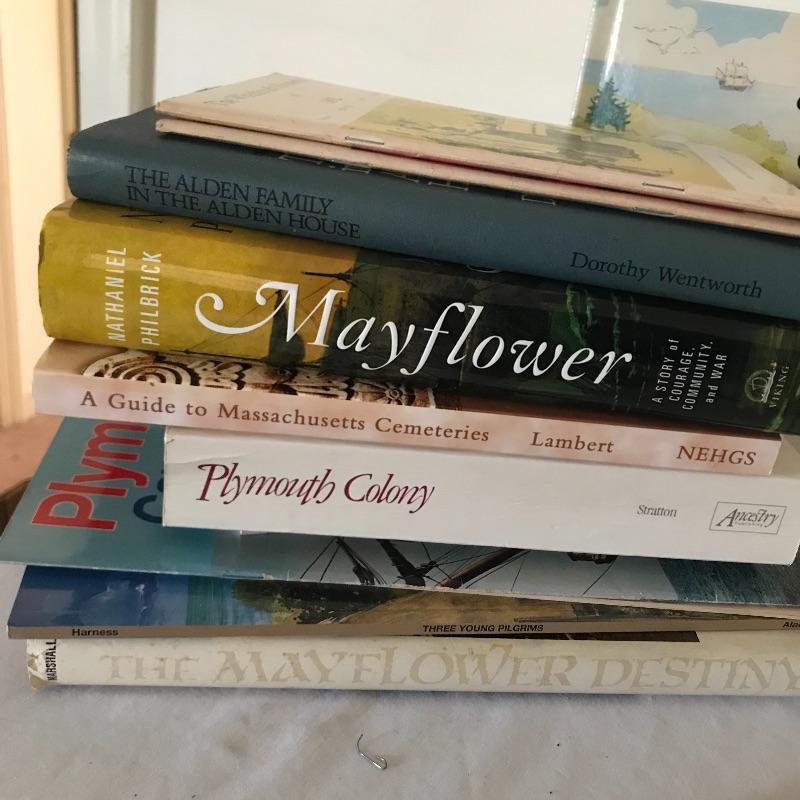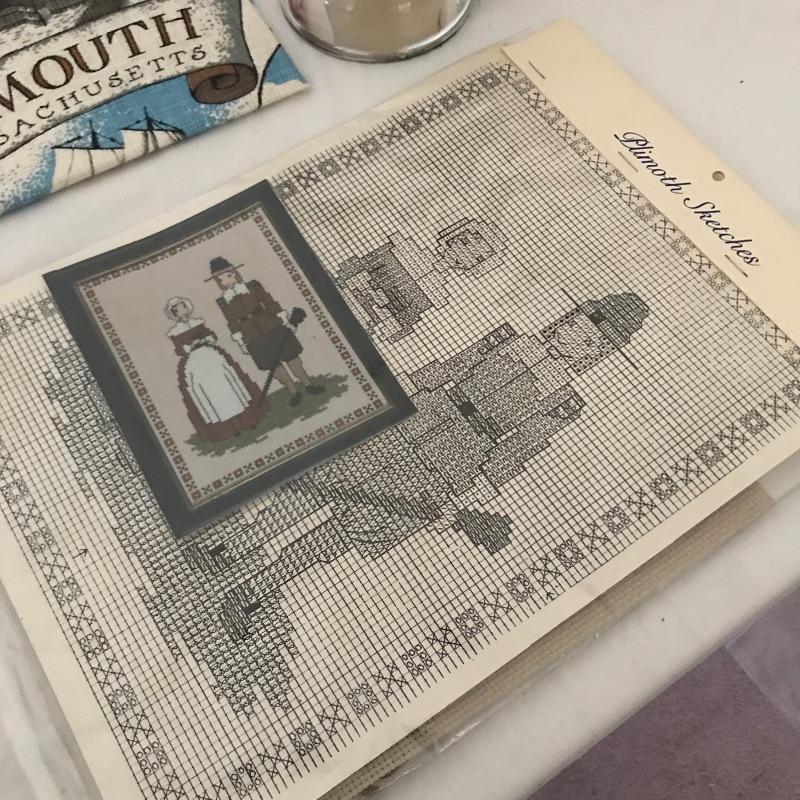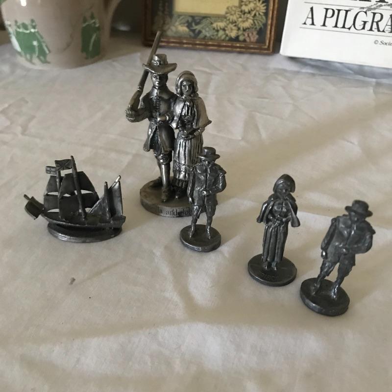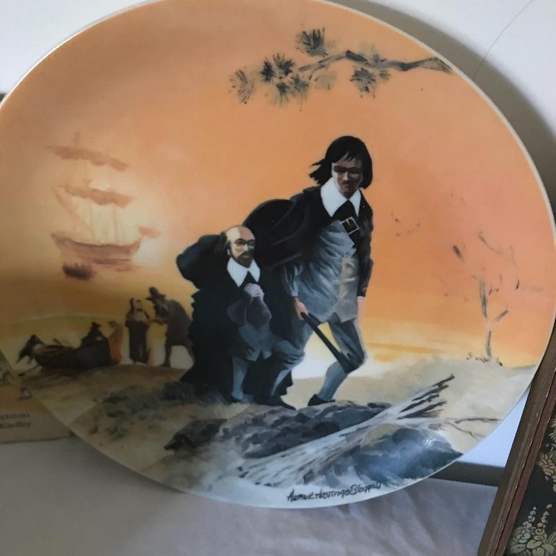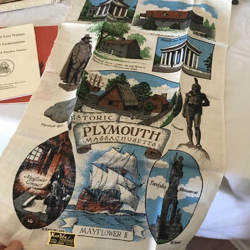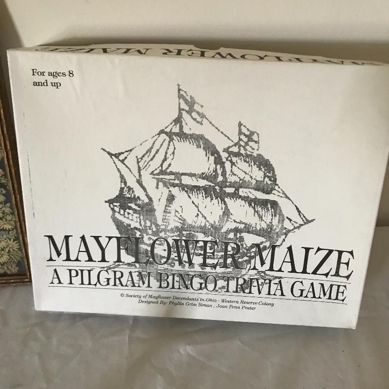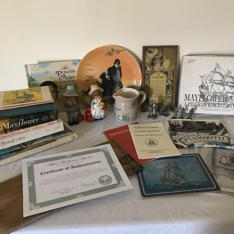 Lot contains many Mayflower/Pilgrim themed collectibles includes a shingle from the National Historic Landmark Alden House in Duxbury (with certificate of authentication)! It also includes figurines, a trivia game, pitcher, books, a wind sock, needlework kit, and more. See pics. Local pickup only.