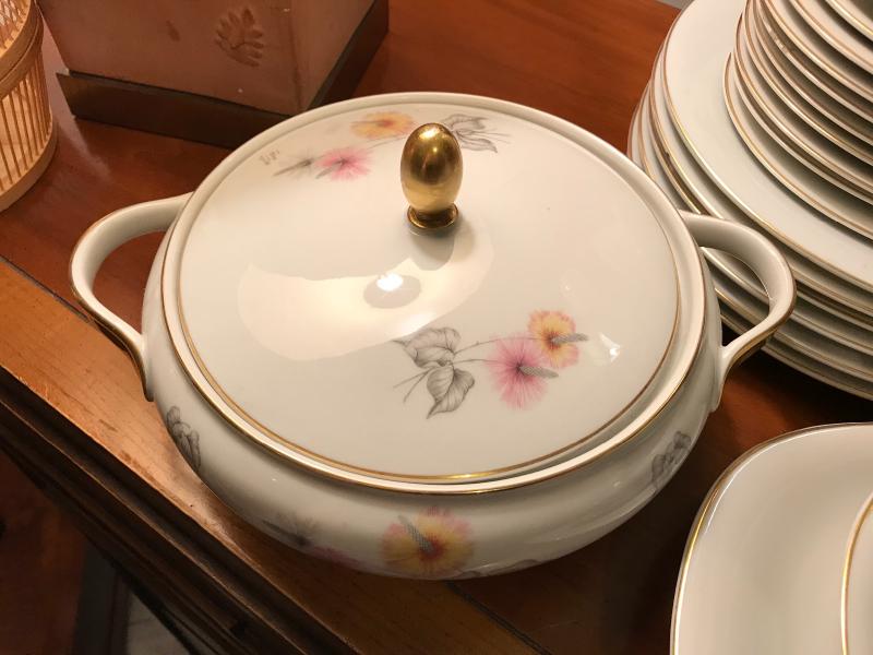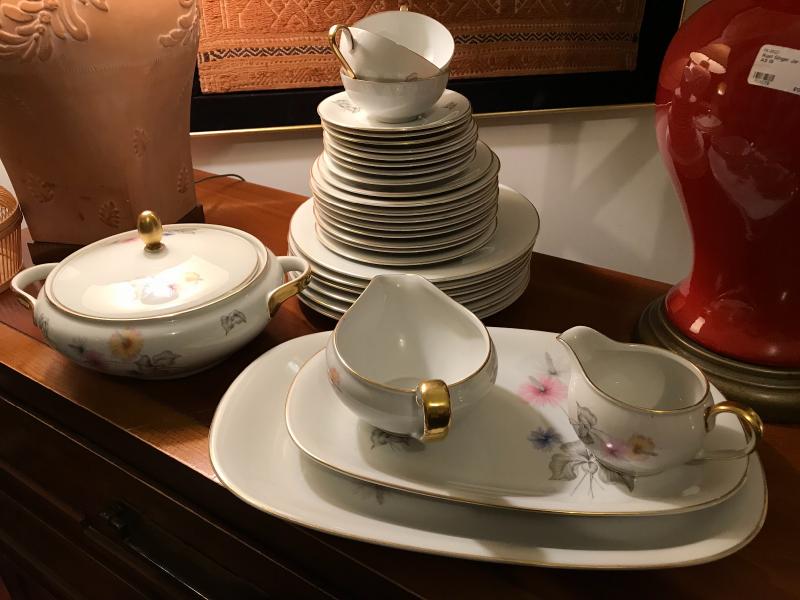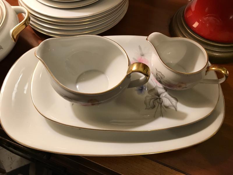 Nice MCM set of TA Porzellan Bavaria Germany china in the "Summer Highlight" pattern. White background with gold rim, and abstract grey, pink, blue, and yellow floral pattern. Mixed set includes- large platter, small platter, cream, gravy boat with attaached underplate, round handeled covered vegetable, six dinner plates, eight salad plates, four bread plates, four tea saucers, and three tea cups. In great condition.