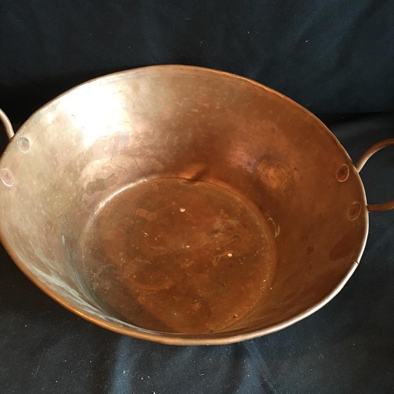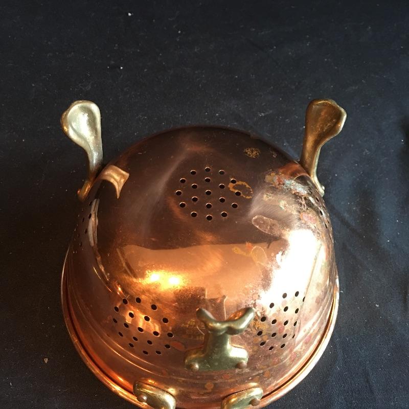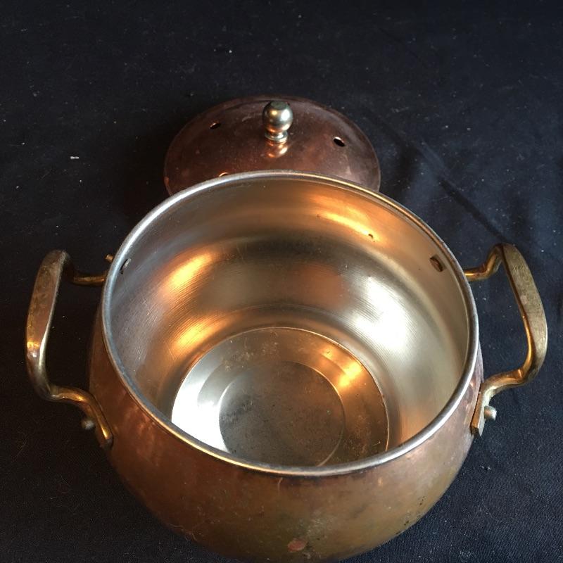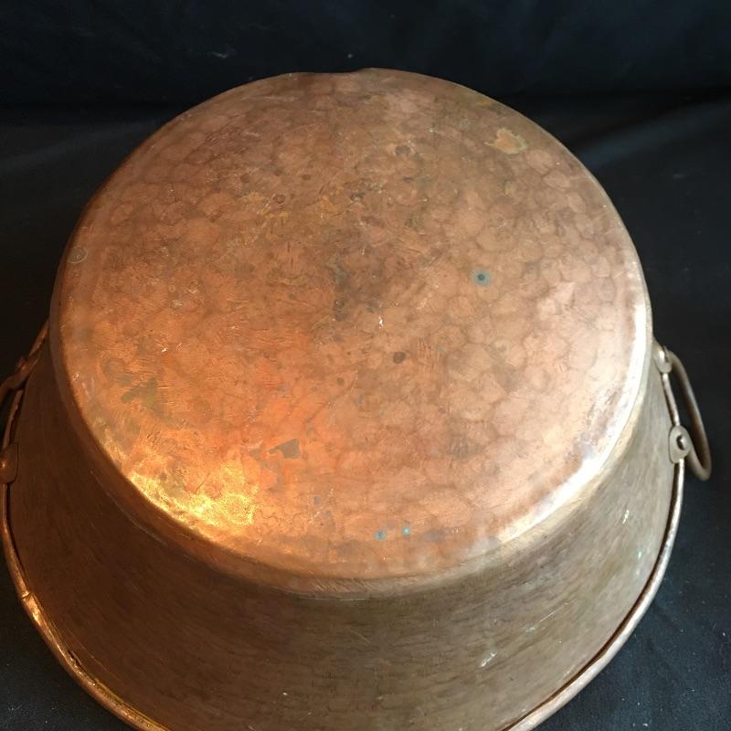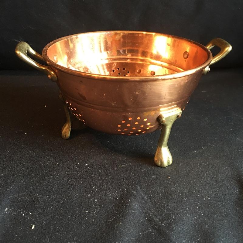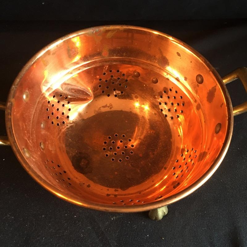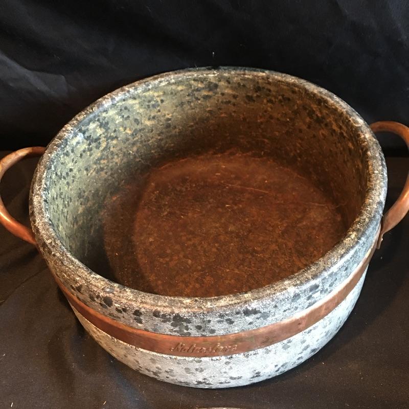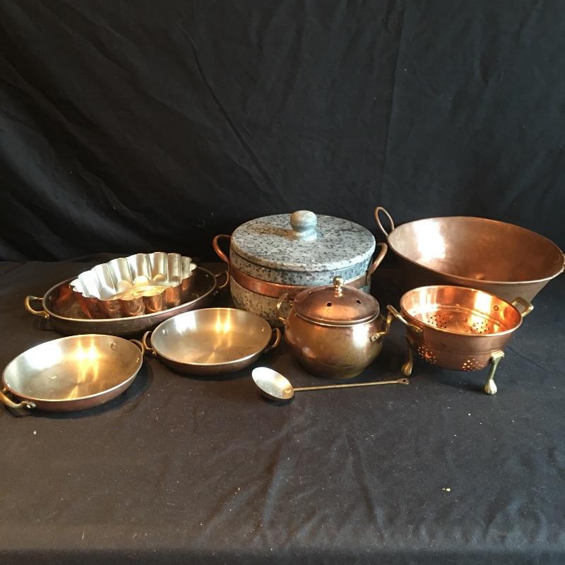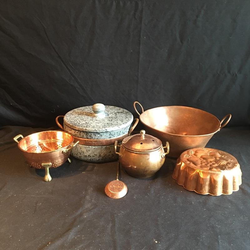 A nice collection of copper pots and a Naturstone soapstone pot with copper band and handles and a colander, thee dishes, mold, pot and a covered jar that are all copper or copper clad. Soapstone pot measures 9”D x 5”.
