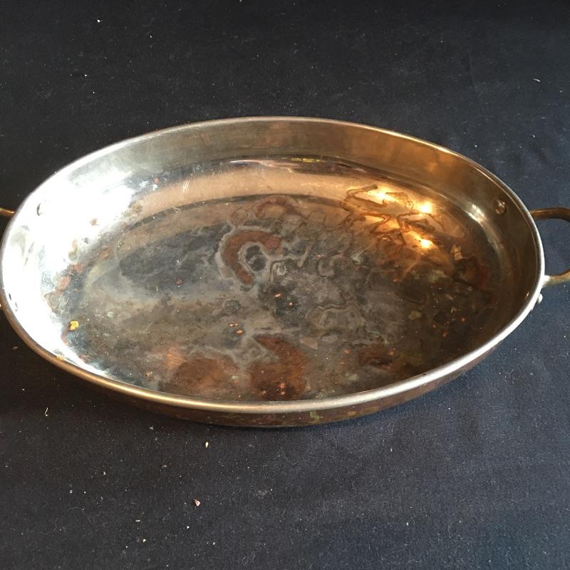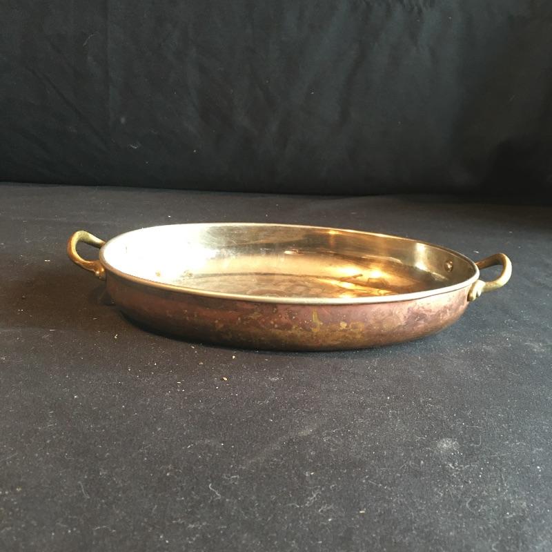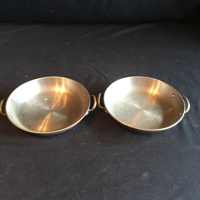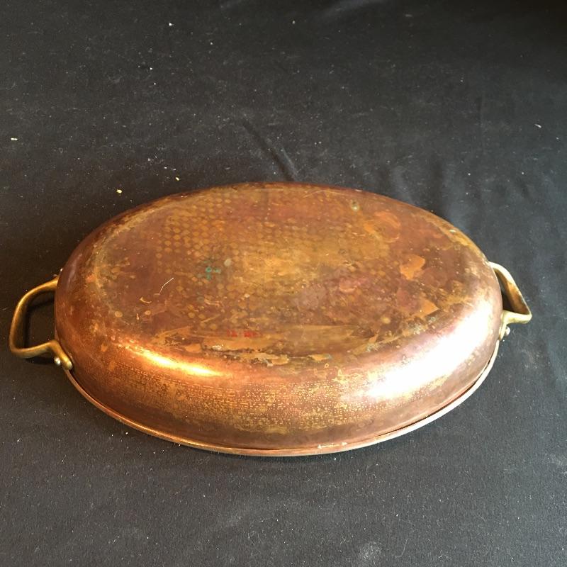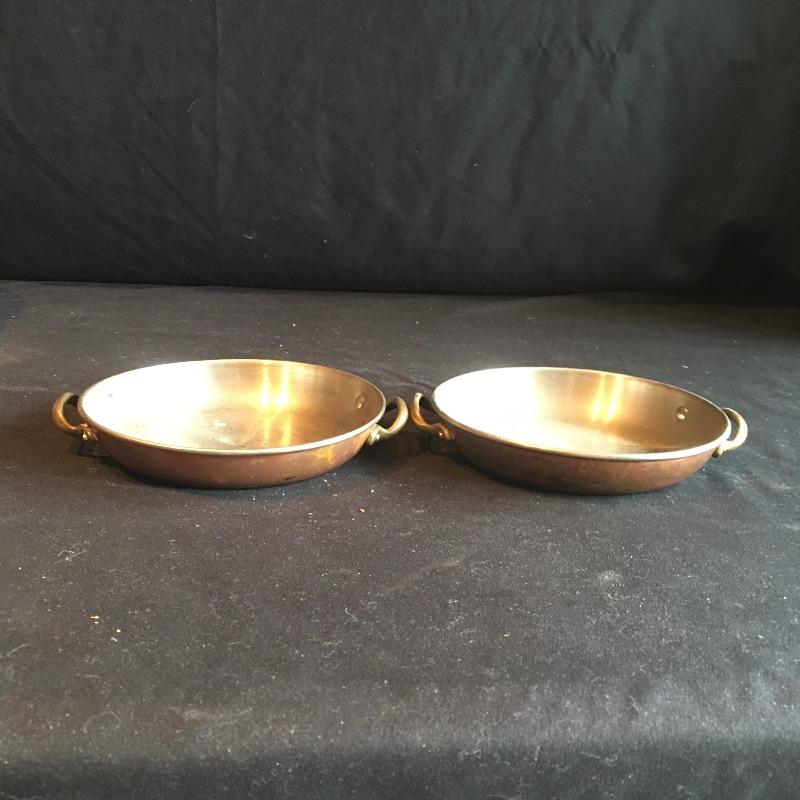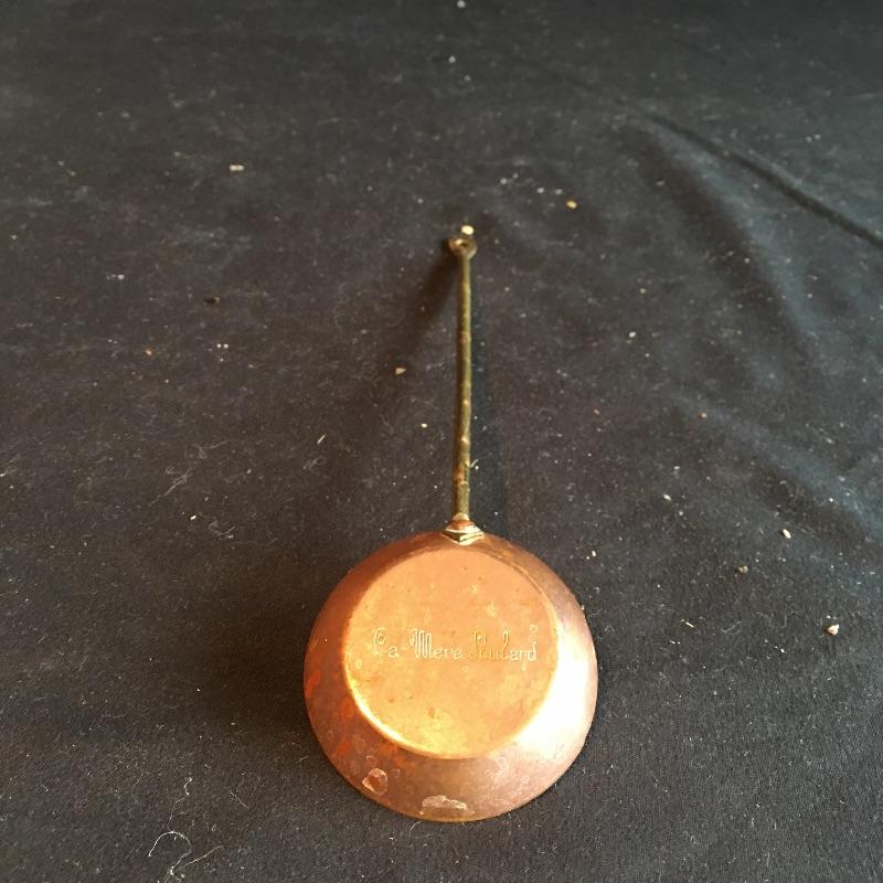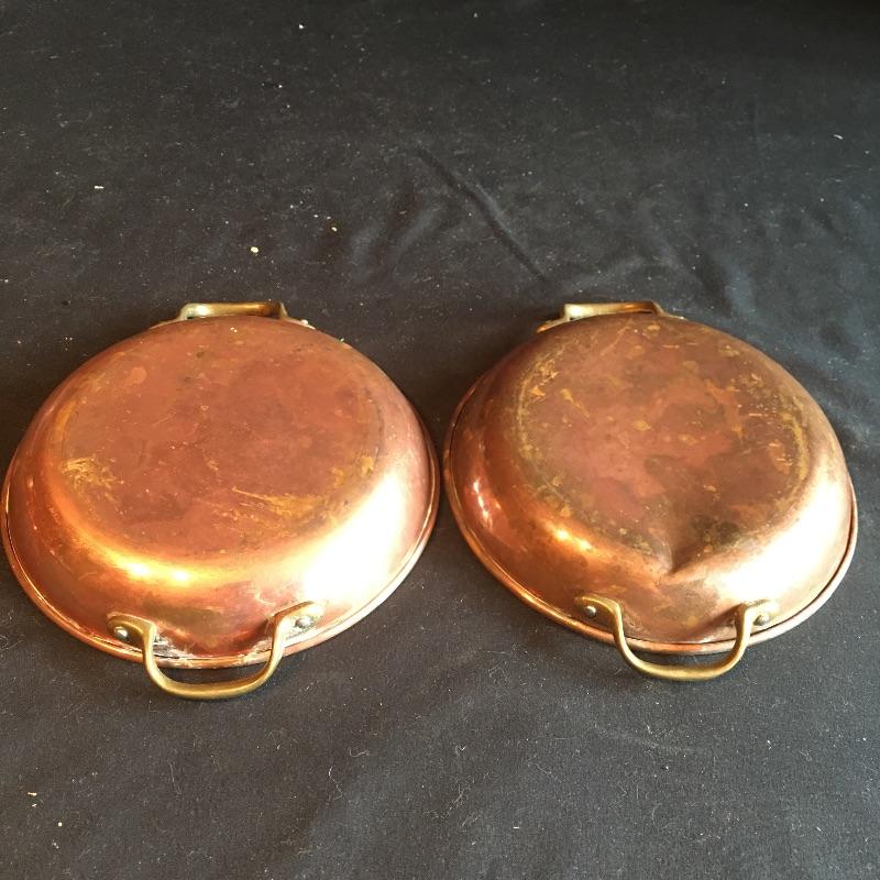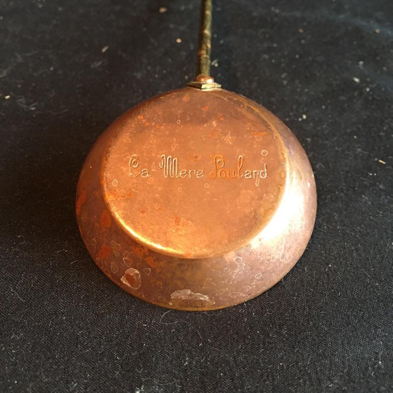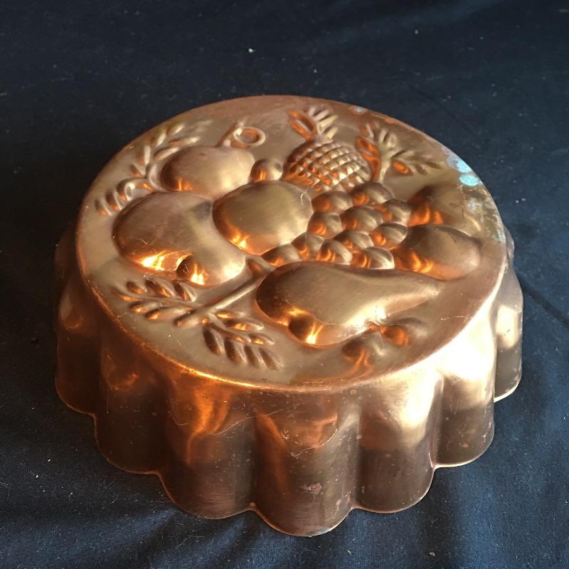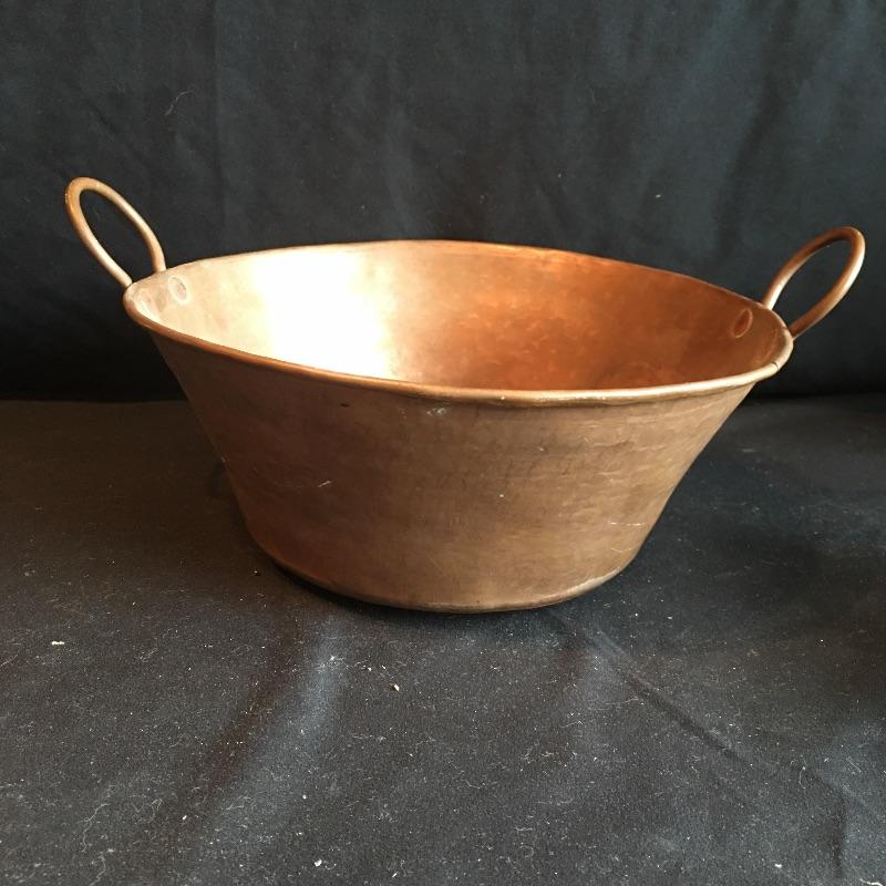 A nice collection of copper pots and a Naturstone soapstone pot with copper band and handles and a colander, thee dishes, mold, pot and a covered jar that are all copper or copper clad. Soapstone pot measures 9”D x 5”.