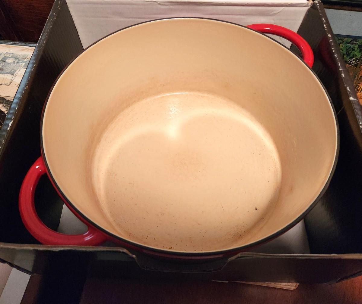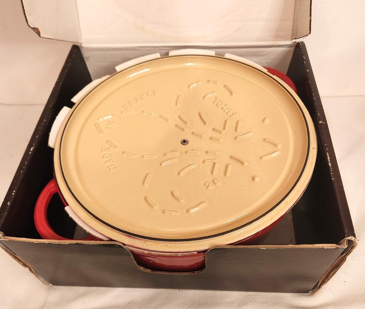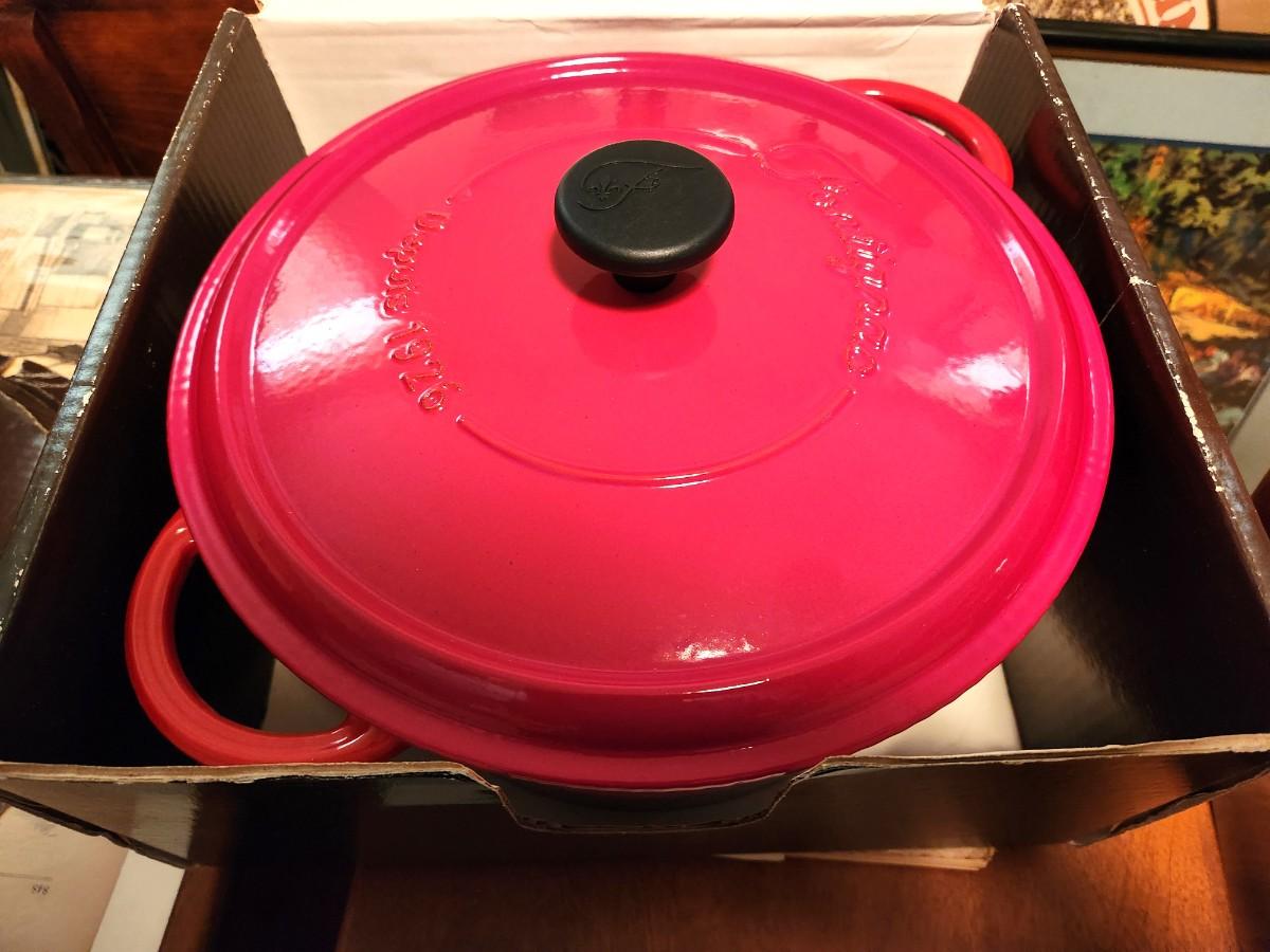 New in box - French over with lid - pretty apple red color - good condition - similar to Le Creuset.