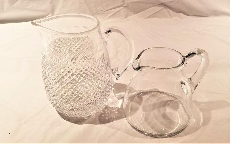 Nice little lot of 2 pretty crystal pitchers. The plain one is BACCARAT (marked on bottom). Nice condition. Large pitcher is 7 1/4" tall, smaller one is 5.5 inches tall. Price for the pair