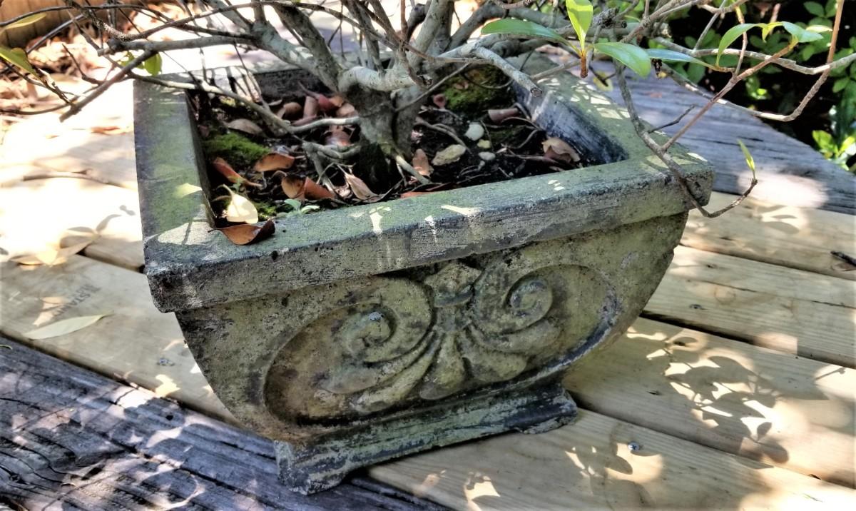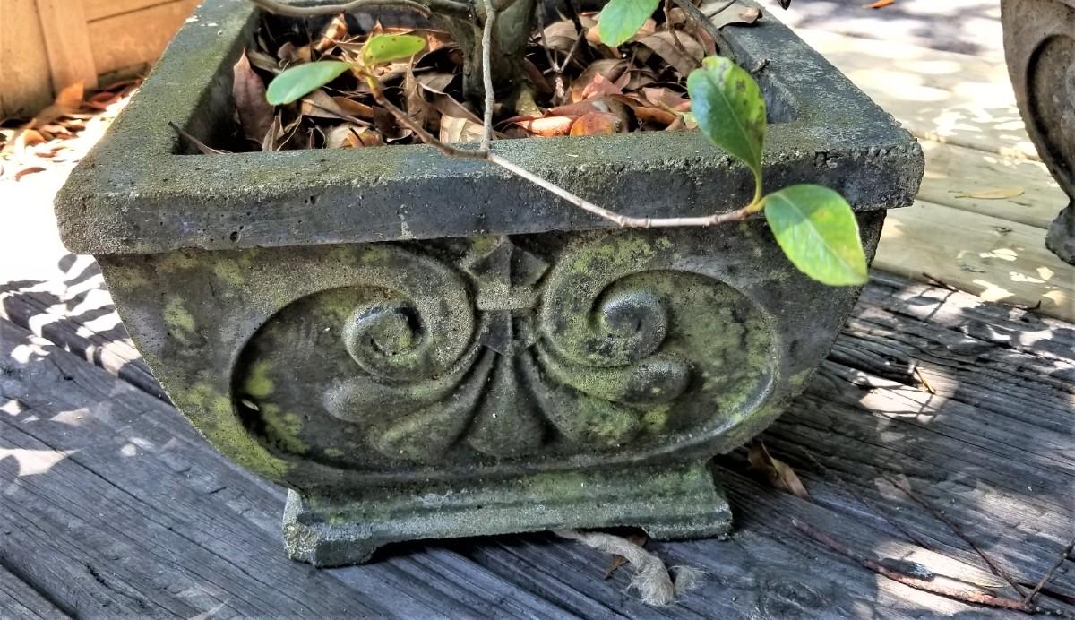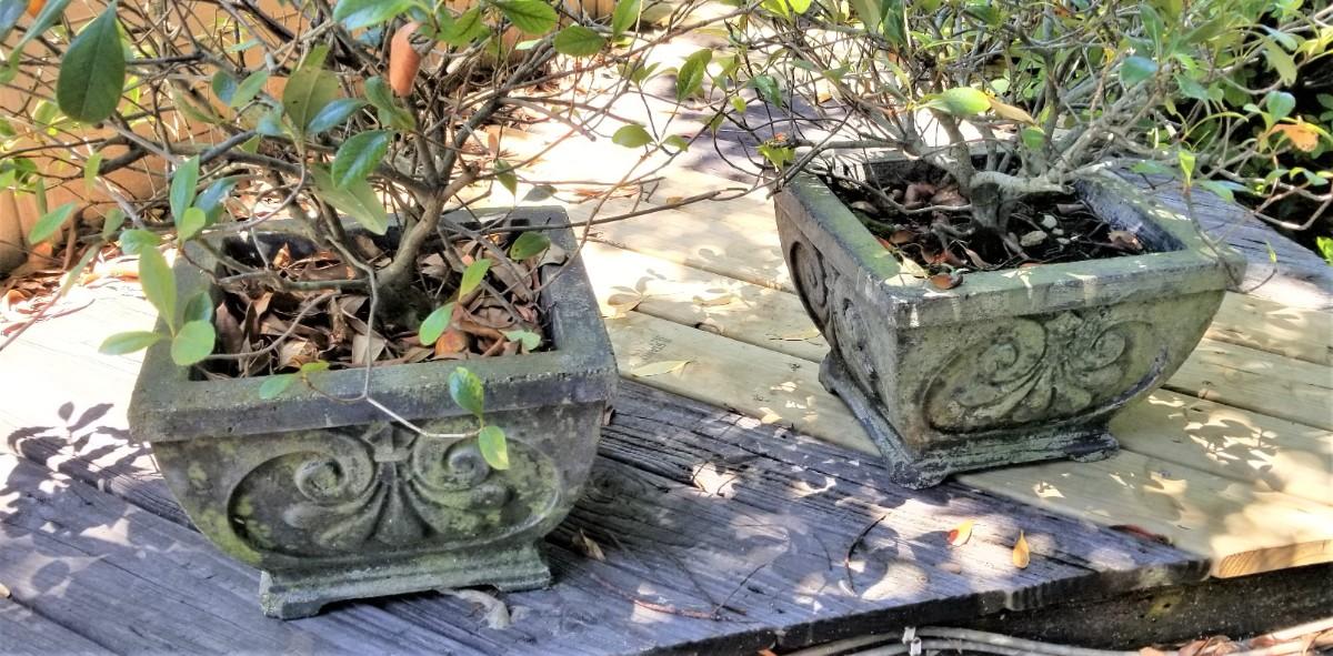 Nice older pair of heavy concrete planters - we're throwing in the plants for free! You'll have to move these yourself. Note that one has a small chip at the bottom base on one corner. They each measure 13.25 square x 9.5" tall.