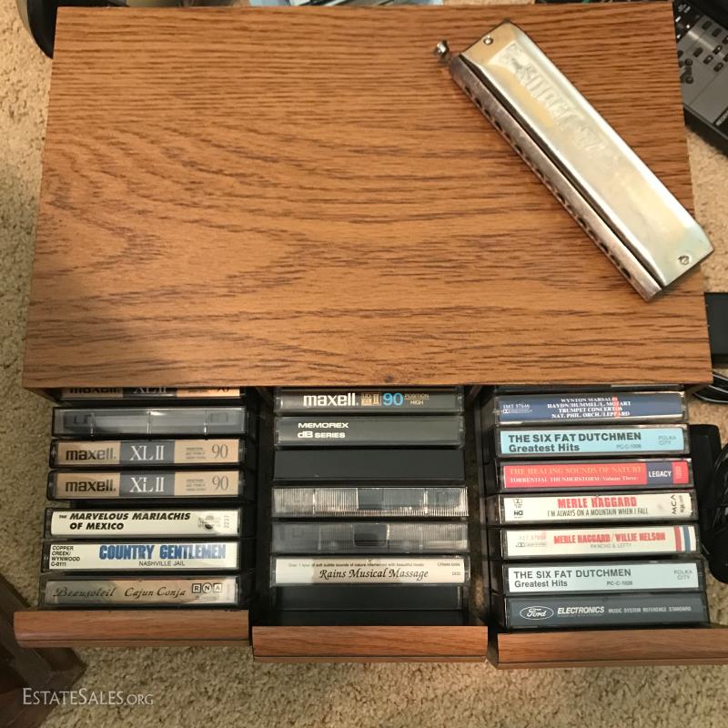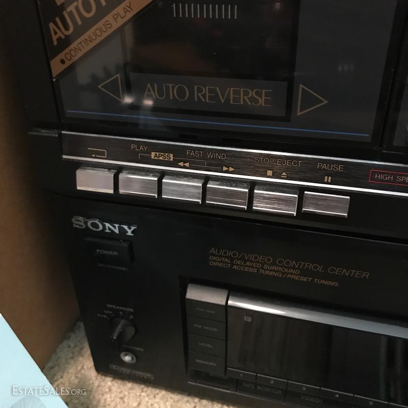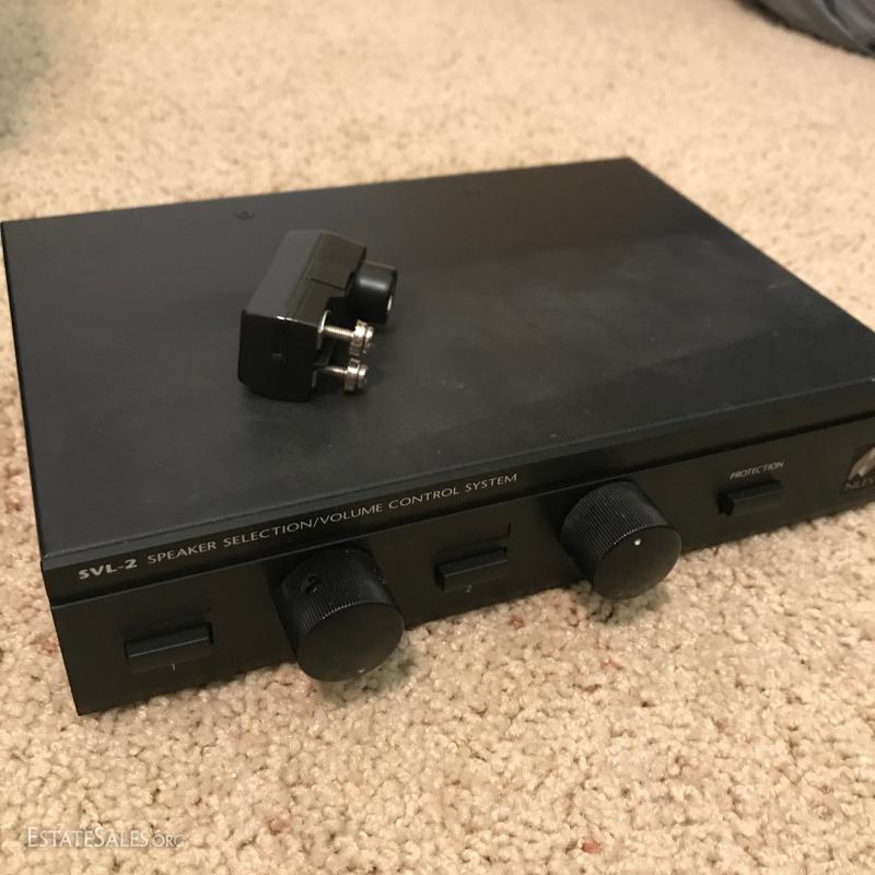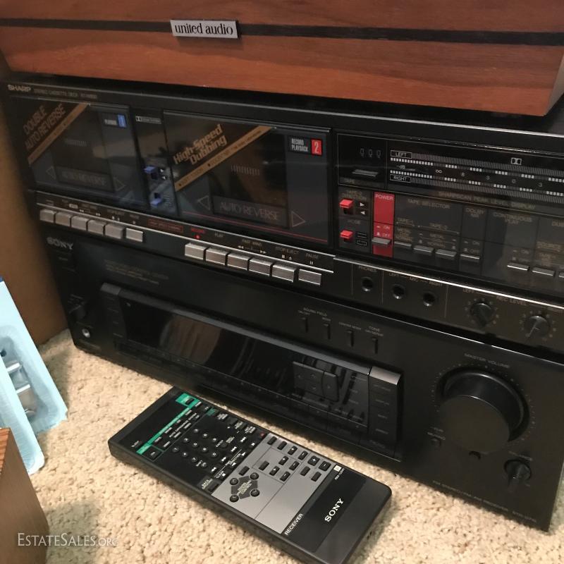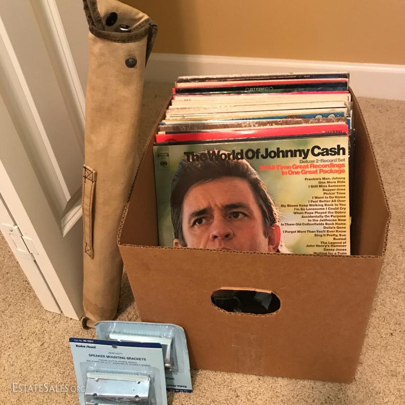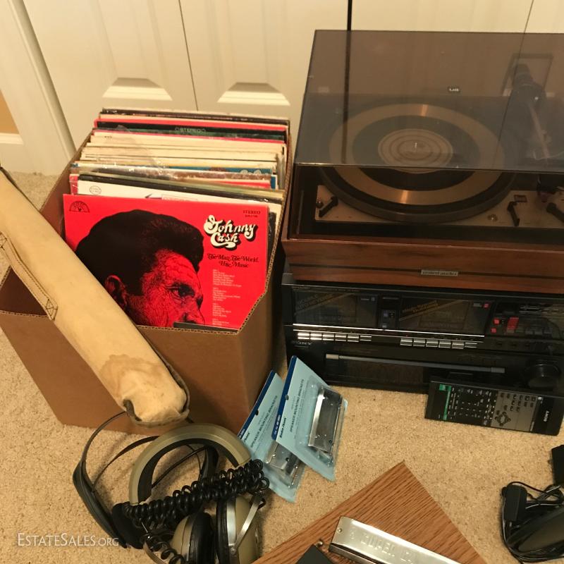 Large lot of misc records. LPs include Johnny Cash and others. Record player by United Audio., Sharp Cassette Deck., Sony Audio/Video Control Center with remote,. Niles SVL-2 speaker selection volume control system. Lot also includes portable music stand, speaker brackets, Super 64 harmonica, headsets, antenna, black light and misc cords. This lot is available for local pick up in Hendersonville, NC