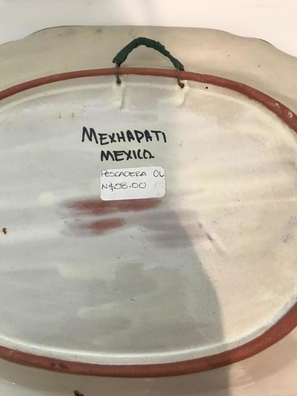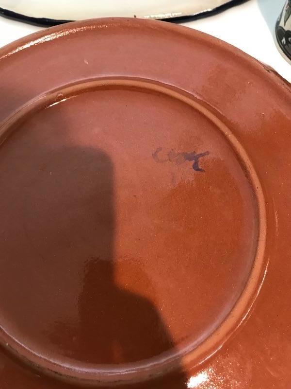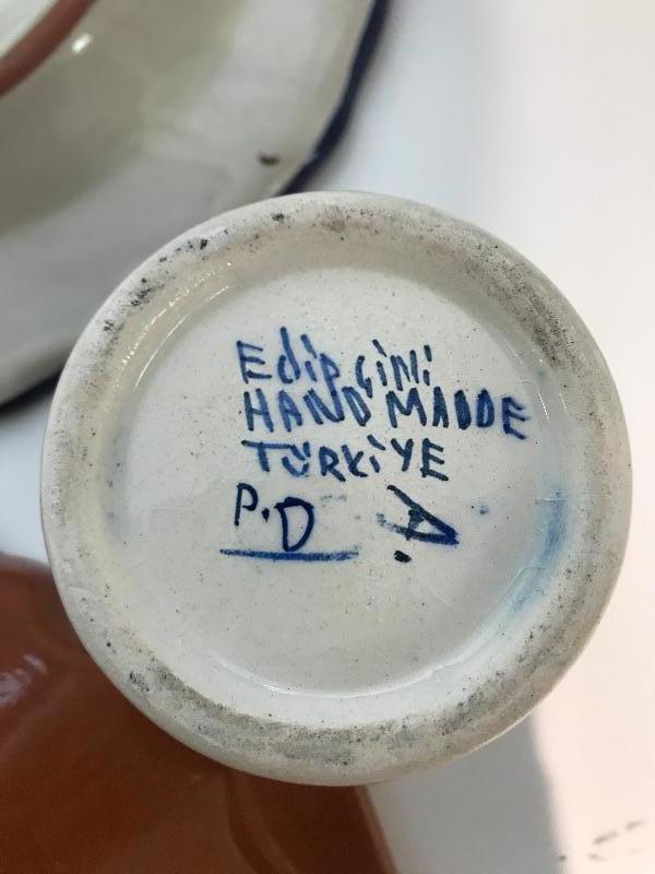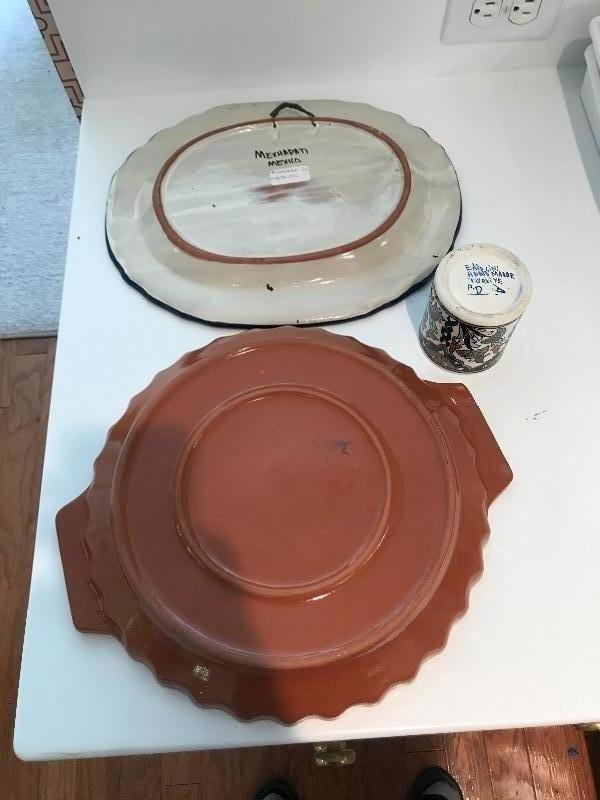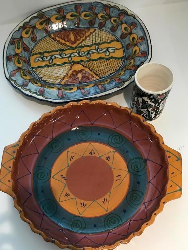 Small pottery cup Turkiye 3-1/2” tall and 2-3/4” diameter, pottery bowl 14” diameter, Mexhipati Mexico platter 13-1/2”
