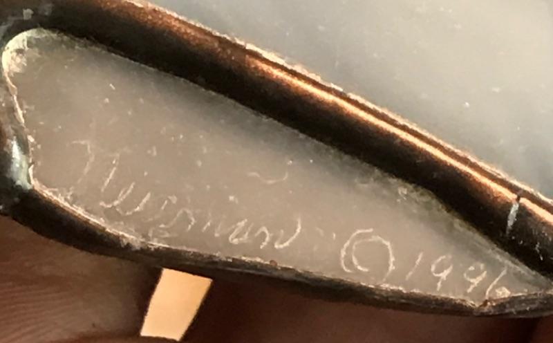 Stained glass styled heron figure on a piece of driftwood. Signed (can’t quite make out signature) copyright 1996