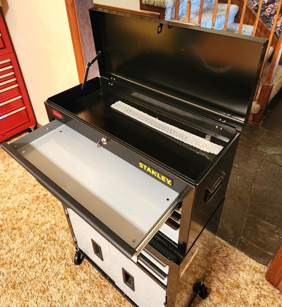 Gently used Stanley Standing Tool box - 6 drawers, lift off top. 12" deep, 24" across, 40" tall. Has wheels.