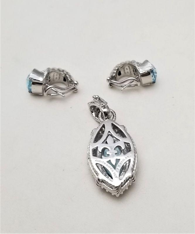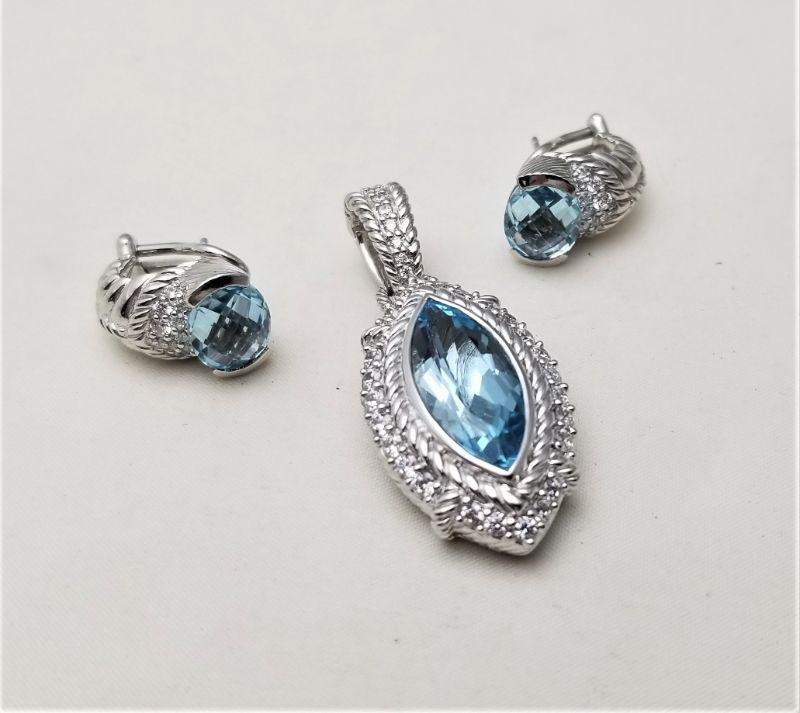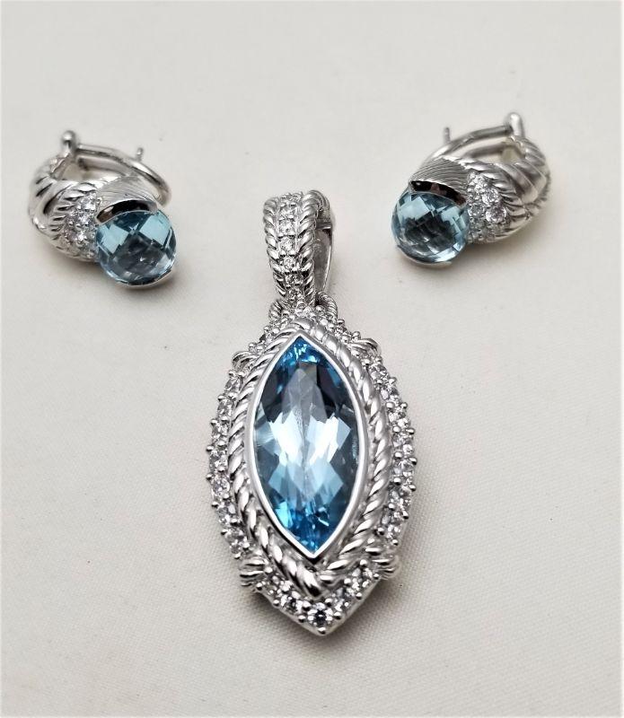 This set is really a stunner - Sterling silver enhancer/pendant by Judith Ripka set with a large faceted blue topaz and CZS along with matching lever back pierced earrings that fit on the ears so beautifully that I was sorely tempted to keep these for myself. Pendant is about 2 inches long, earrings .75" each.