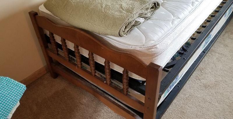 Nice standard twin bed with trundle underneath - also good condition and very clean. Solid wood headboard/footboard. Comes with all you see here - coverlet and sham. Great for a kid's room or guestroom. Note: The set is UPSTAIRS. You will have to take it apart and move it yourself.