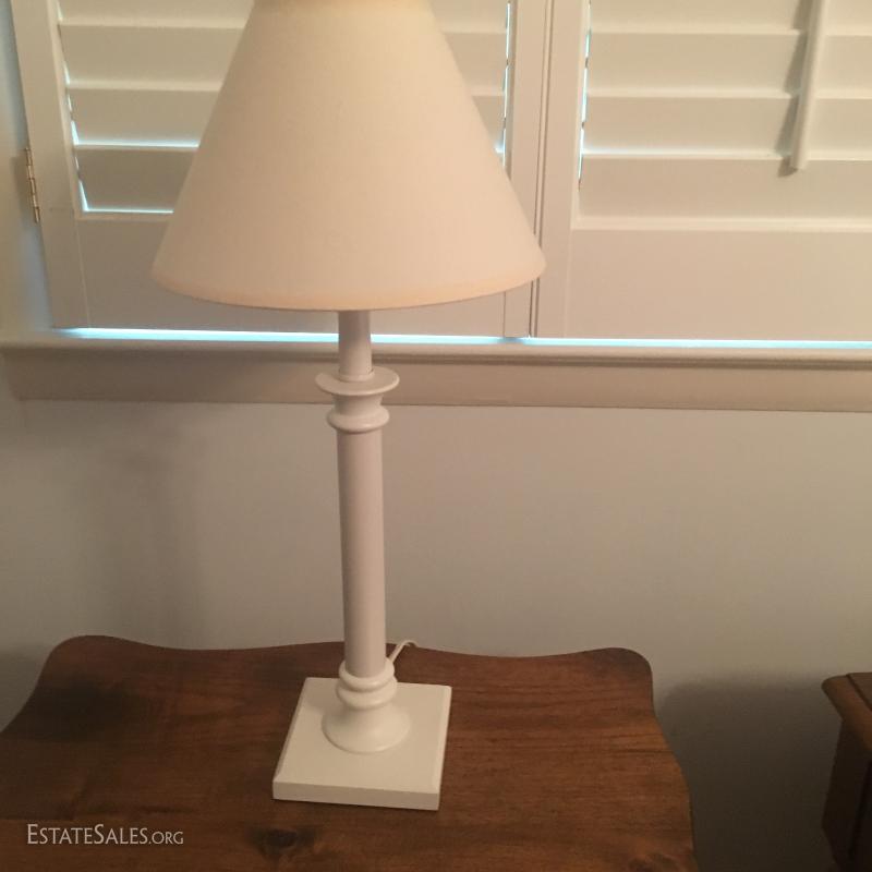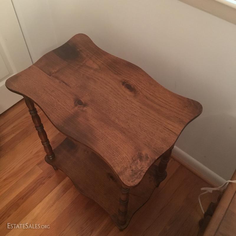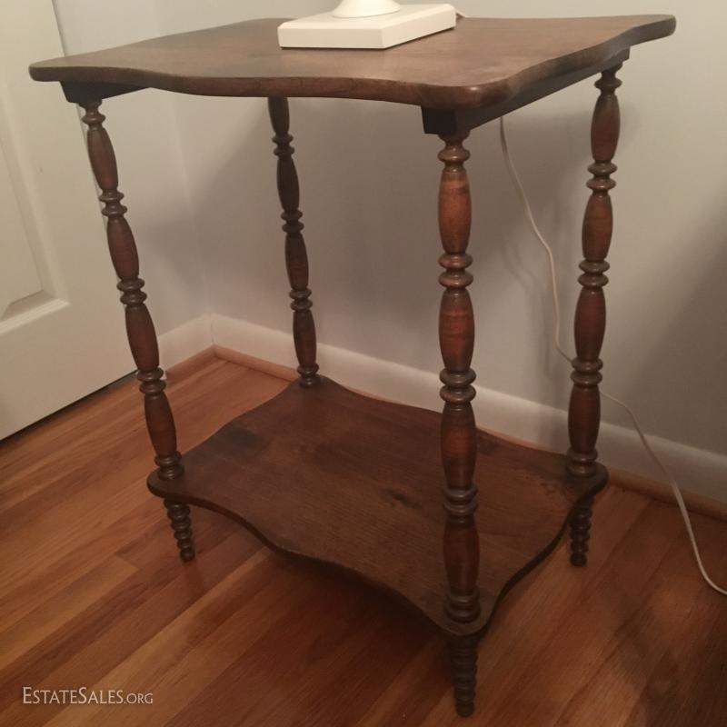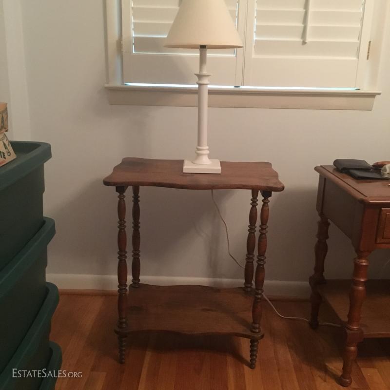 Small wood table with low shelf and white lamp. Table measures 22" x 14" x 26" and lamp is 23" tall. This lot is available for local pick up in Asheville, NC