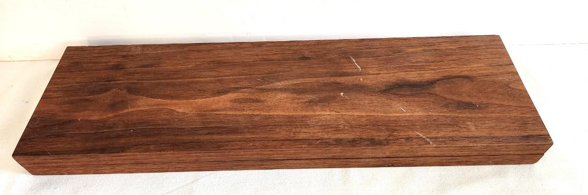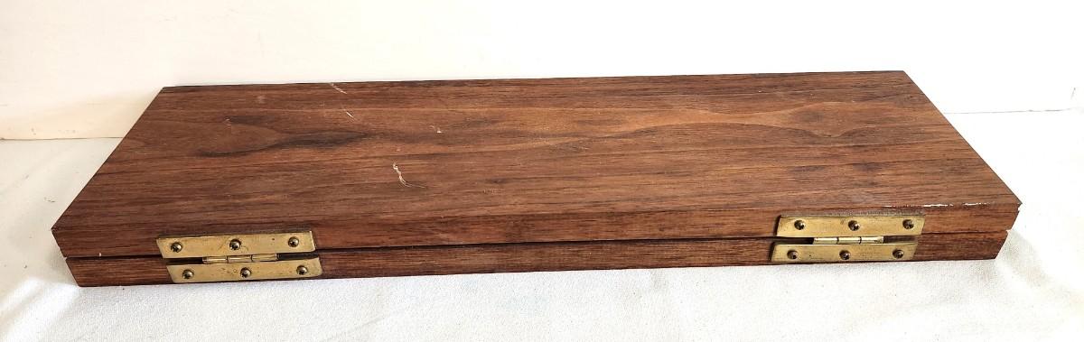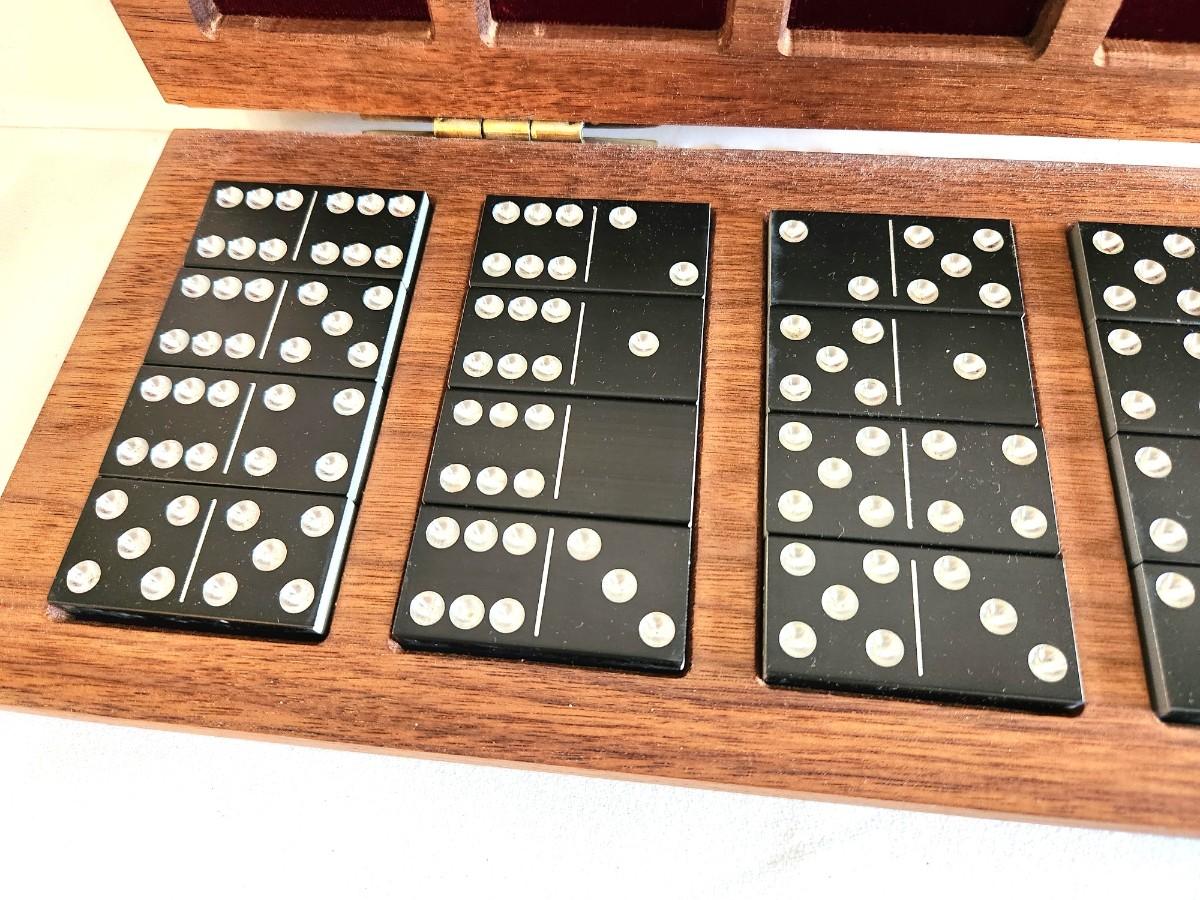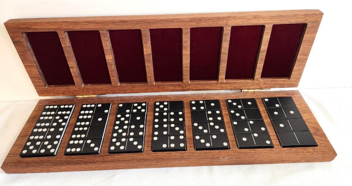 This set is a real beauty - 1960's Double Six Domino Set in Hinged Wooden box - the tiles are aluminum - complete. Box is 19" x 5.5" and is lined with red velour.