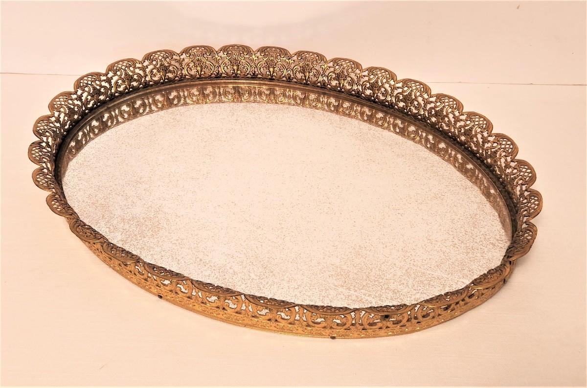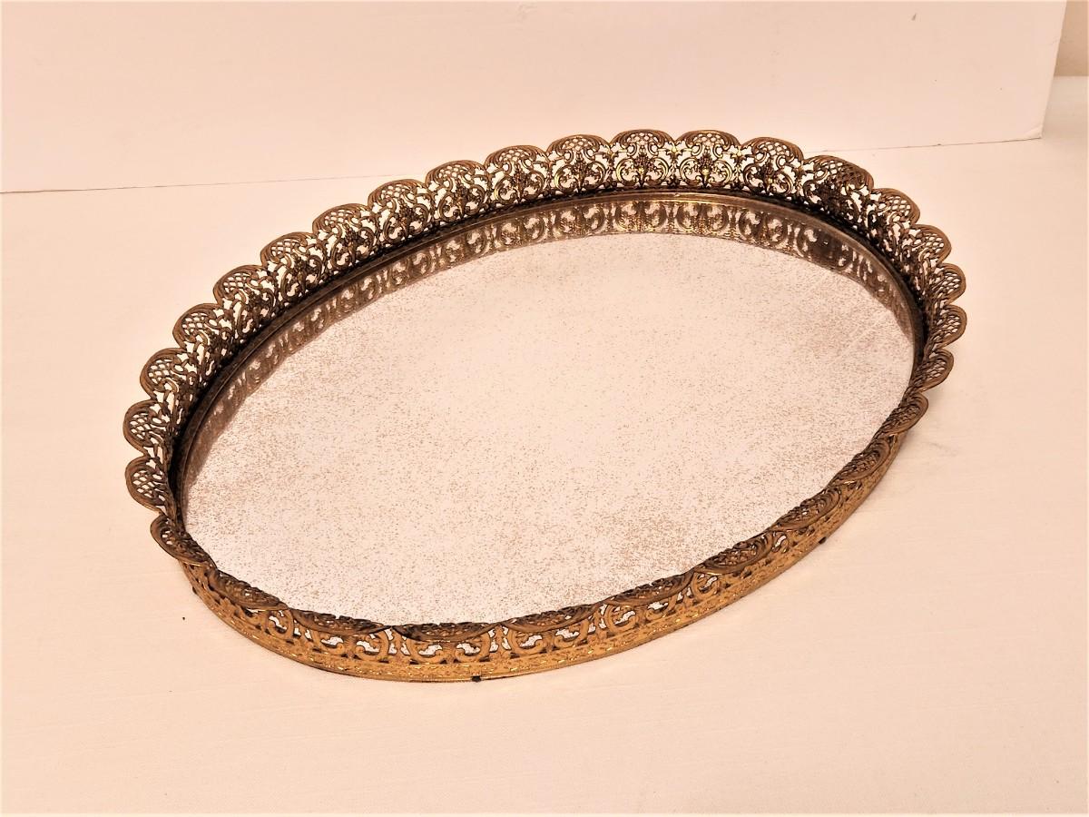 Vintage oval shaped mirrored dressing table tray - gold tone gallery edging with gold flecks in the mirror. Good vintage condition. 17" x 13".