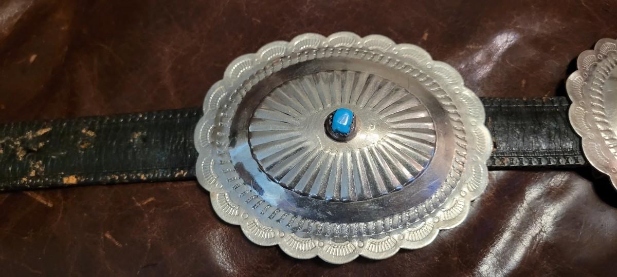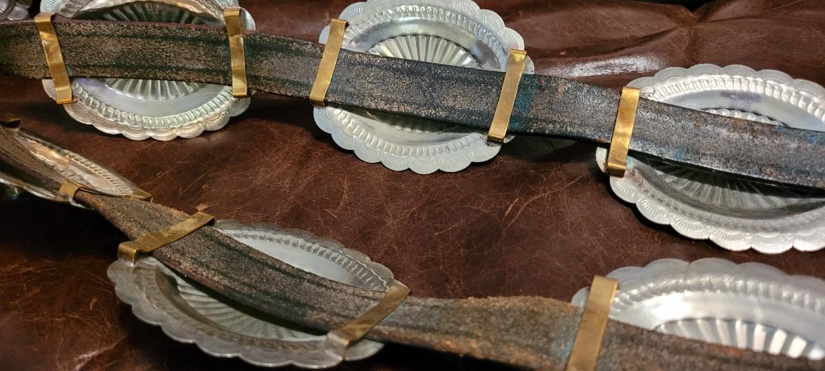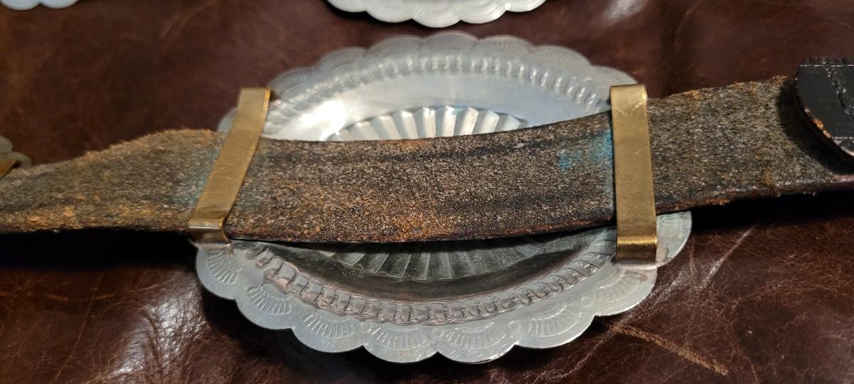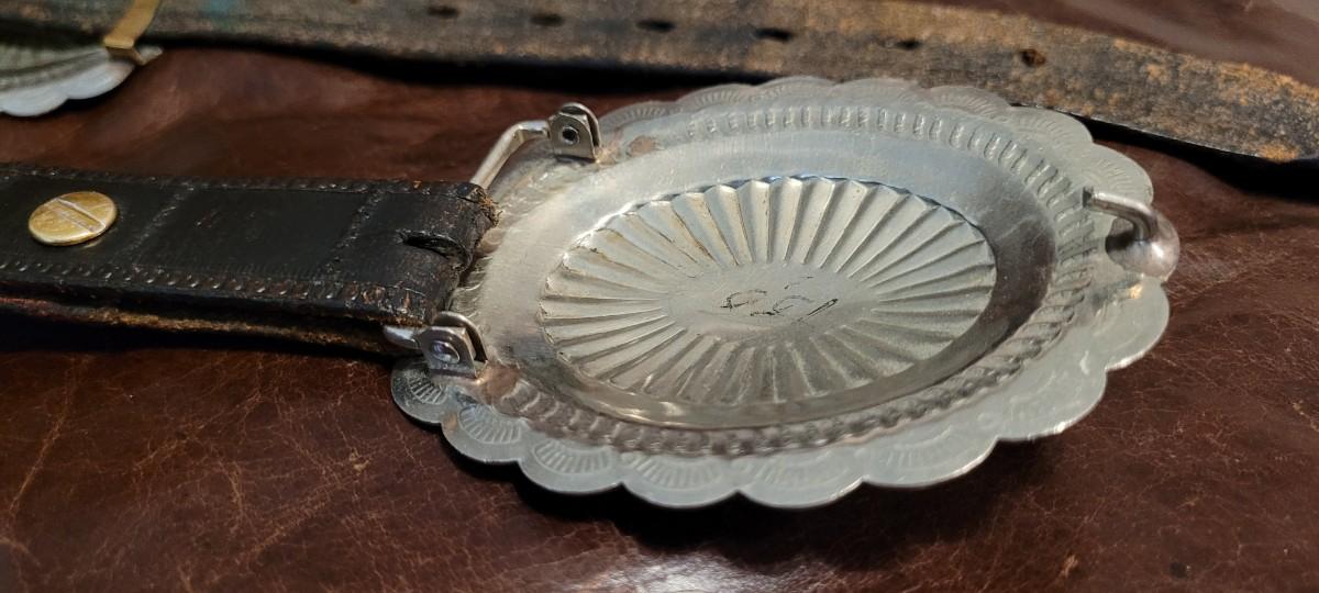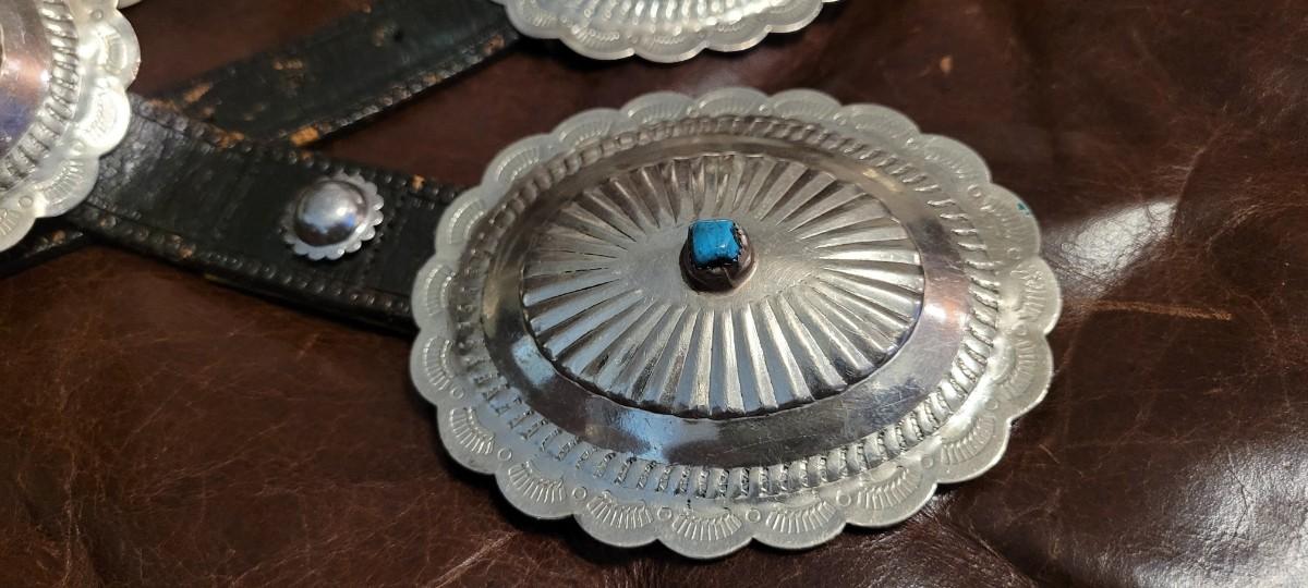 Lot 111: Vintage Native American Sterling Silver Concho Buckle Set (7 total) with Leather Belt