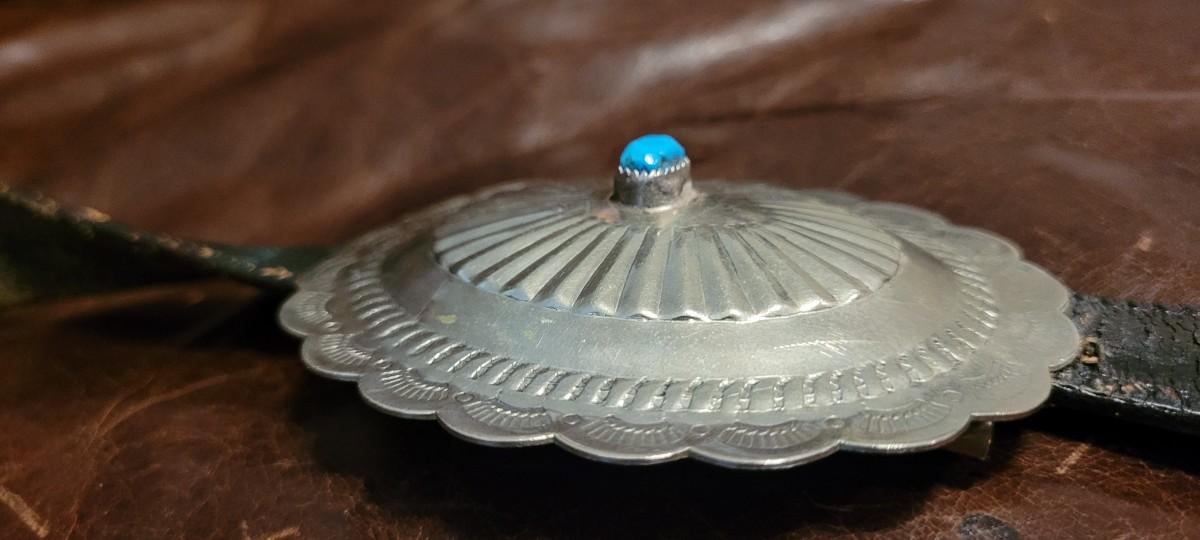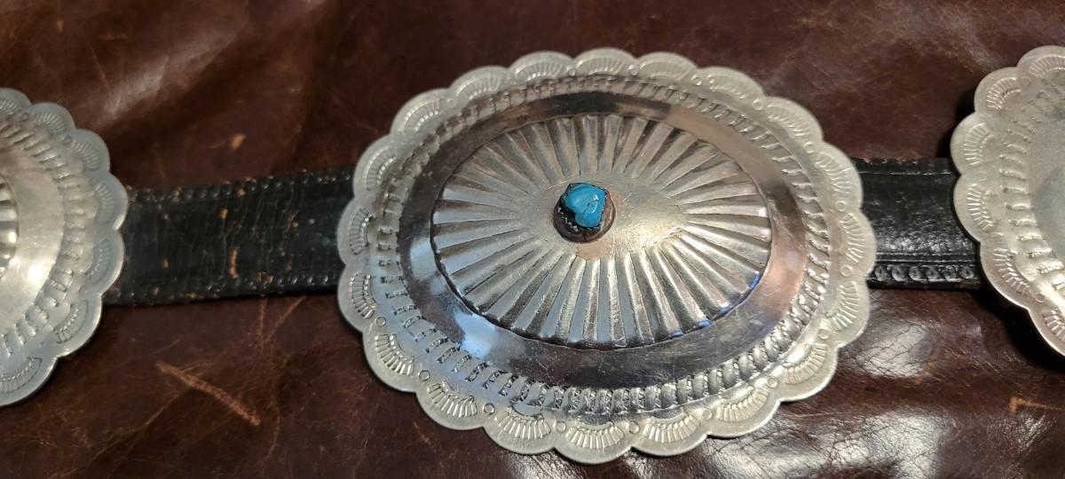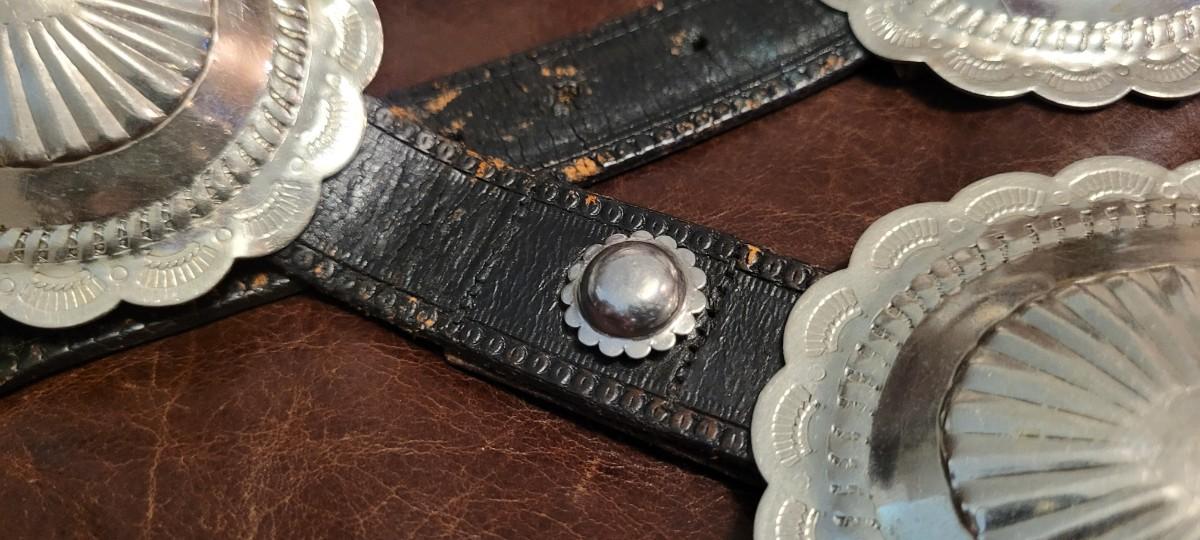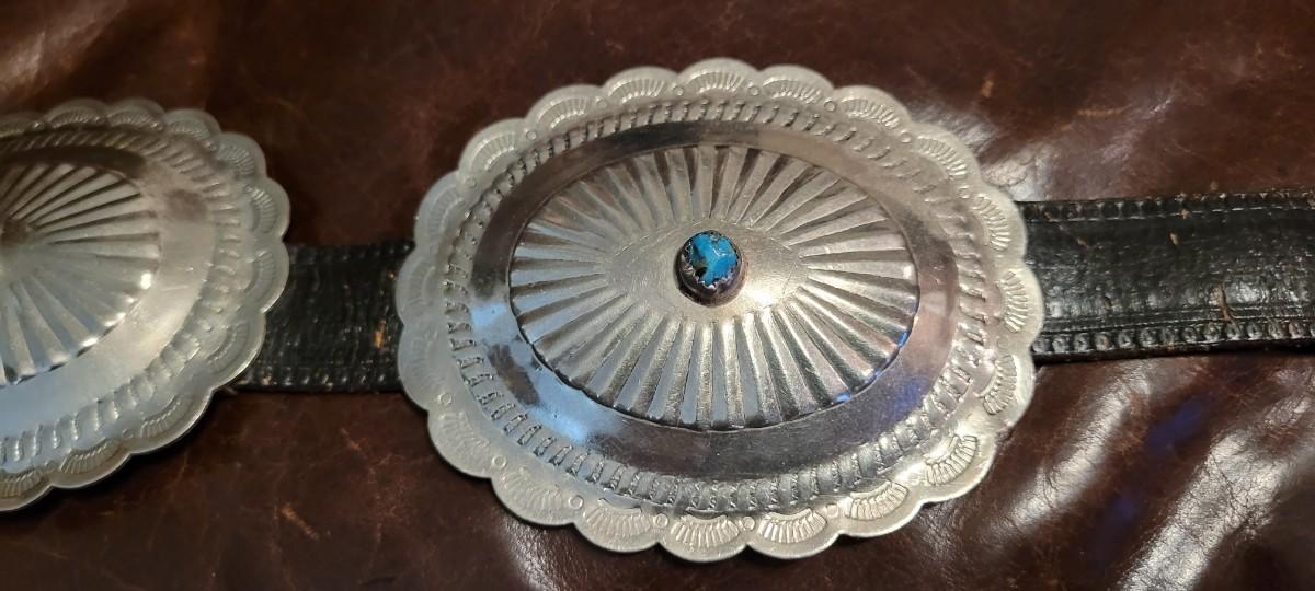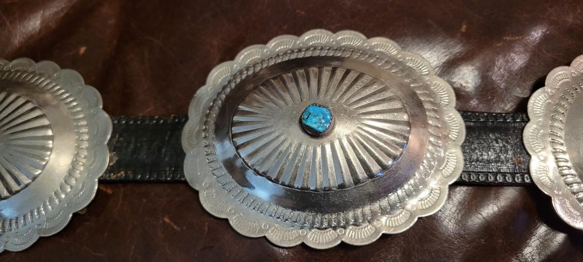 Lot 111: Vintage Native American Sterling Silver Concho Buckle Set (7 total) with Leather Belt