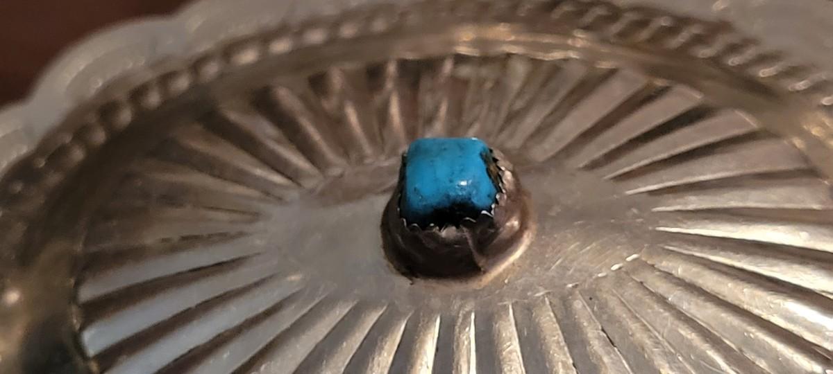 All (7) Handmade Artisan Conchos are shown. Each has a unique turqoiuse stone in the center with rays bursting outward in the design. A fine collector's piece. Belt is marked a Size 36 - about 41" from end to end not including Buckle Concho. Not marked