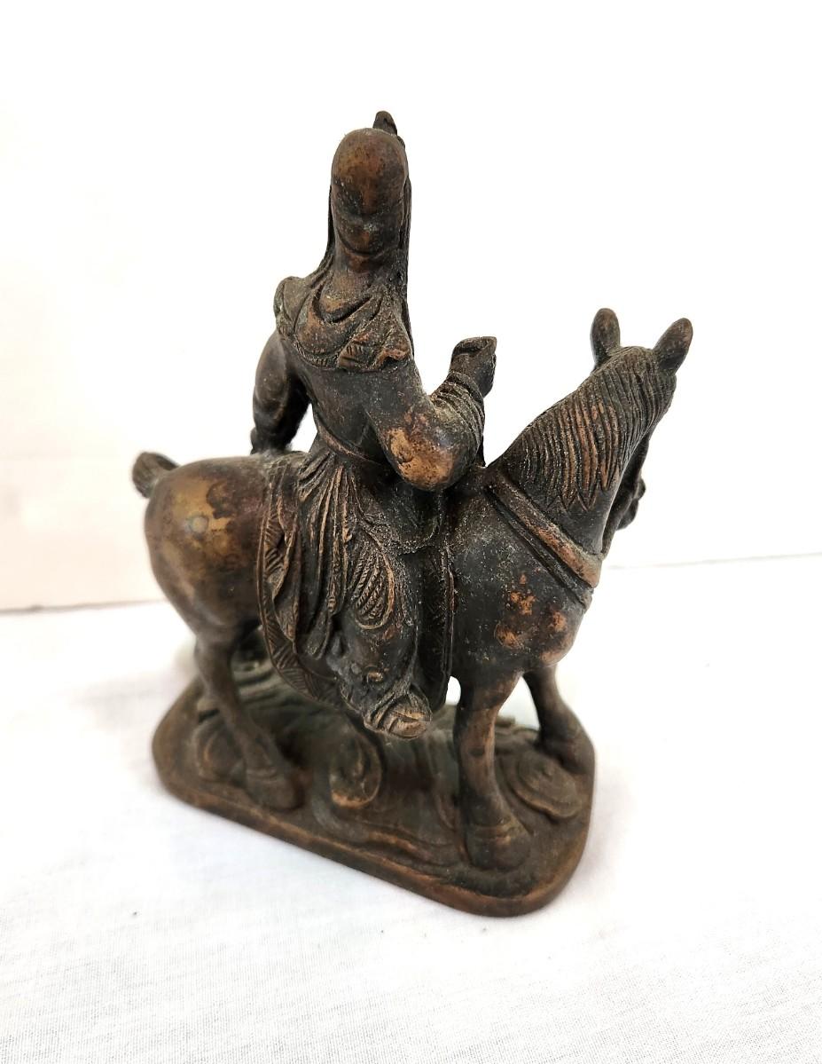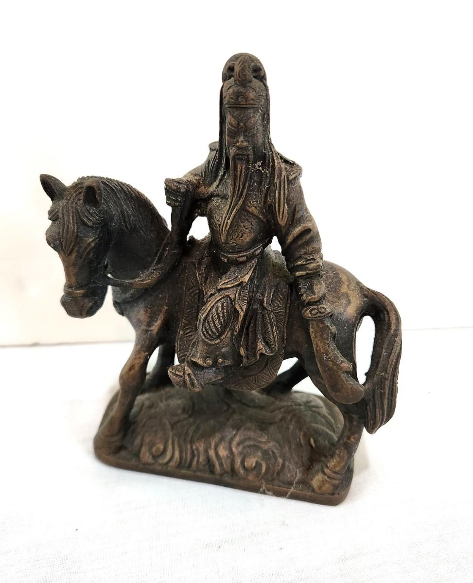 This figure is famous in Chinese mythology - character appears in the Story of the 3 Kingdoms. Warrior is riding the legendary horse SEKITOBA, who could run 1,000 miles in a day. 6.5" tall - good antique condition.