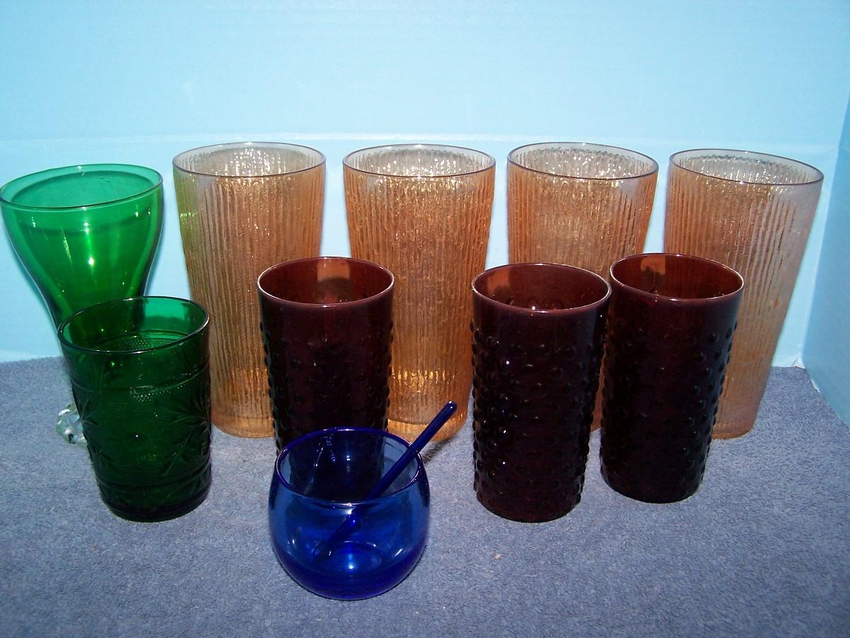 SOME WONDERFUL VINTAGE COLORFUL GLASSWARE!!! UNMARKED. LIGHT WEAR..