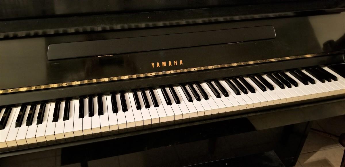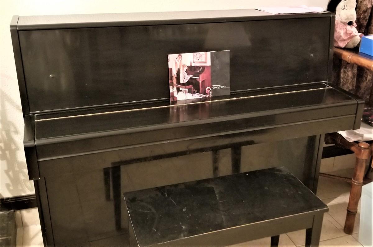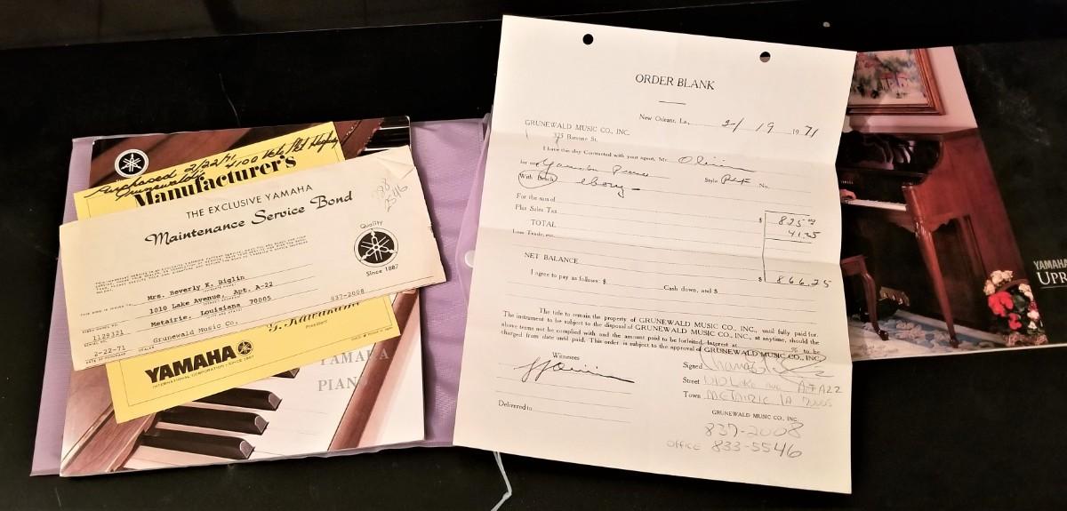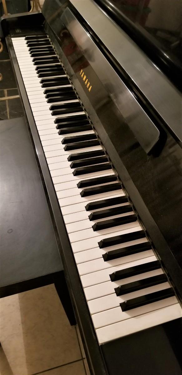 High quality YAMAHA piano, serial #1129321, purchased from Grunwald Piano in New Orleans in 1971. We have the original paperwork and receipts. Ebony Satin finish - needs a light tune - gently used - the cabinet actually looks great - bench shows some use. The last key on the left as a small chip on the side (as shown). Needs a light tune (pianos should be tuned anytime they are moved, so buyer would have that expense anyway). 45" tall, 59.5" wide, 23 5/8" deep, weighs 527 pounds. Your kid can learn to play in style! No signs of water damage, etc. Buyer is responsible for moving and loading this themselves - for a quality piano like this we recommend hiring a professional piano mover. Right inside front door, one small 5" step to go up.