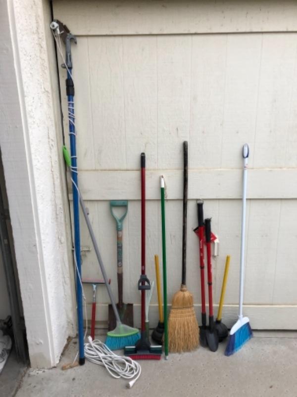 Lot 111. Yard tools“”brooms, squeegees, tree trimmer, small rake--WAS $55““NOW $41.25
