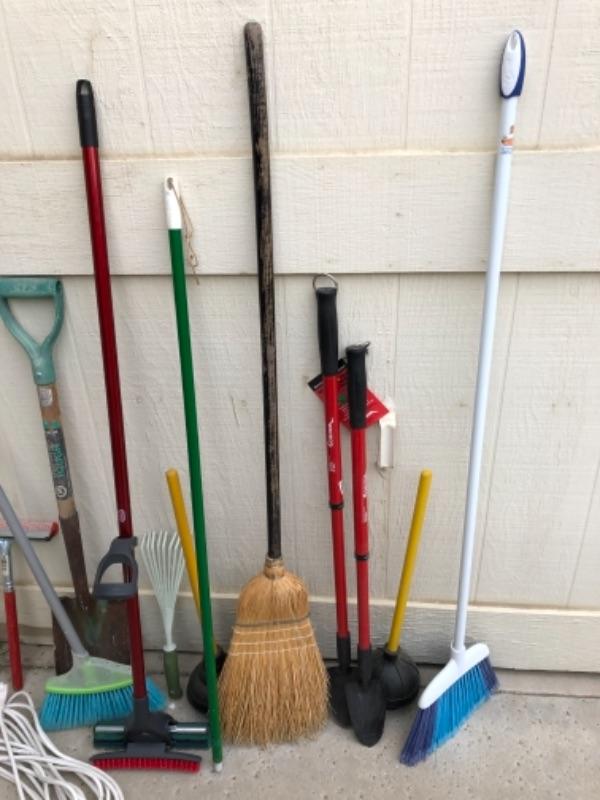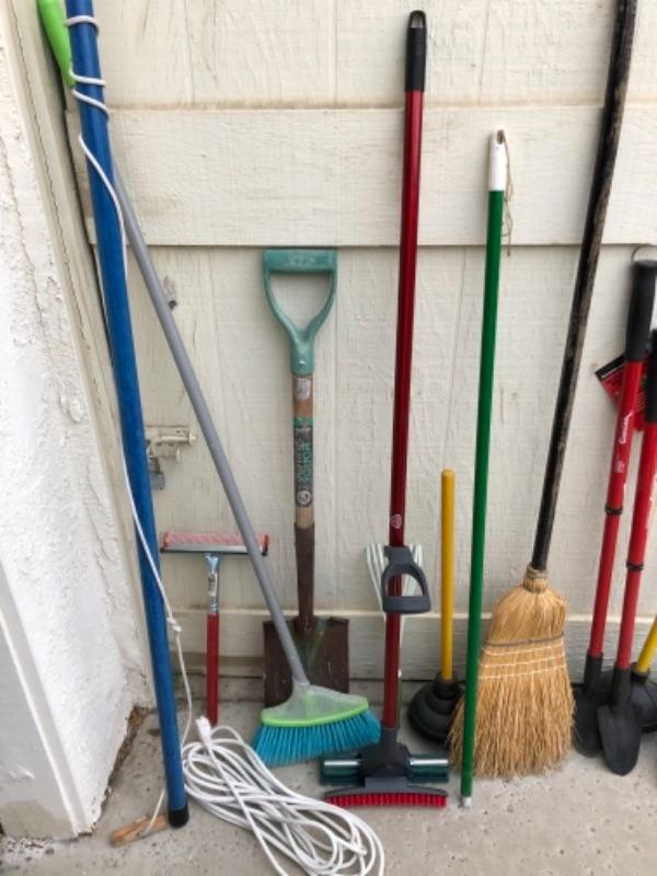 Lot 111. Yard tools“”brooms, squeegees, tree trimmer, small rake--WAS $55““NOW $27.50