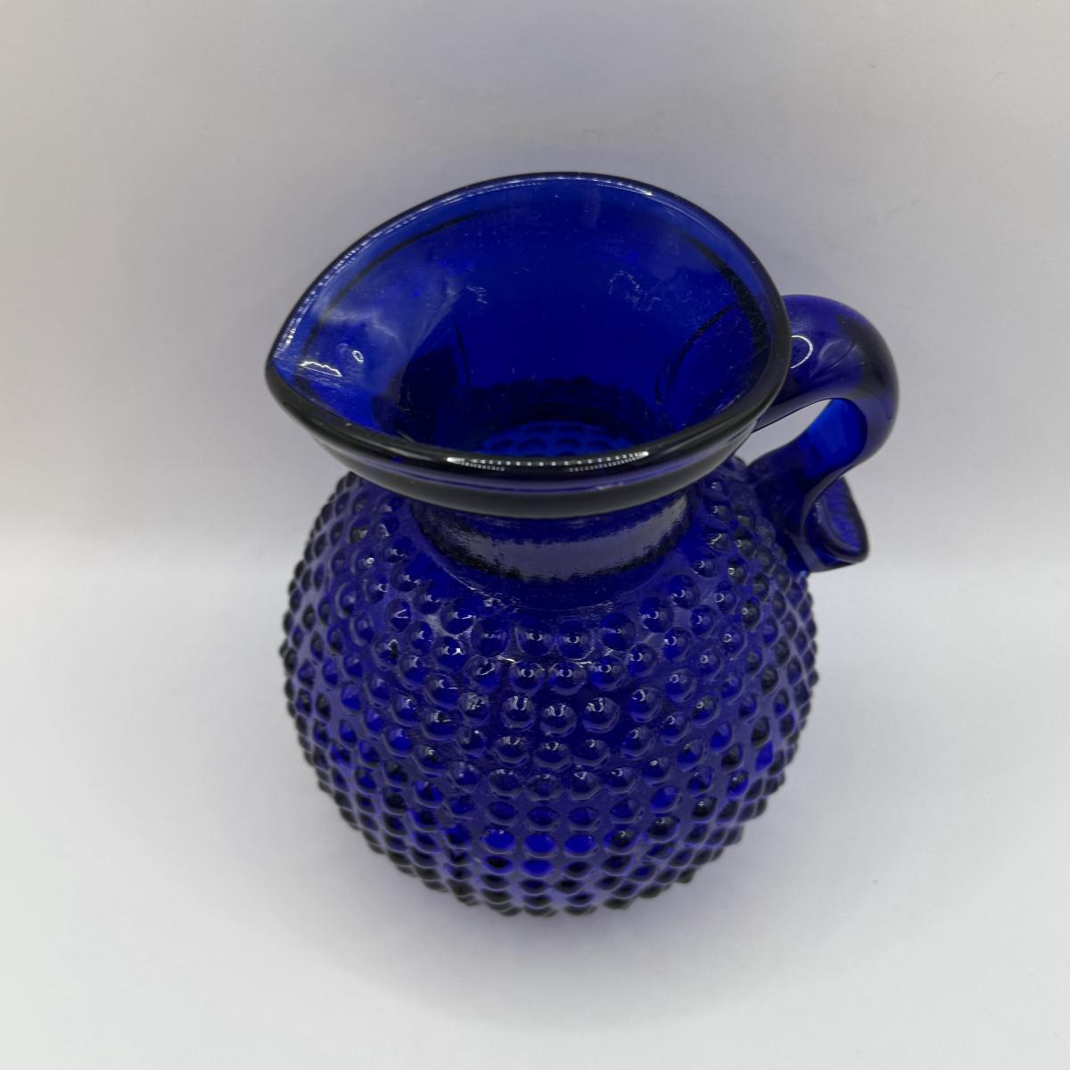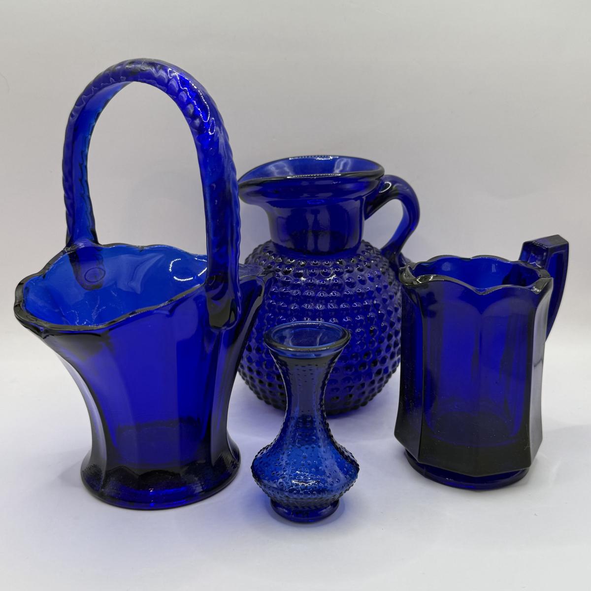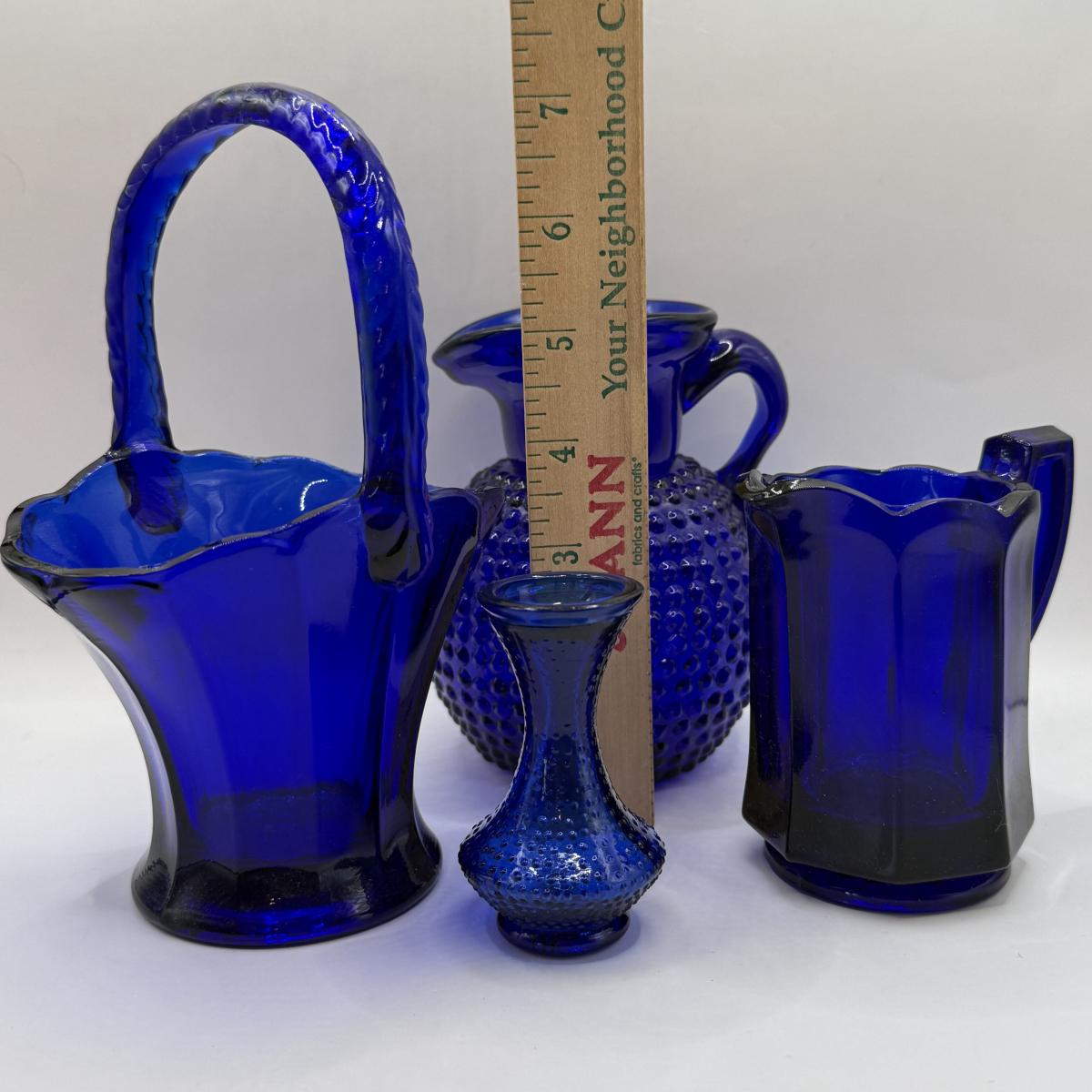 LOT 35F: Vintage Cobalt Blue Glass: Basket, Hobnail Pitcher & More
