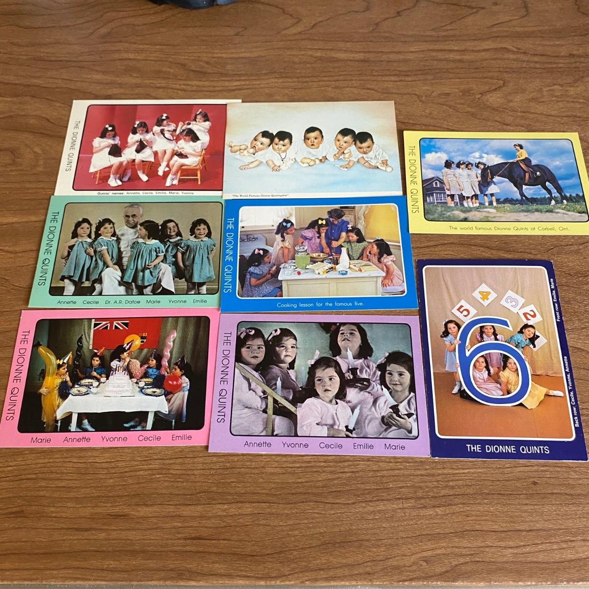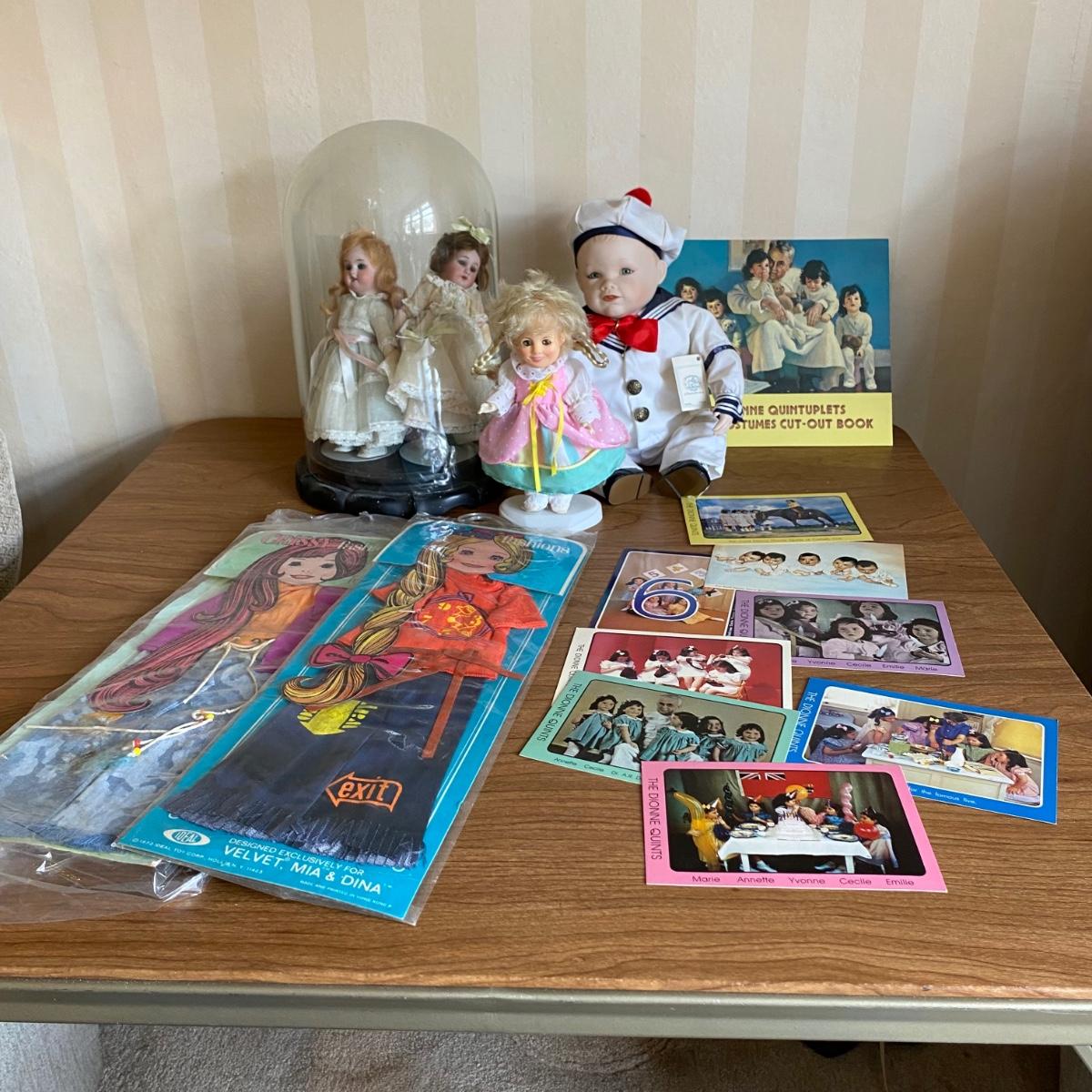 LOT 80F: Chrissy Doll Clothes, Dionne Quntuplets Postcards, Paper Dolls and Costume Cutouts, and Small Vintage Dolls