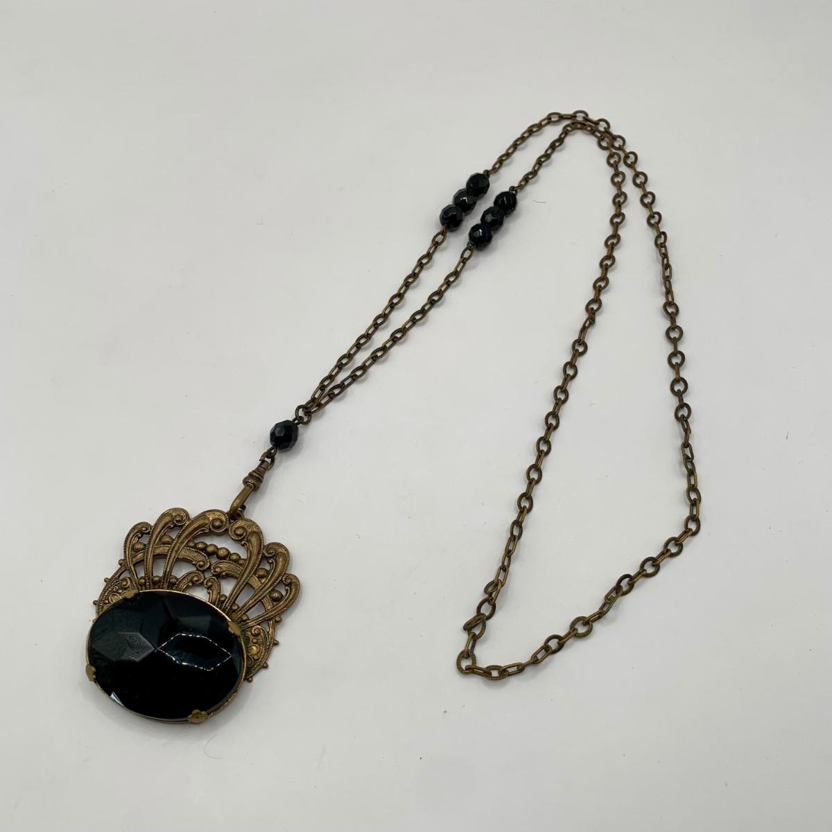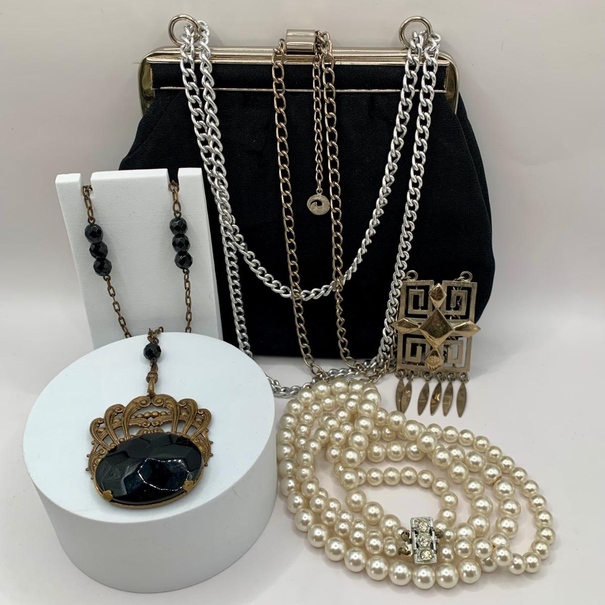 LOT 104 J: Vintage Statement Necklaces & Black Purse; Faux Pearl, Silver Tone, & Brass Tone