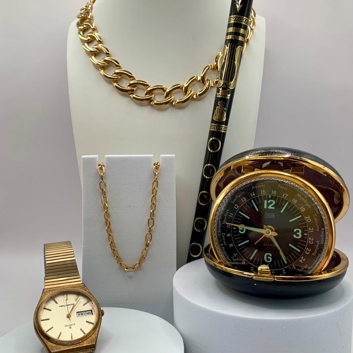 LOT 106 J: Gold Tone Collection; Monet Chain Necklace, Helbros Watch, RCA Elgin Travel Clock, & More