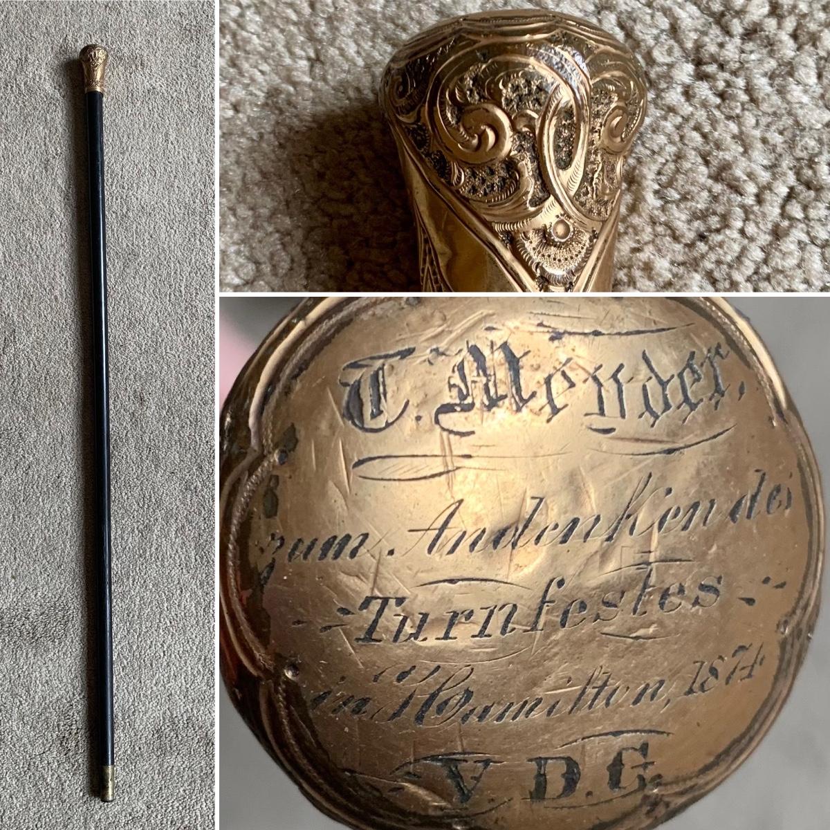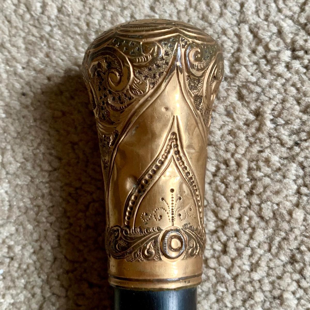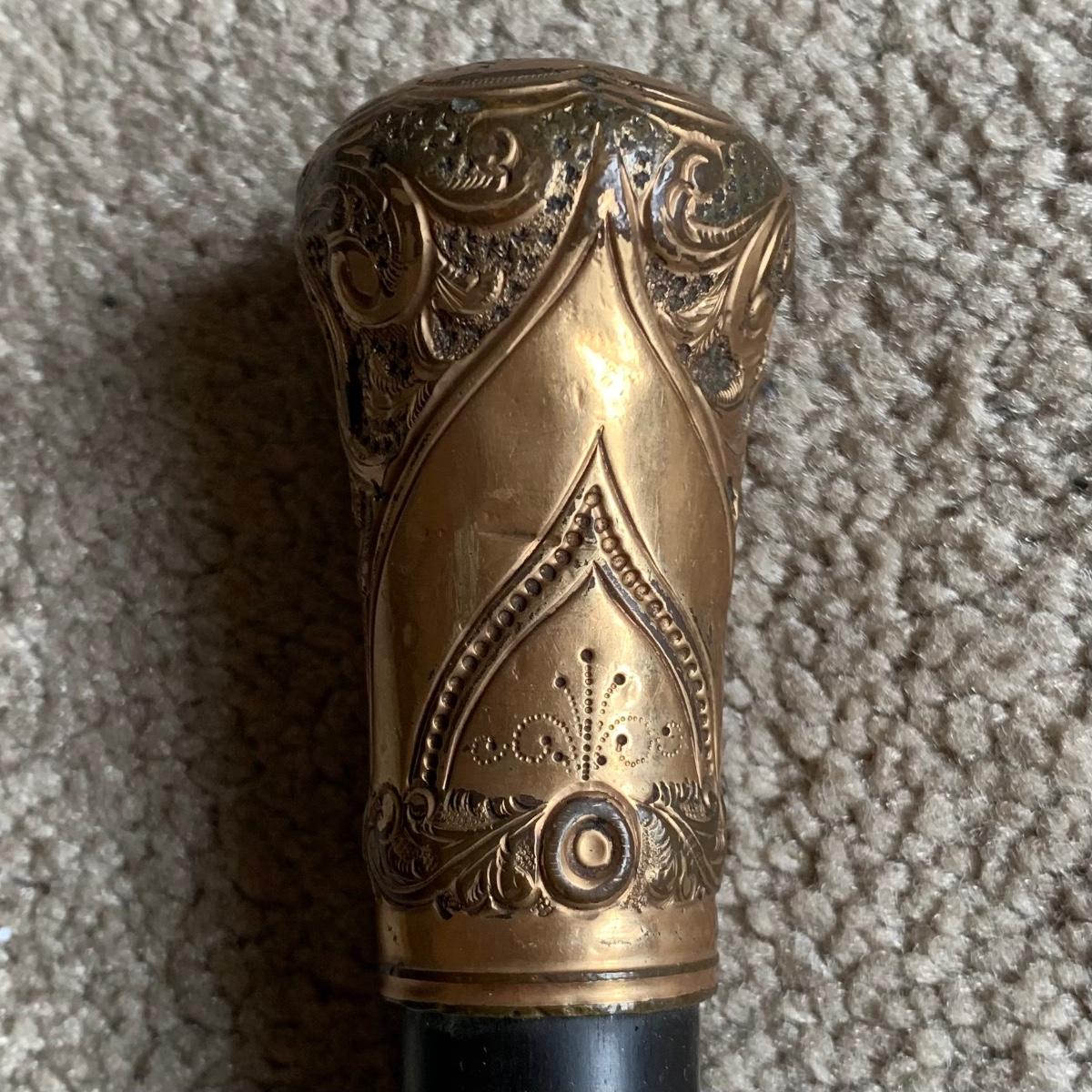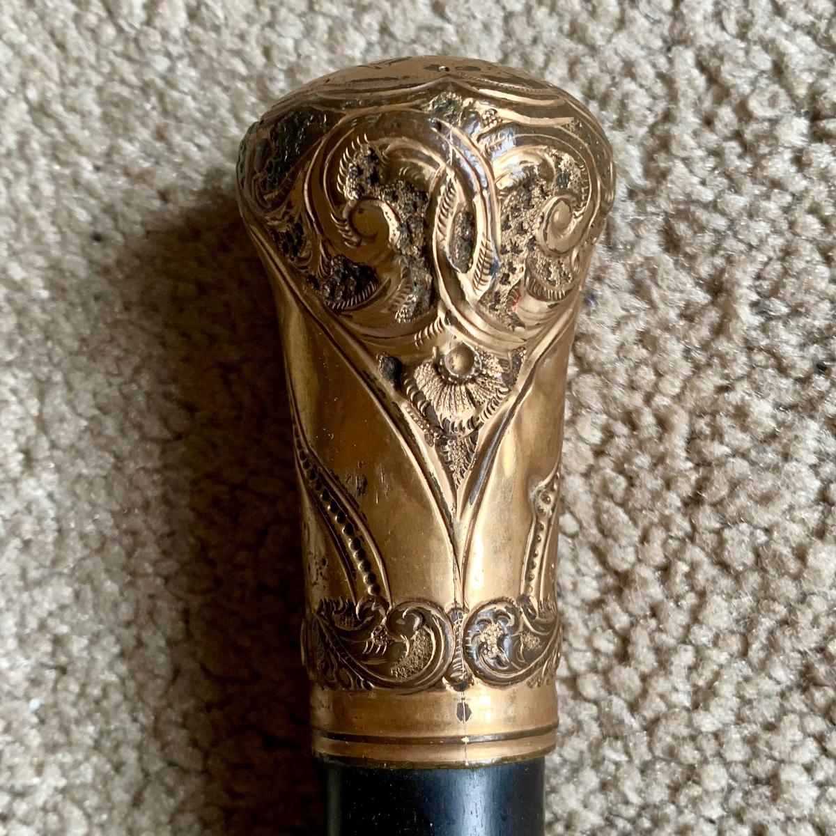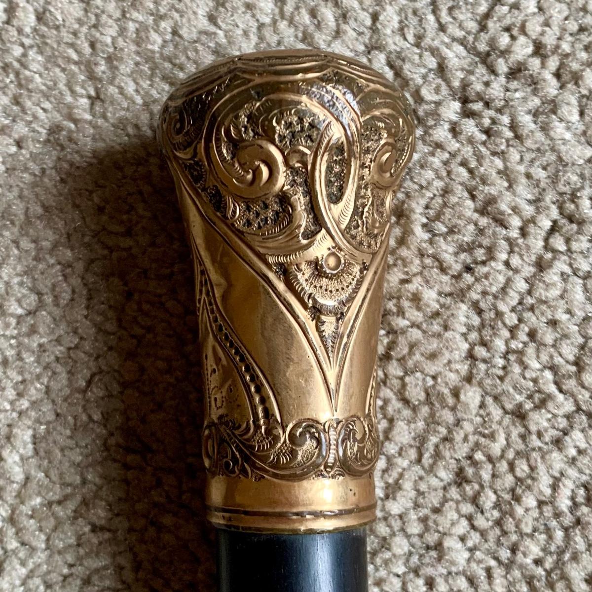 LOT 115 L: Antique 1874 Engraved Gold Plated Handle Walking Cane w/ Ebony Wood Shaft