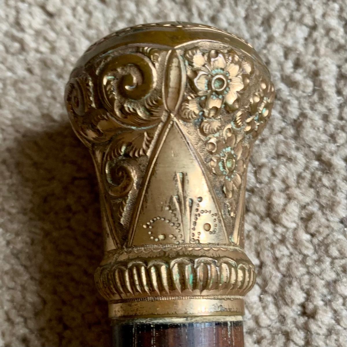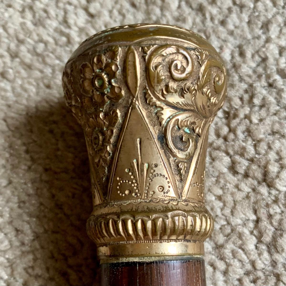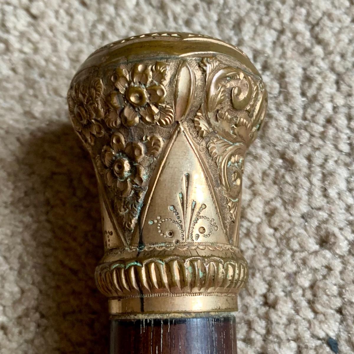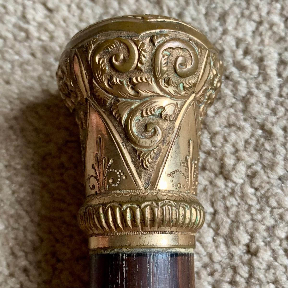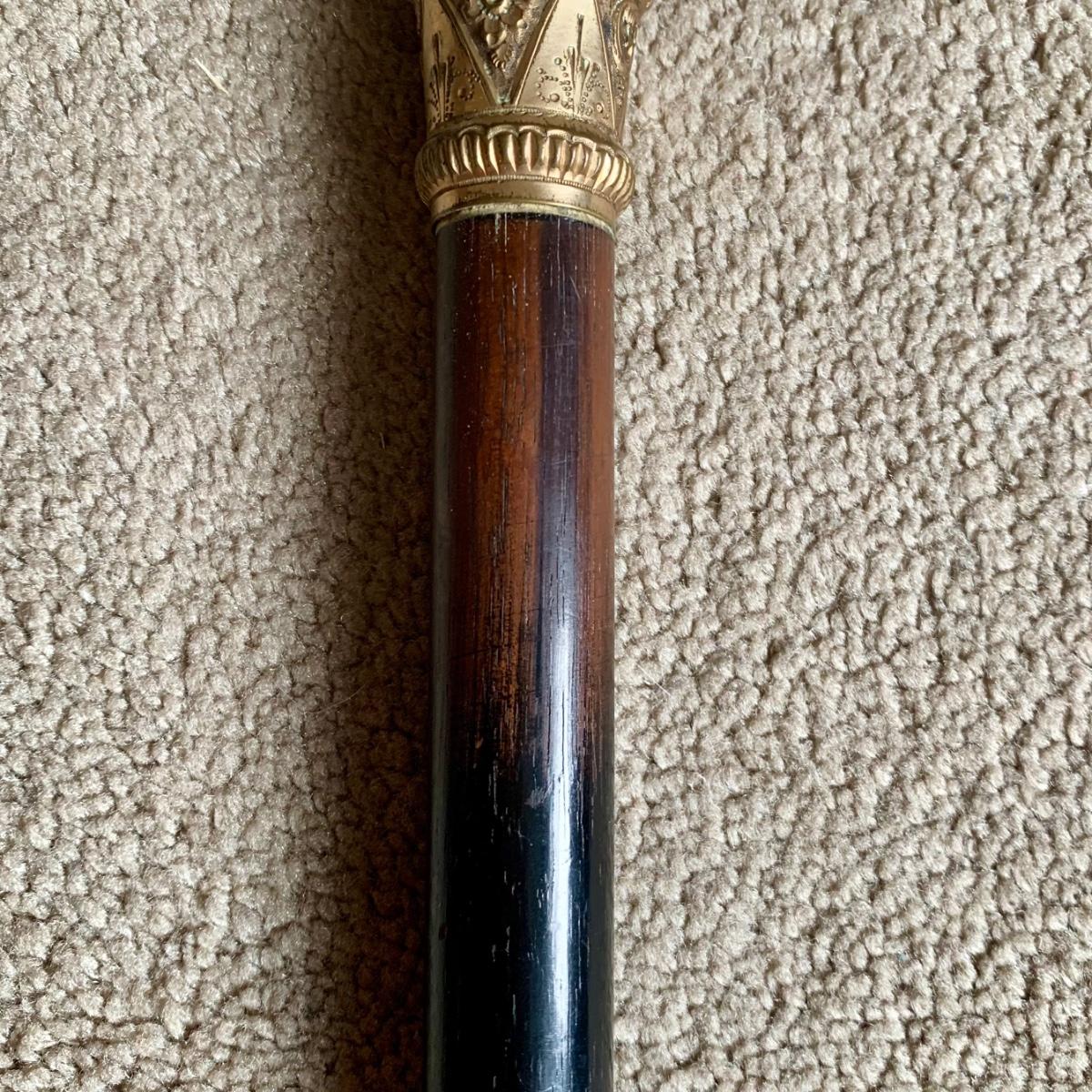LOT 116 L: Antique 1890 Gold Plated Engraved Handle Walking Cane w/ Ebony Wood Shaft
