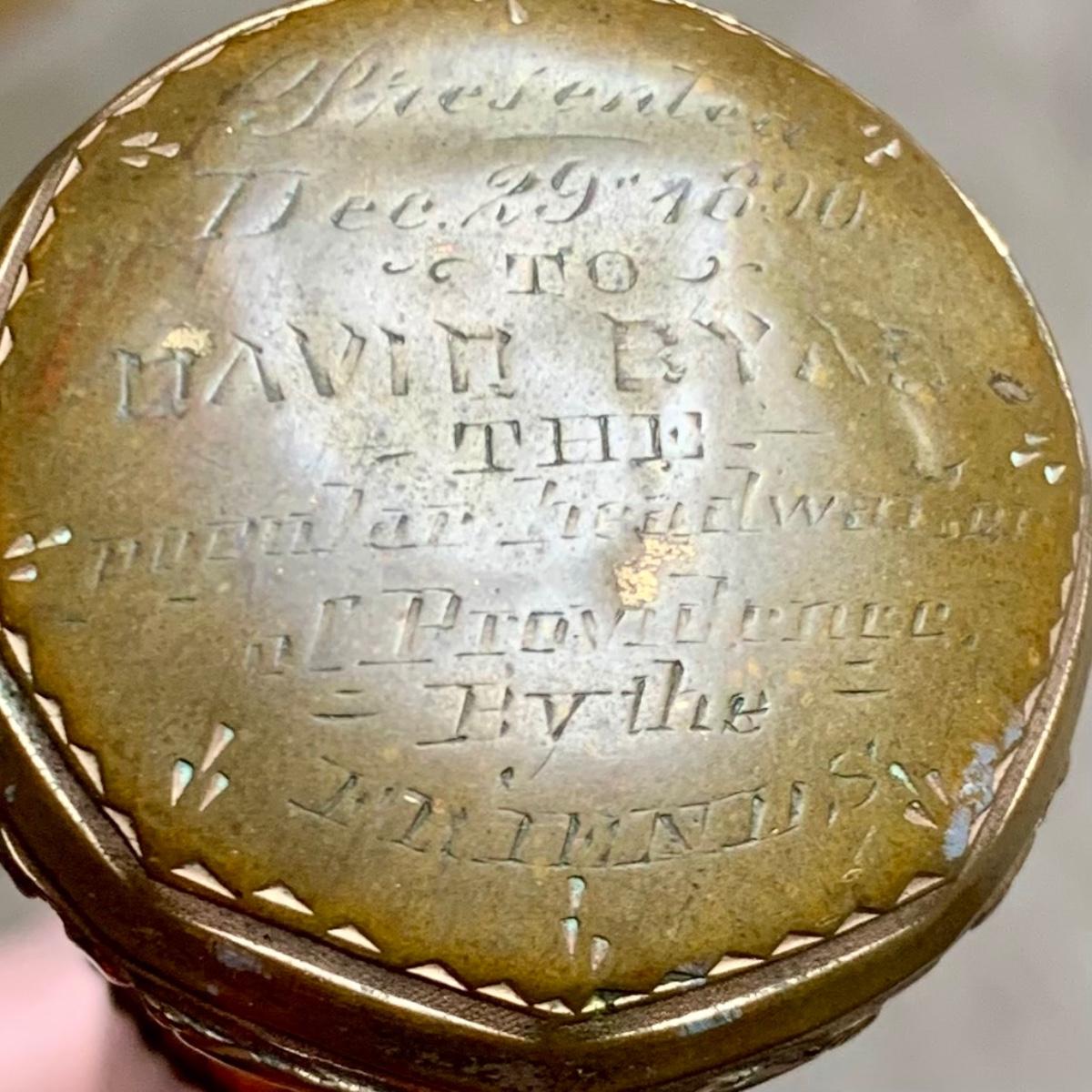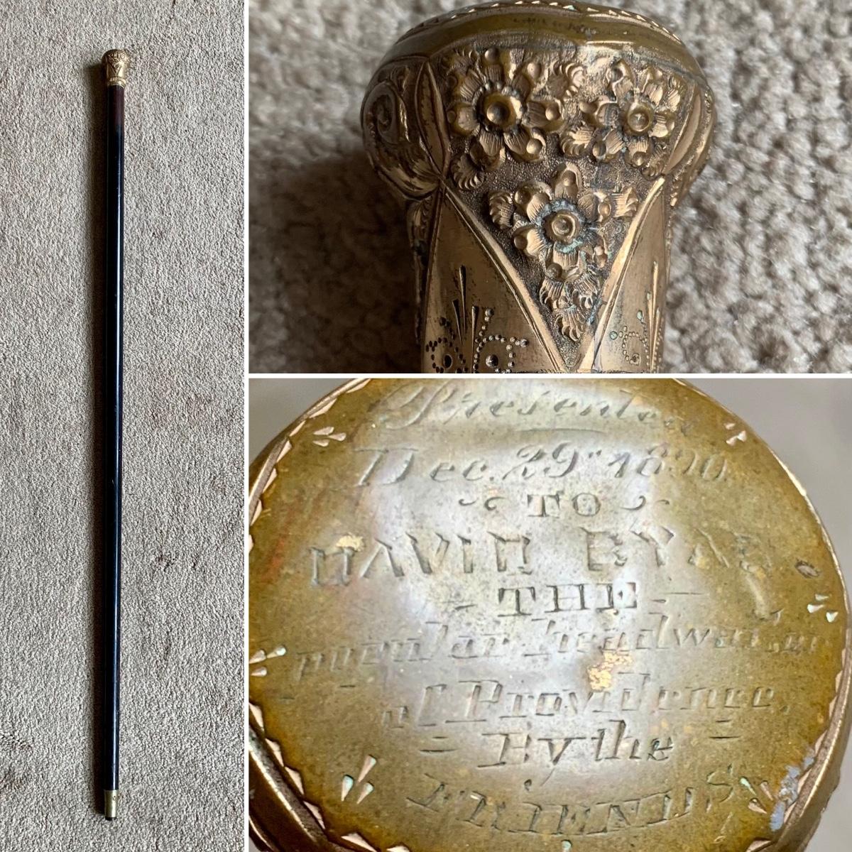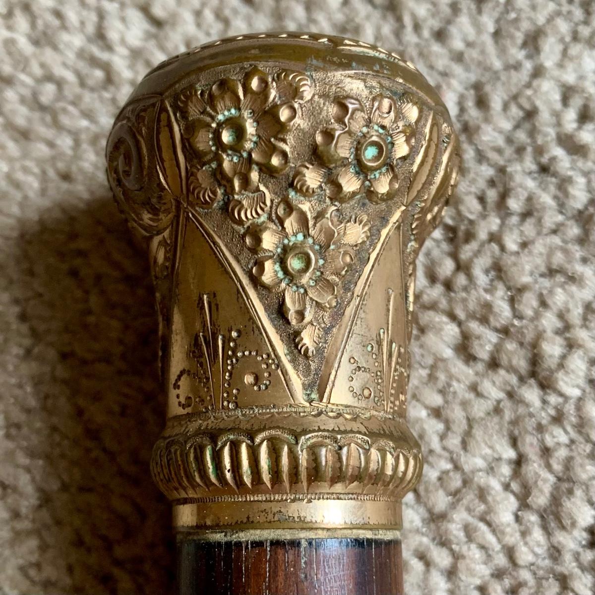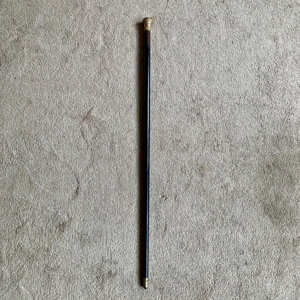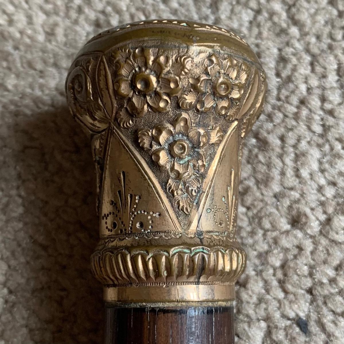 LOT 116 L: Antique 1890 Gold Plated Engraved Handle Walking Cane w/ Ebony Wood Shaft