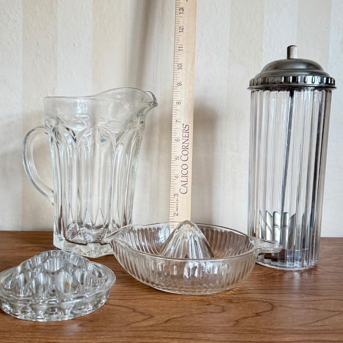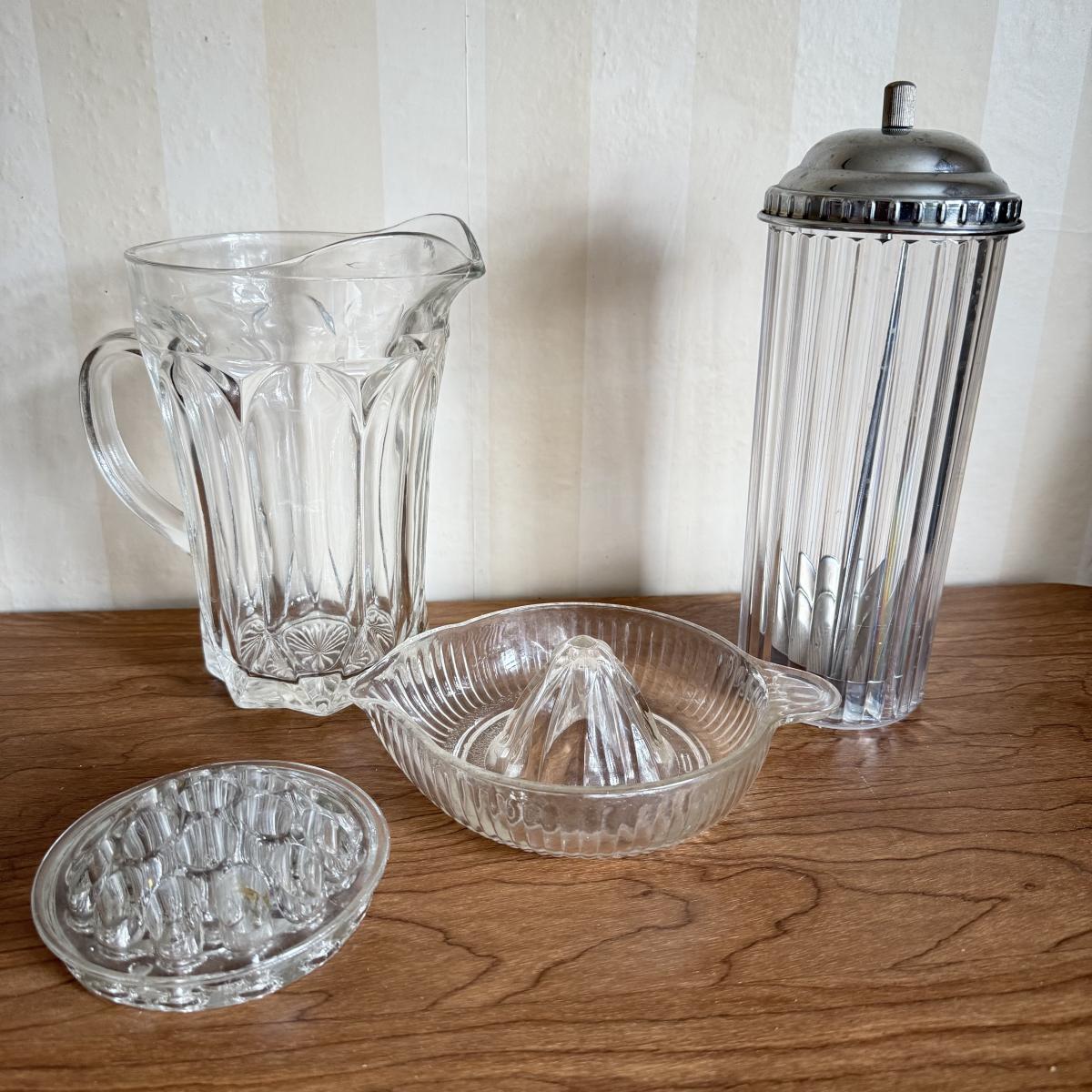 LOT 133K: Glass Collection: Straw Dispenser, Juicer, Flower Frog & Pitcher